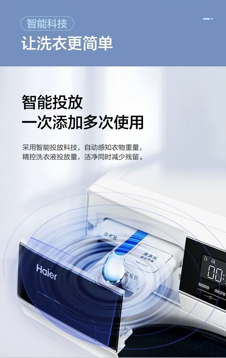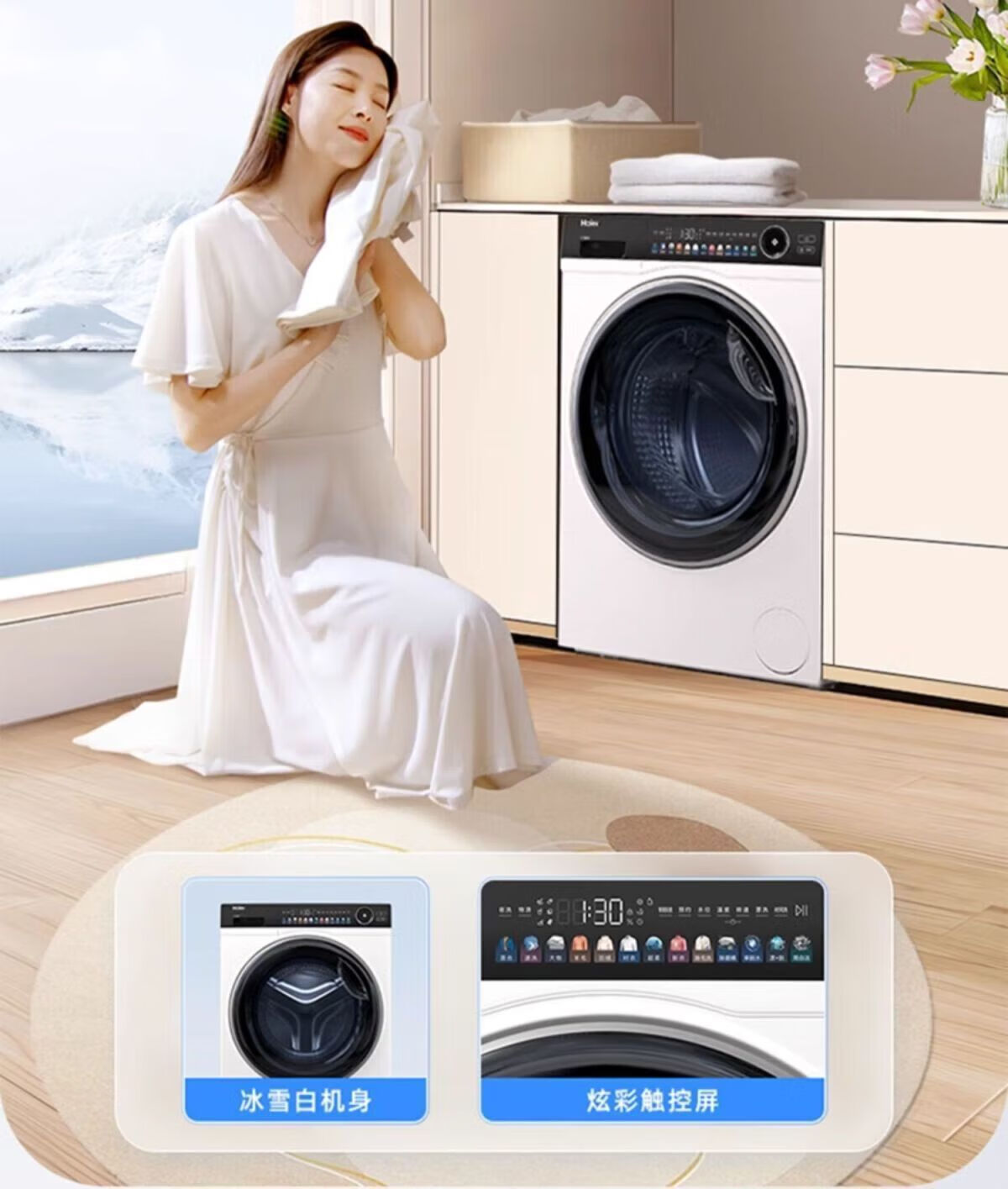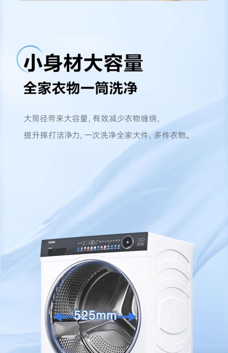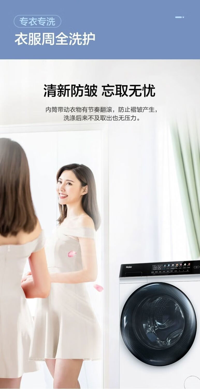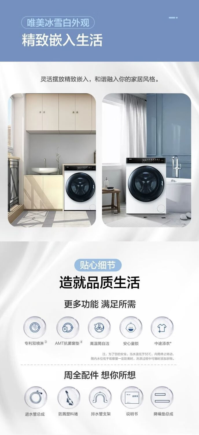 海尔超薄嵌入智能投放大筒径顽渍洗巴氏除菌螨防皱羊毛羽绒滚筒洗衣机 XQG100-B12176WU1 雪山白