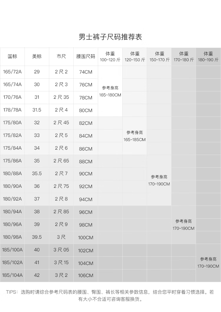China (cm) 160-165/84-86 165-170 / 88-90 167-172 / 92-96 168-173 / 98-102 170-176 / 106-110
