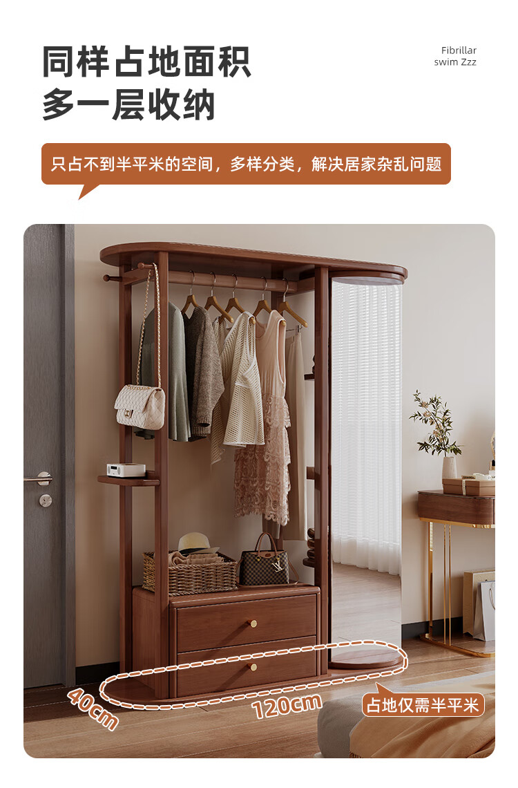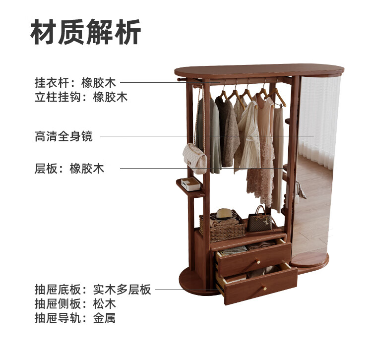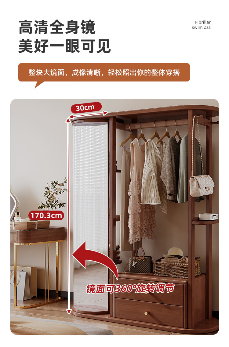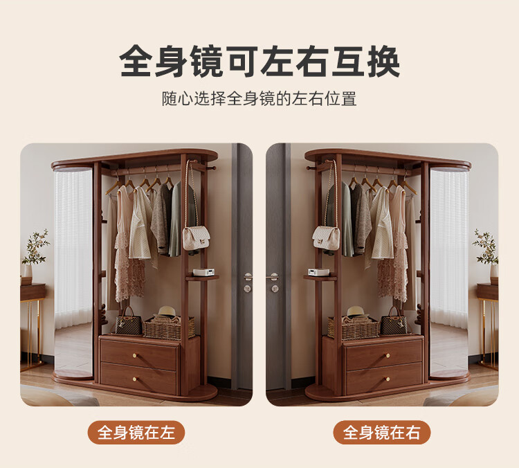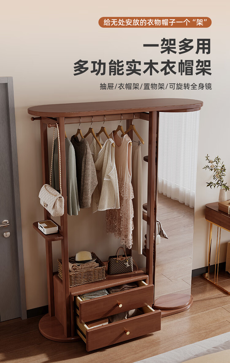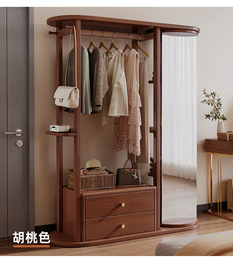 福岚实木衣帽架全身镜一体家用可旋转穿衣镜落地挂衣架卧室收纳置物架 胡桃色(送货上门包安装)