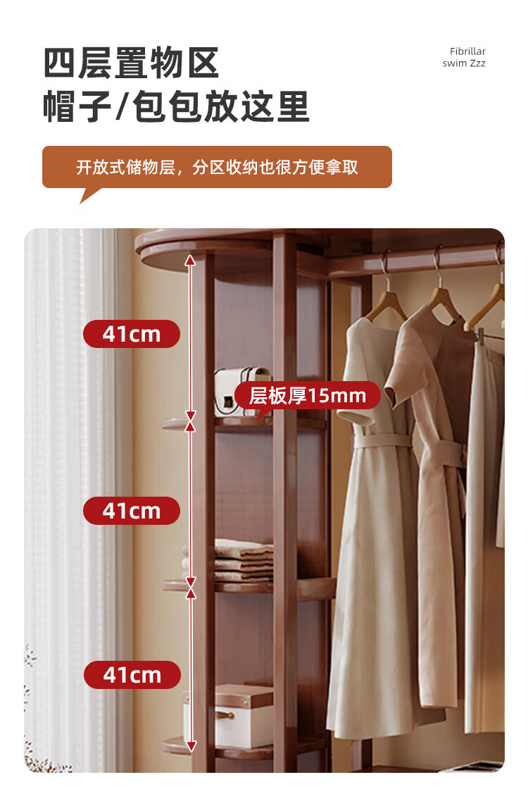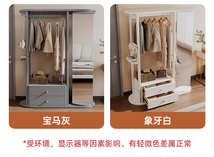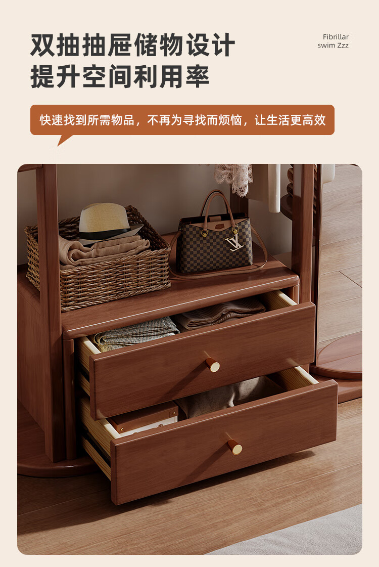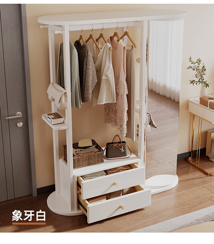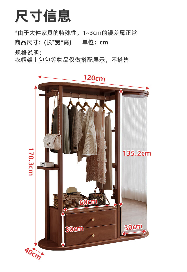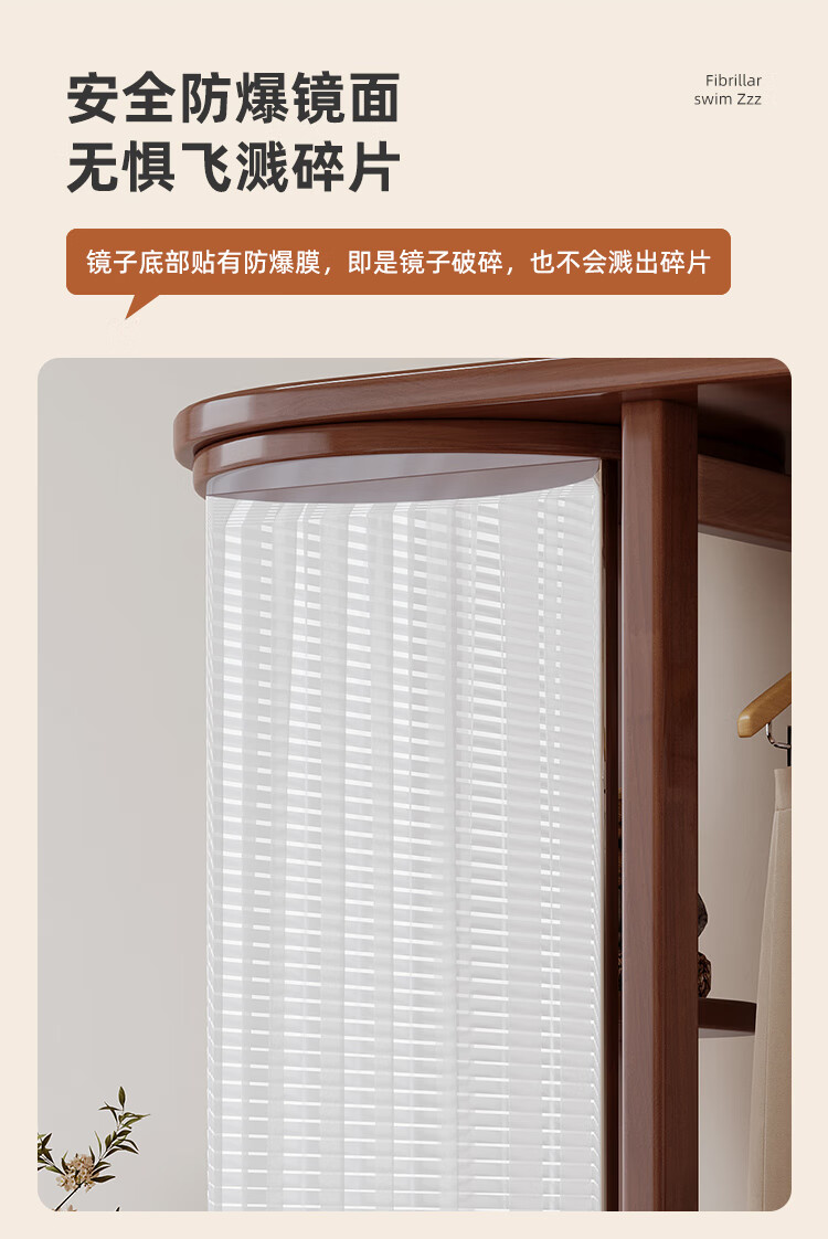 福岚实木衣帽架全身镜一体家用可旋转穿衣镜落地挂衣架卧室收纳置物架 胡桃色(送货上门包安装)