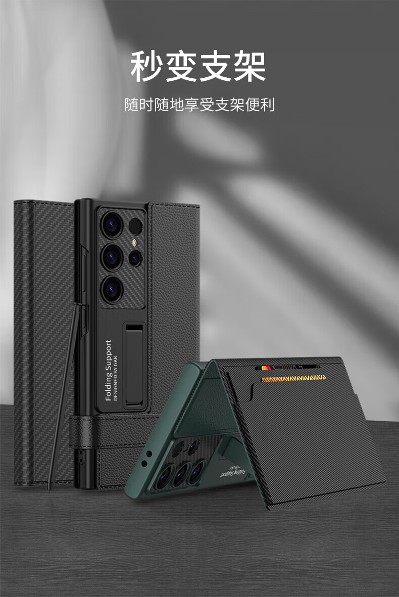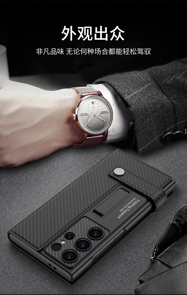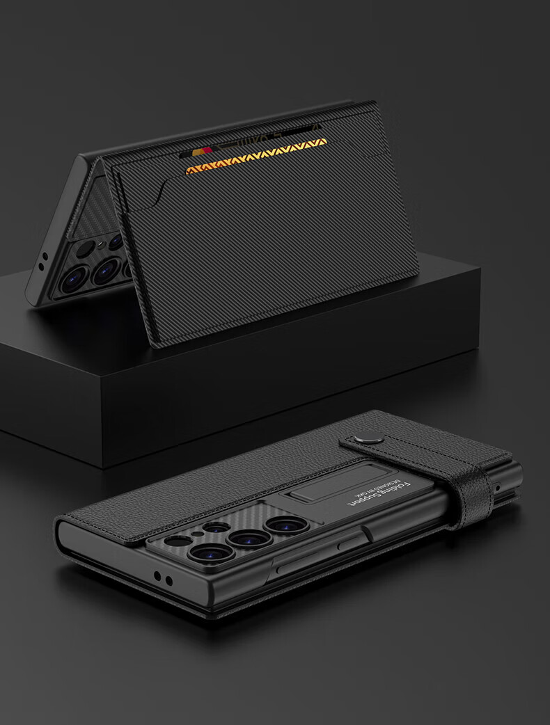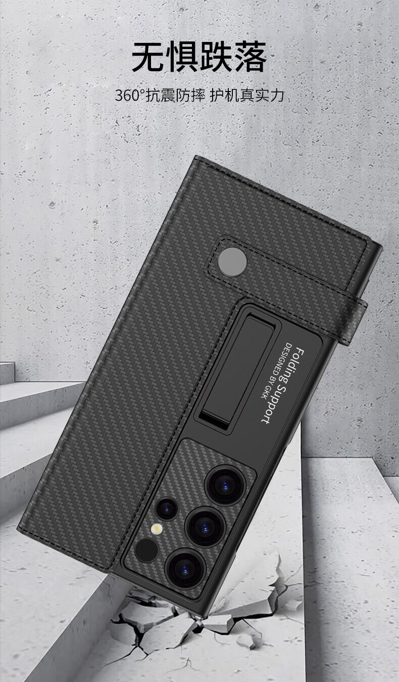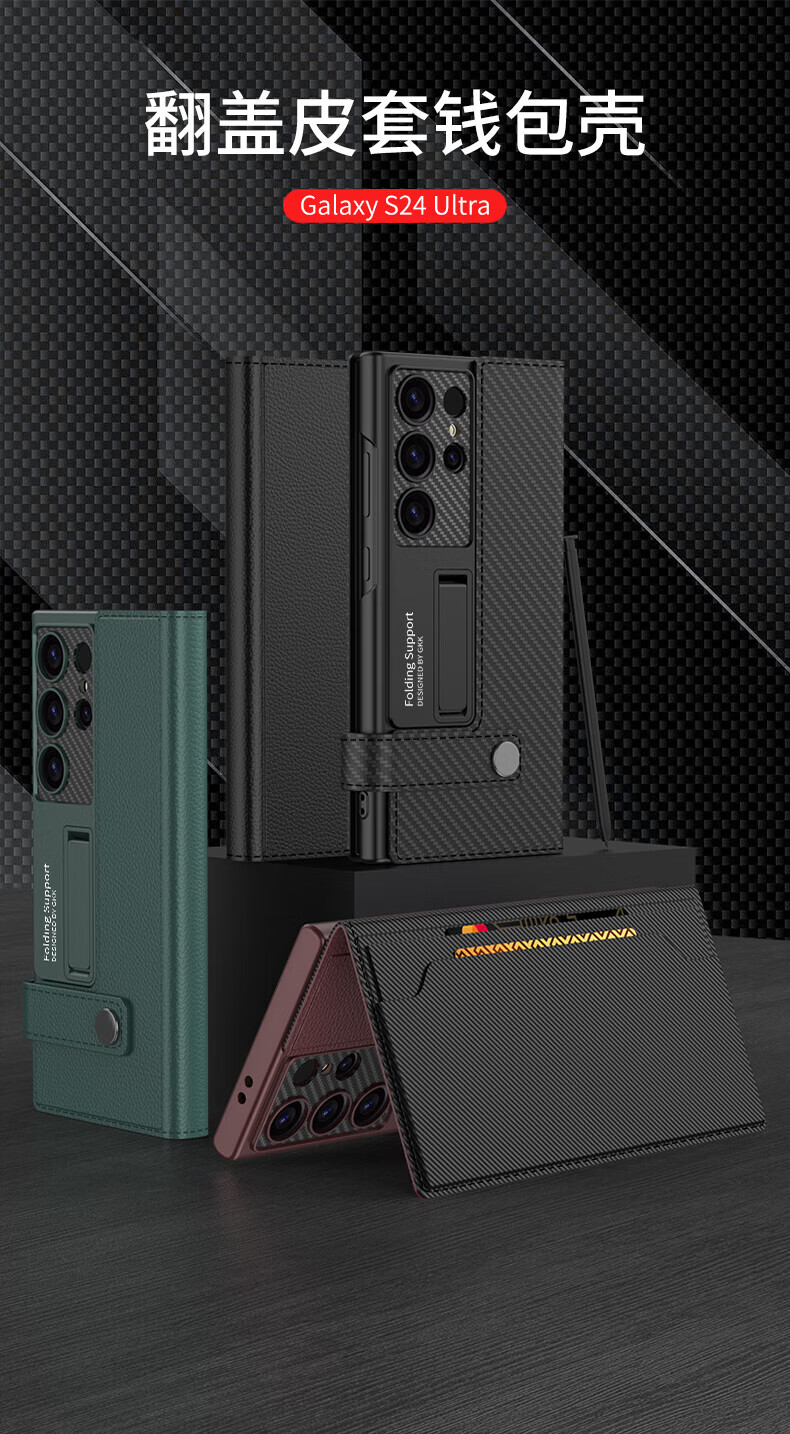 屏蓬 适用三星s24ultra手机壳翻盖s23ultra全包防摔保护套钱包款SM-S9280支架磁吸素皮皮套 碳纤纹黑 三星s24ultra