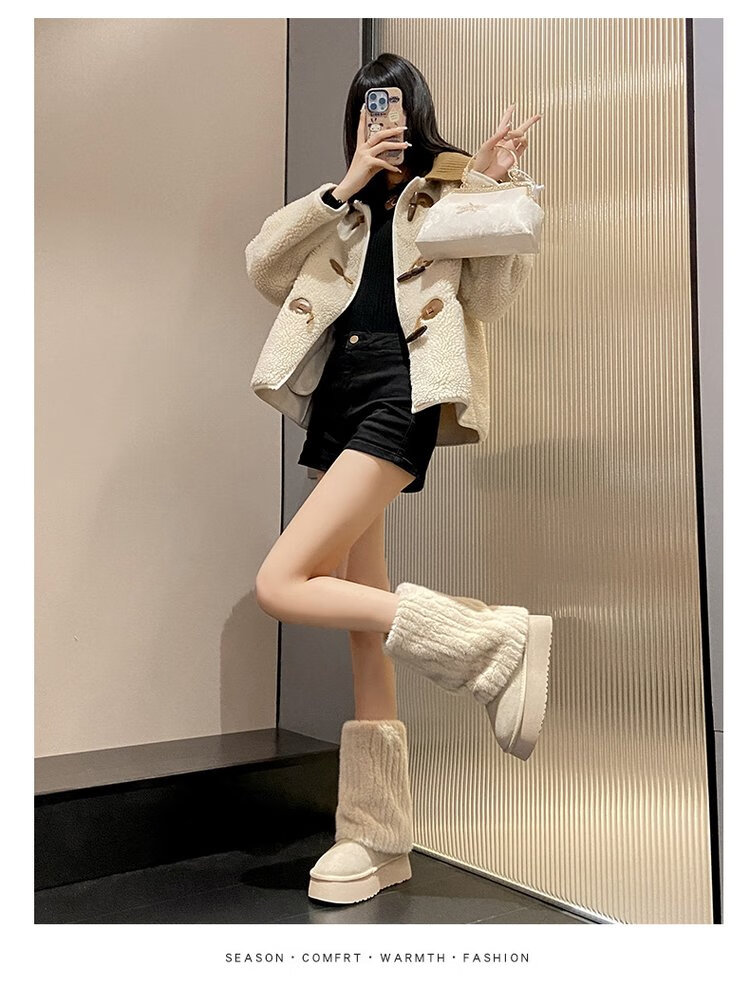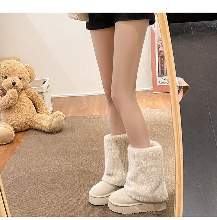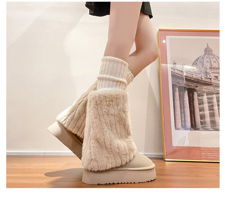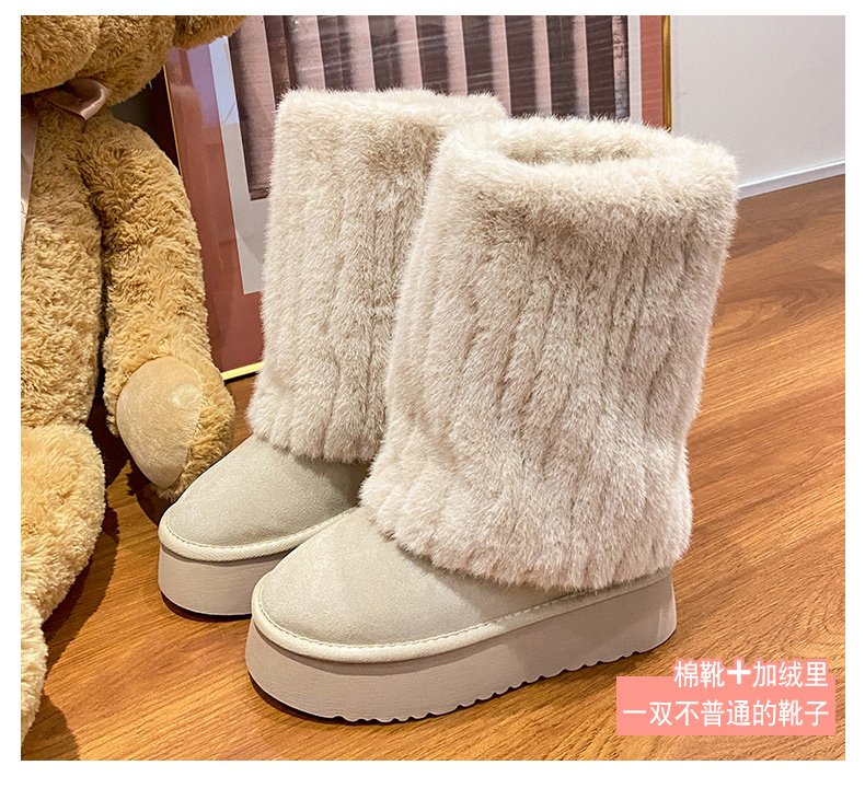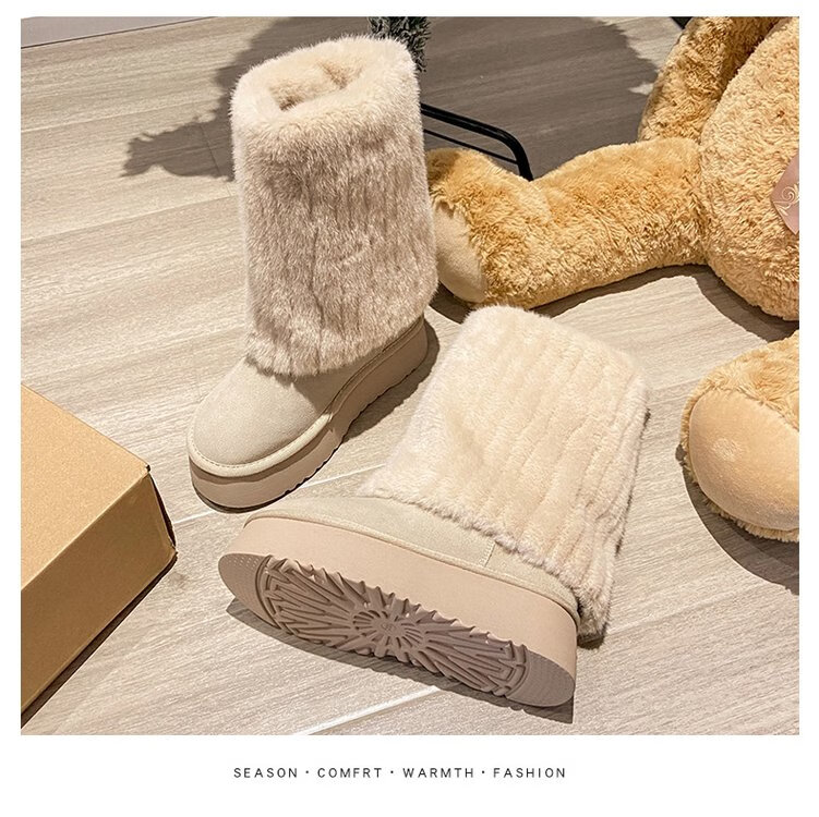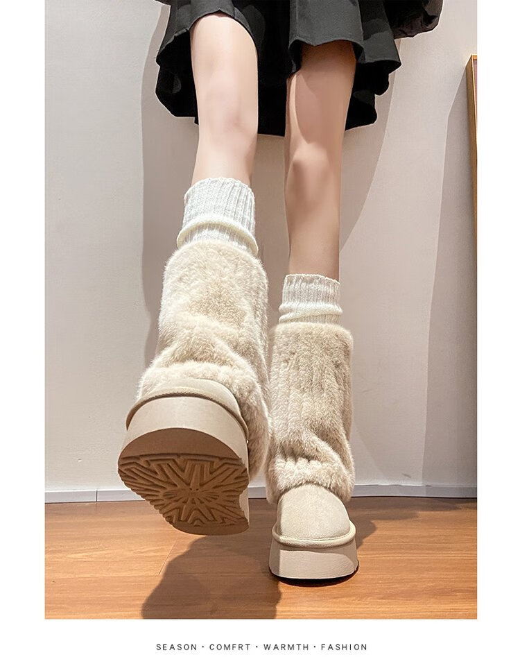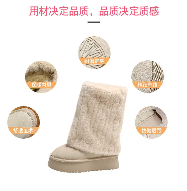 FSAT厚底雪地靴女2026冬季加绒加厚保暖中筒东北棉鞋女短靴子人造短毛 米色 加绒 35 标准尺码