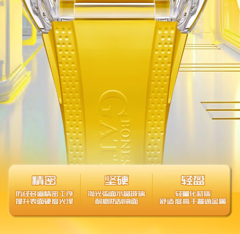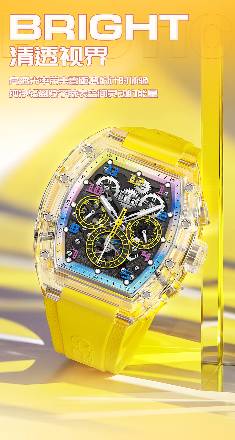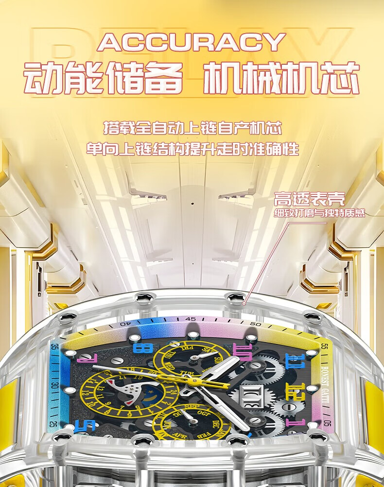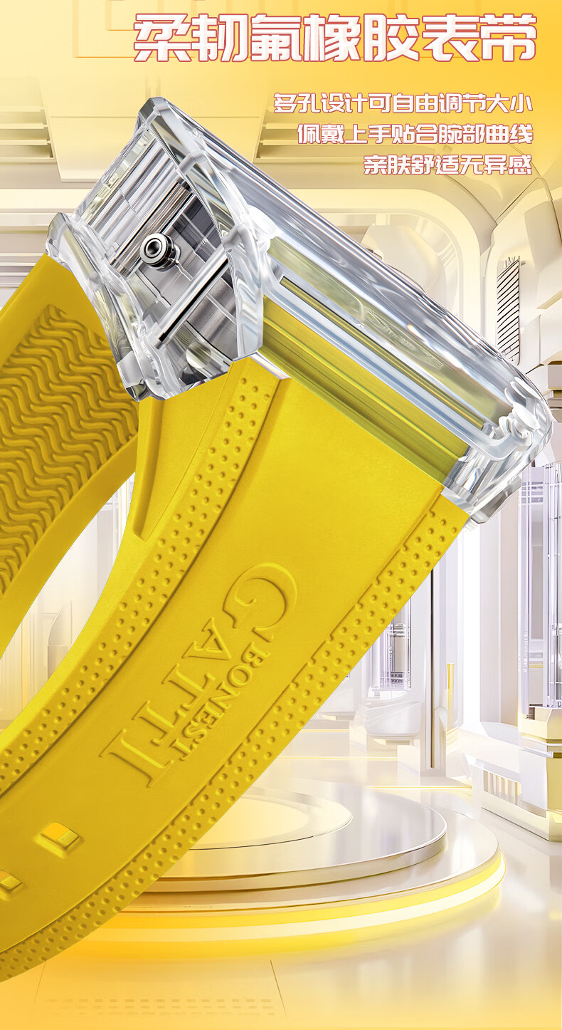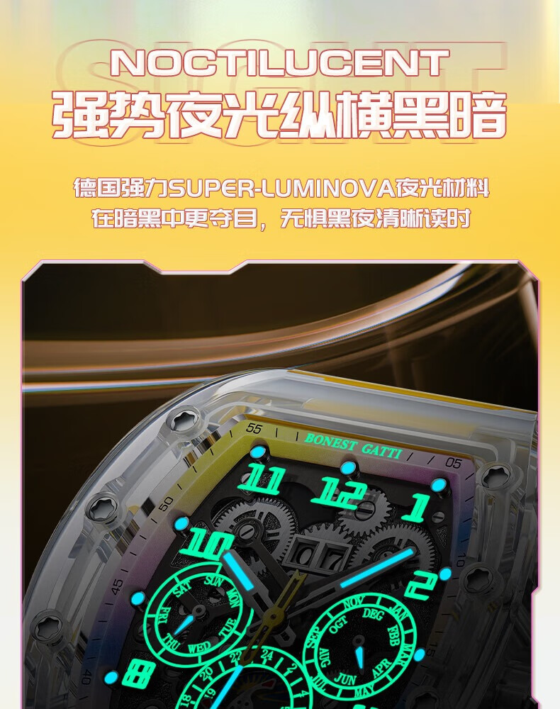 Bugatti (BONEST GATTI) German men's hollow fully automatic mechanical watch crystal case luminous watch Valentine's Day birthday gift for boyfriend BG9920-A3 transparent case yellow surface yellow tape