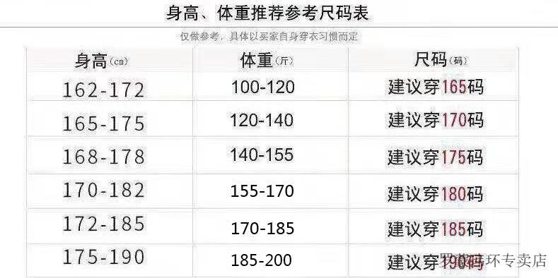 China (cm) 160-165/84-86 165-170 / 88-90 167-172 / 92-96 168-173 / 98-102 170-176 / 106-110