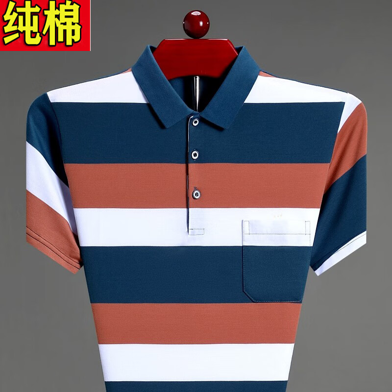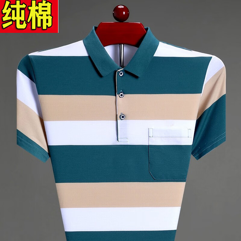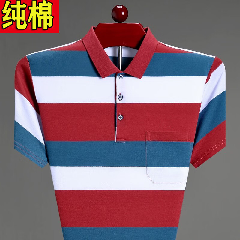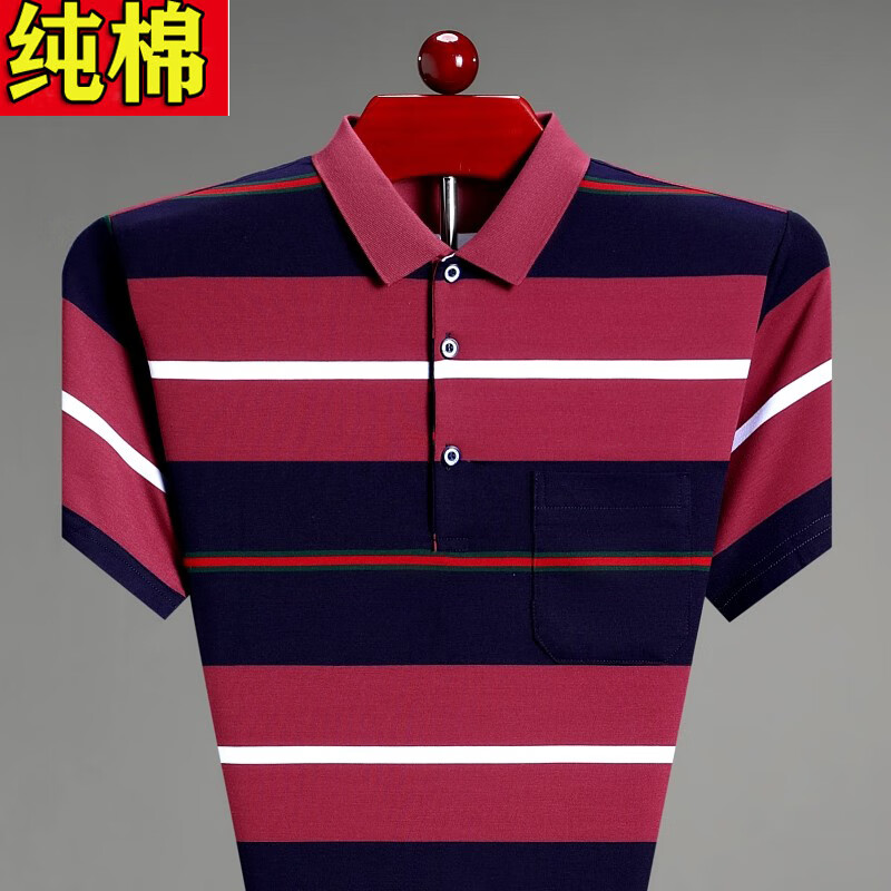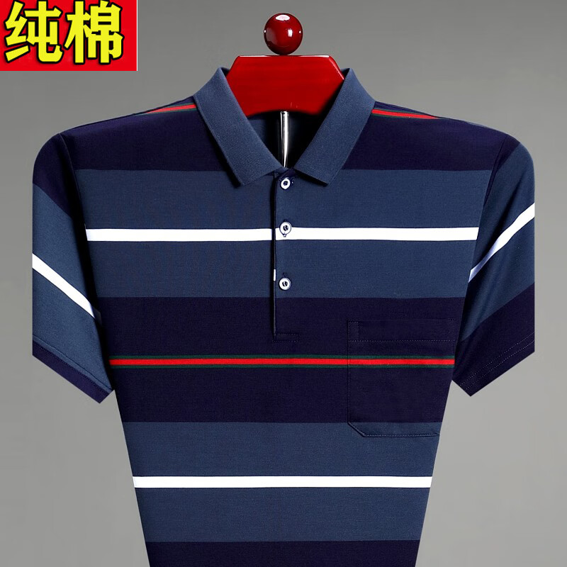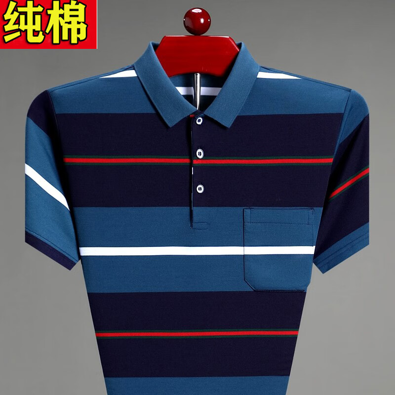 恒源祥中老年短袖T恤男夏季条纹宽松纯棉男士口袋半袖翻领衫男上衣 HHHJ733蓝色 165/M建议100-120斤