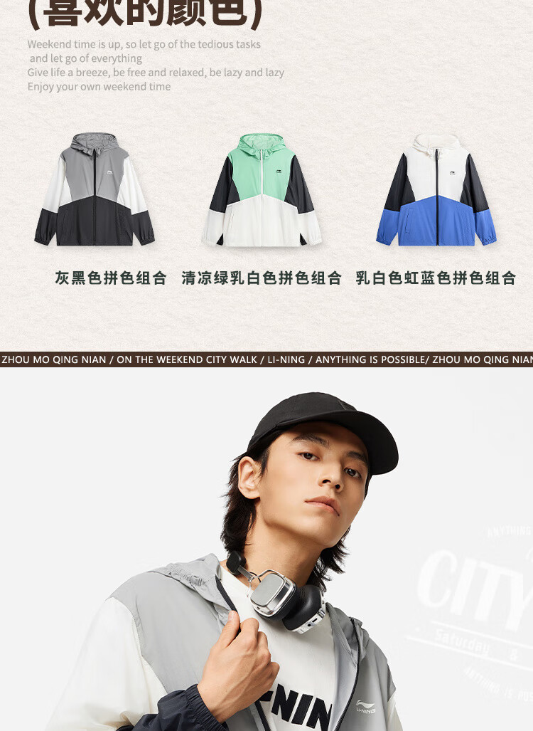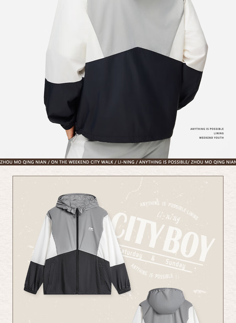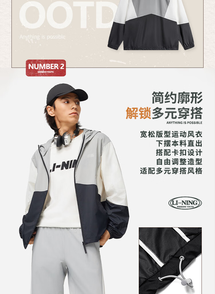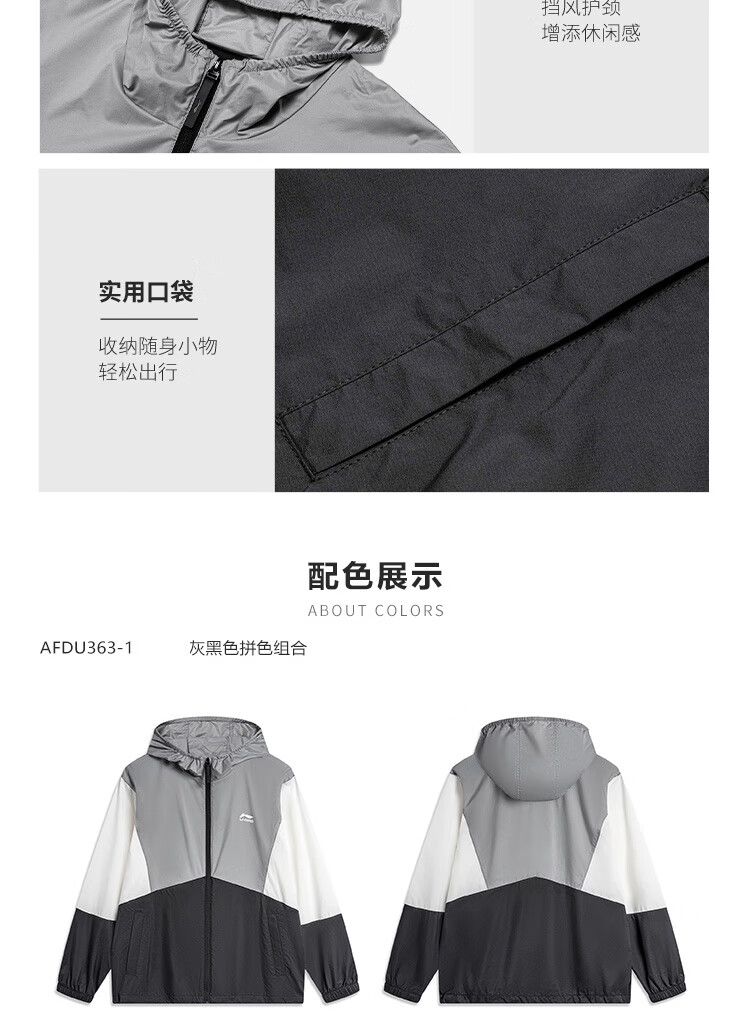 李宁运动潮流系列男子24撞色宽松运动夹克风衣 灰黑色拼色AFDU363-1 L