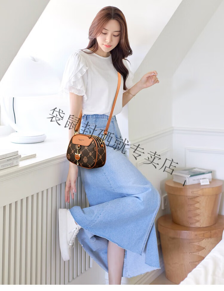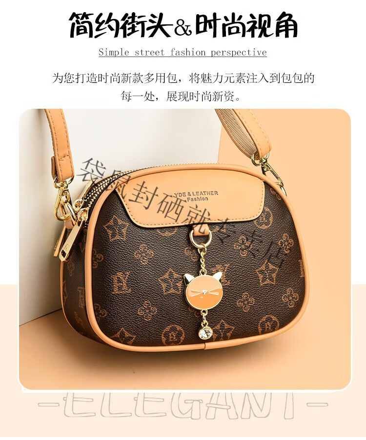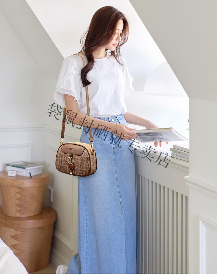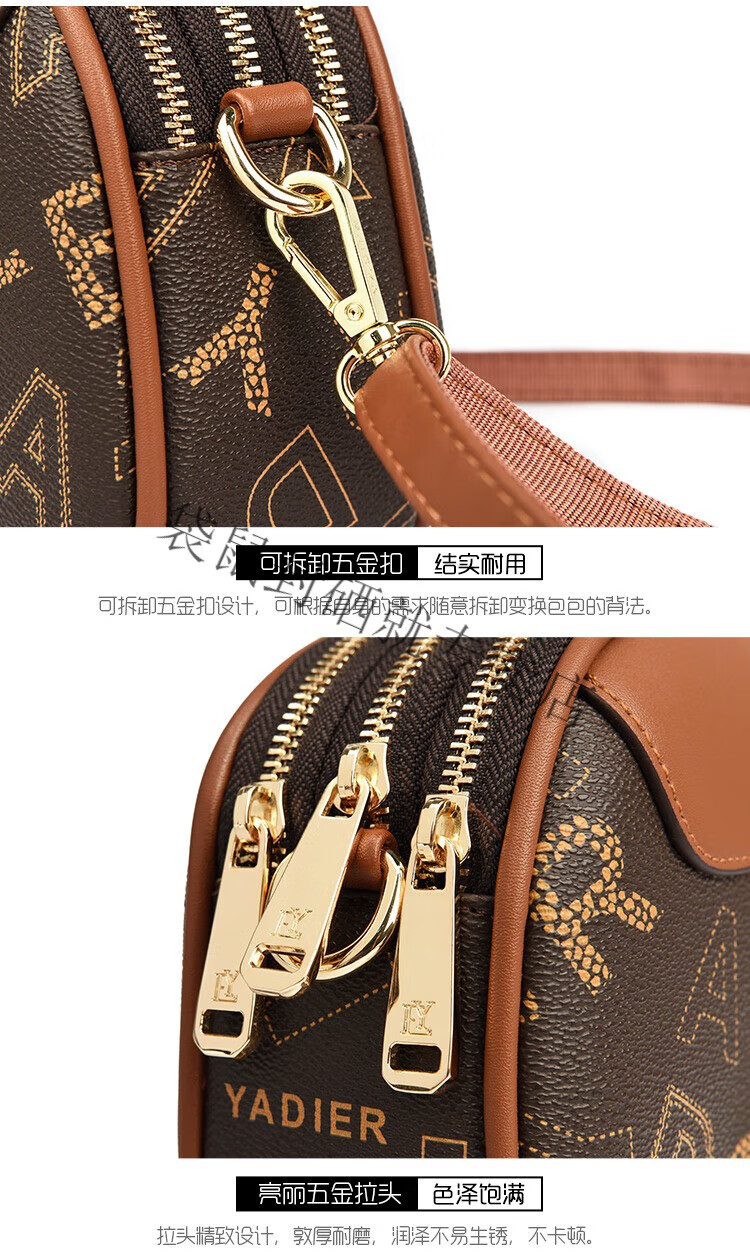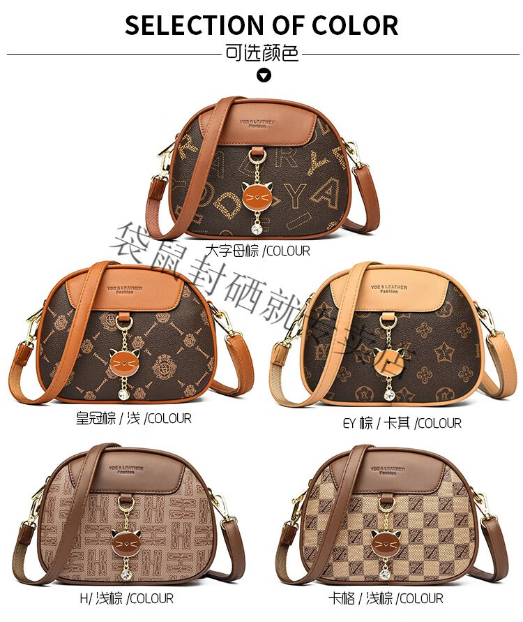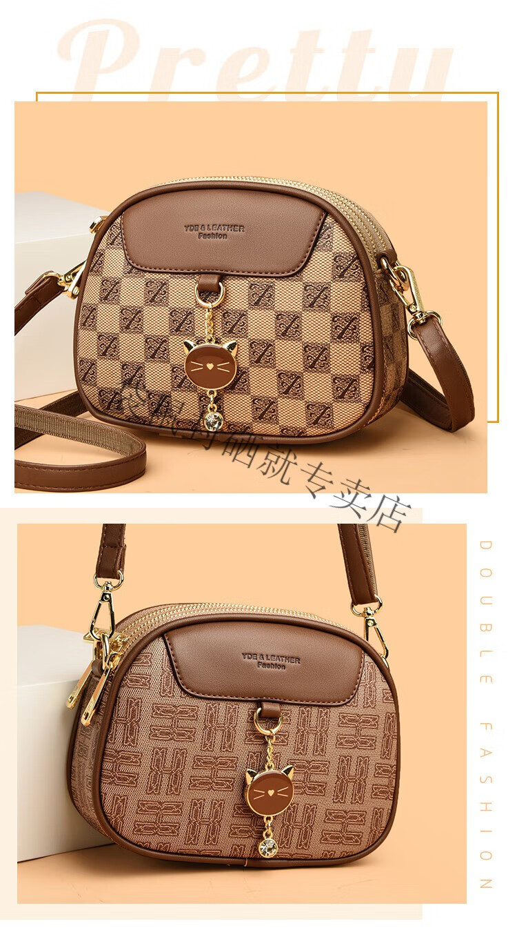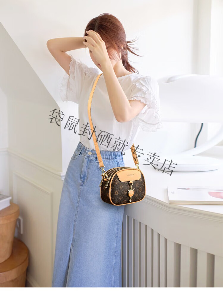 袋鼠真皮包包女2024春夏七夕潮时尚印花小圆包百搭高级感单肩斜挎包 大字母棕色