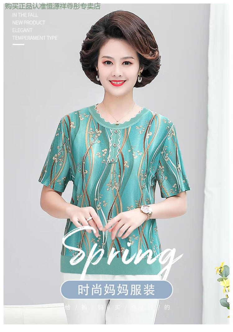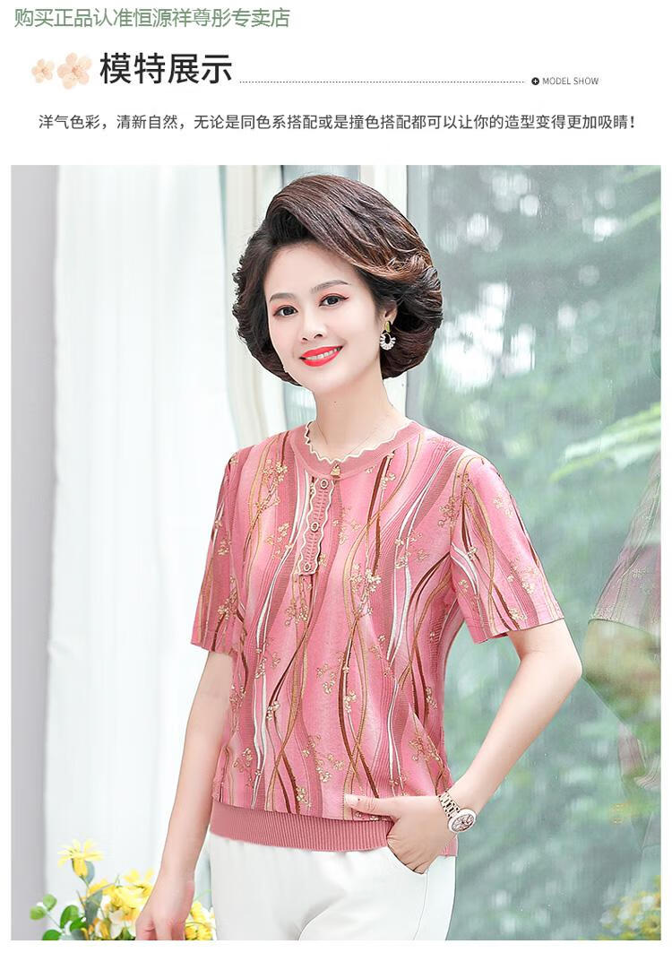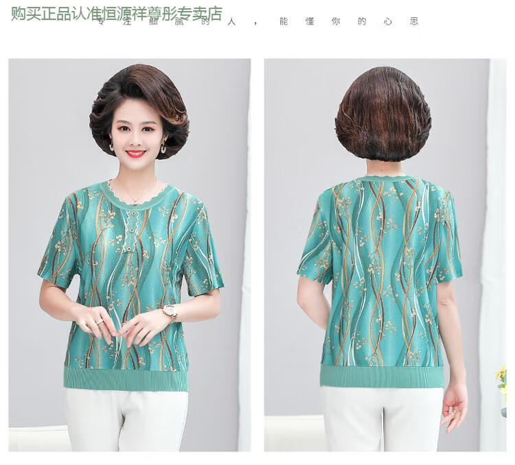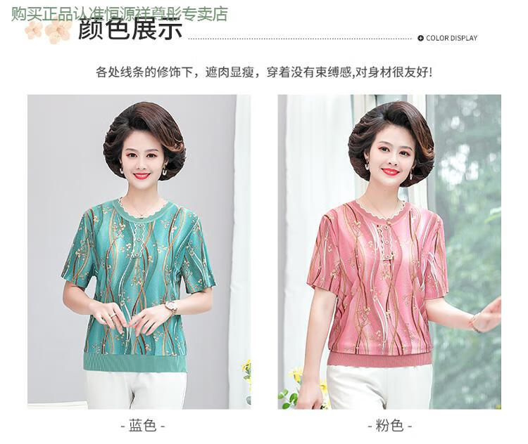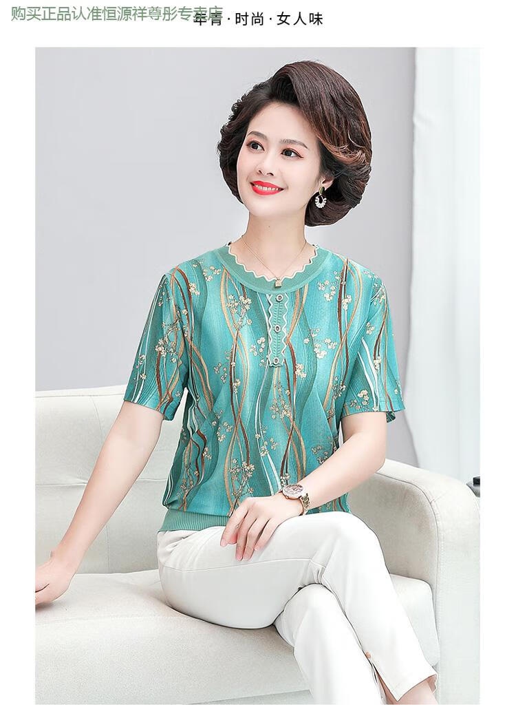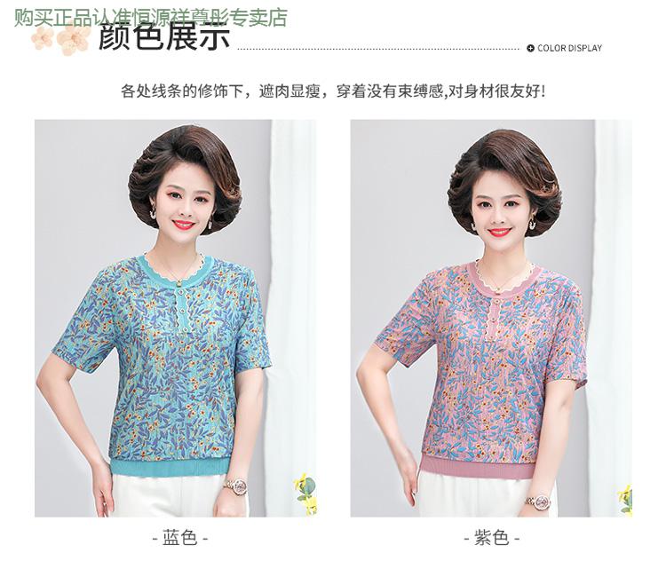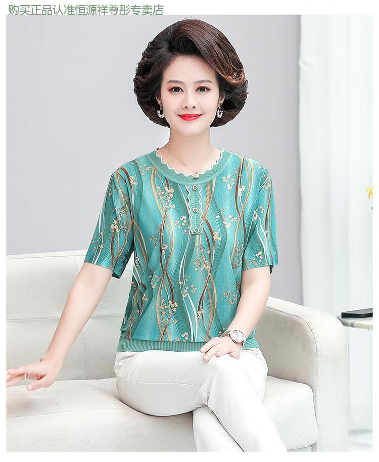 恒源祥2025新款妈妈夏装短袖冰丝小衫中年妇女洋气T恤上衣中老年人套装 9720蓝色+T69黑色 3XL 建议140-150斤