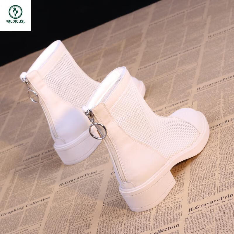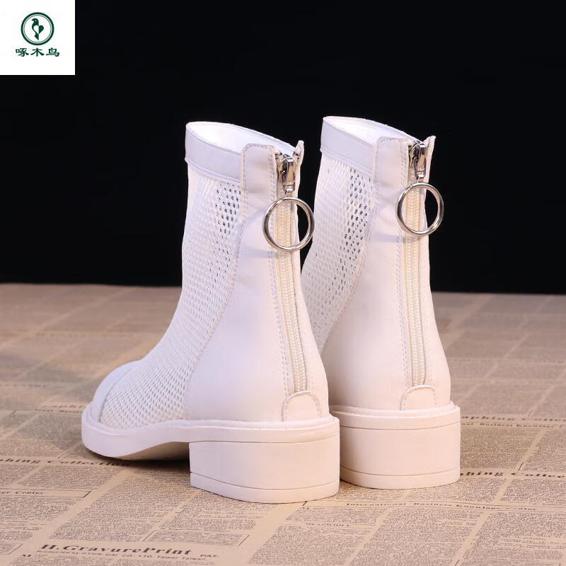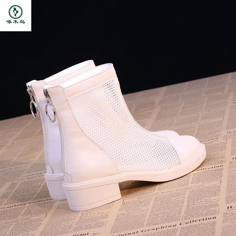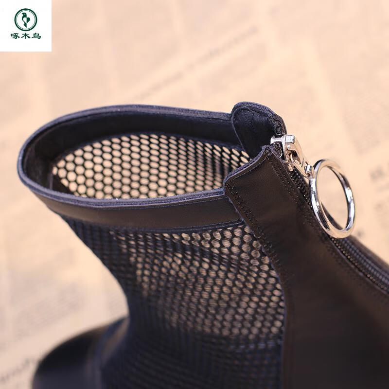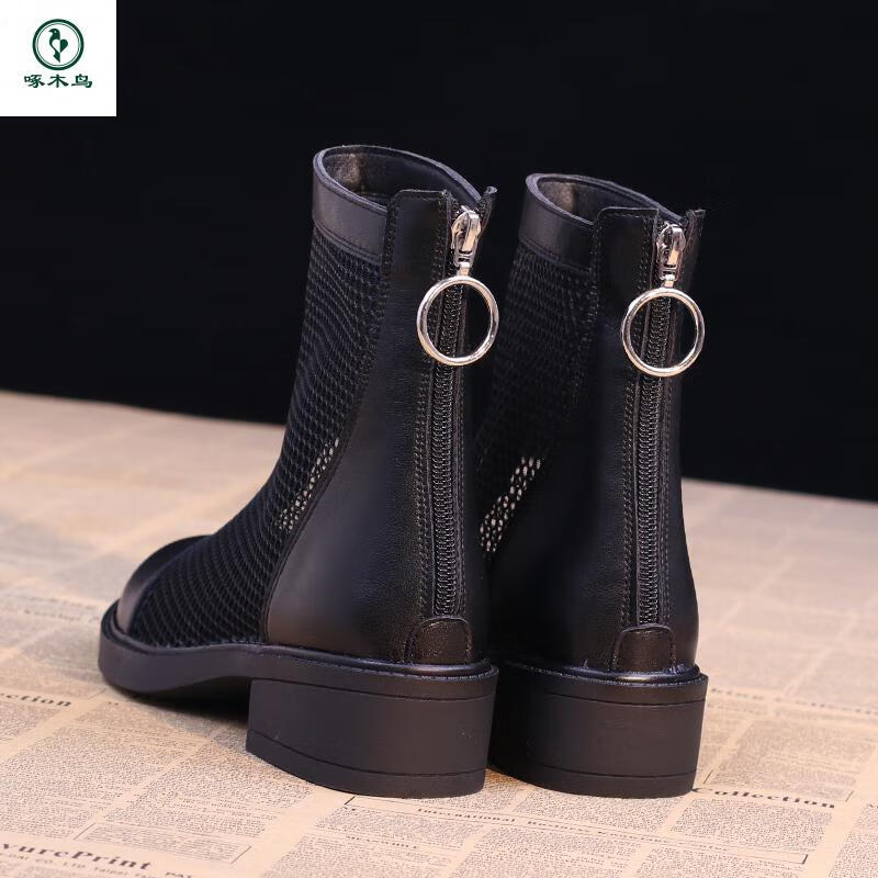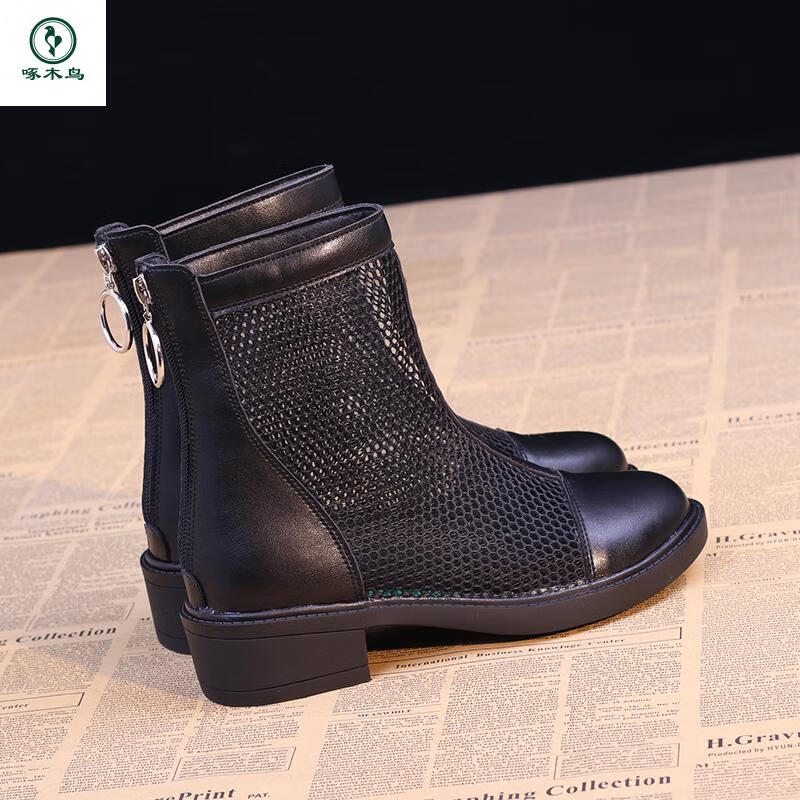 啄木鸟真皮透气短靴女2025夏季新款中跟网纱马丁靴薄款百搭网面镂空凉靴 黑色 38