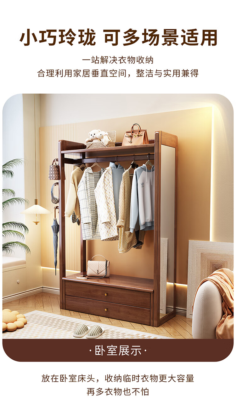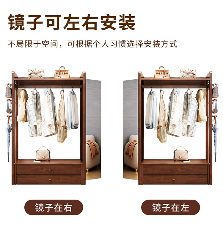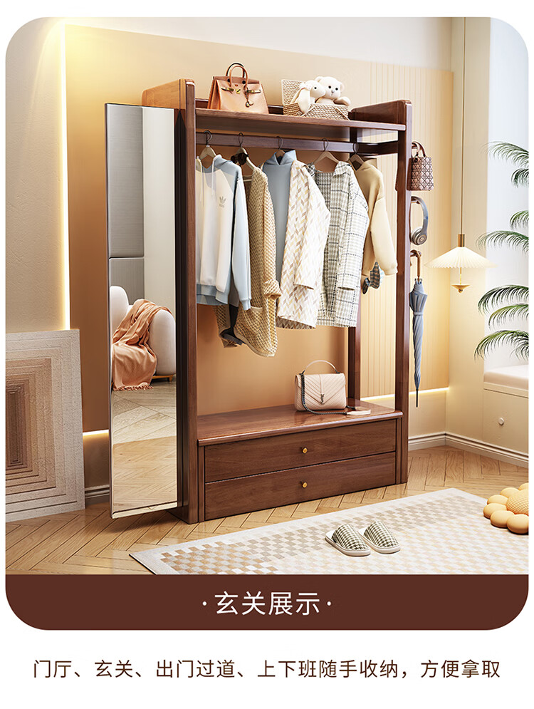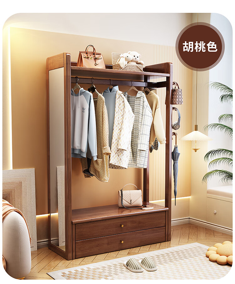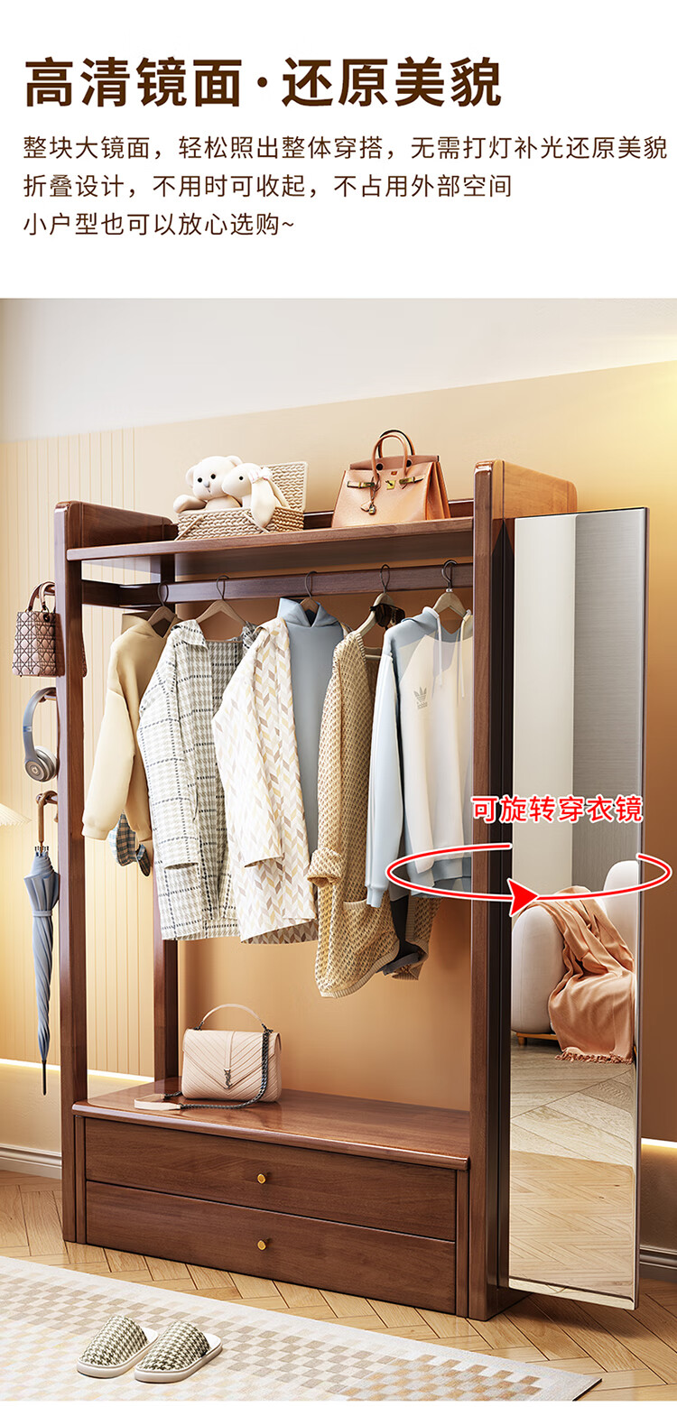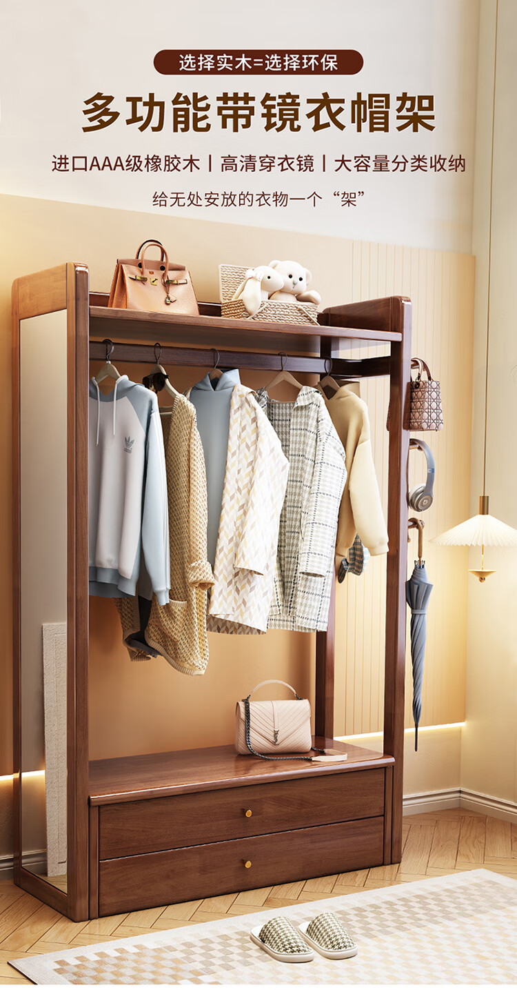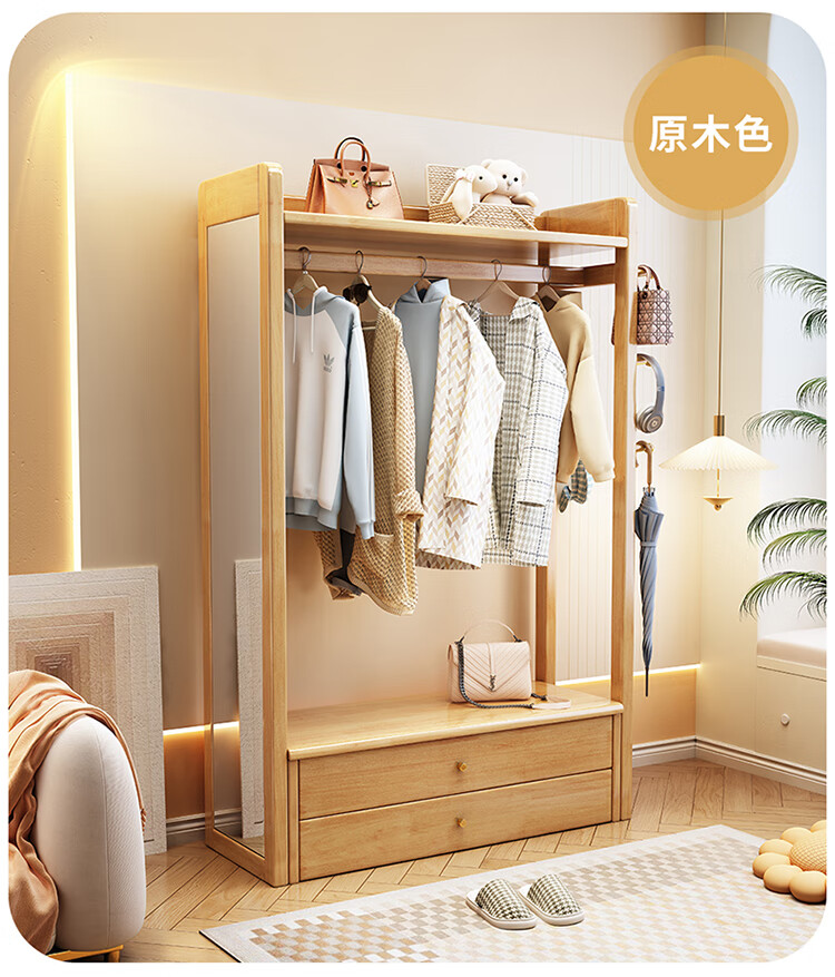 普莱蒂旺衣架置物架落地全实木挂家用卧室带镜子储物简约衣帽架穿衣镜多功 实木环保原木色【100CM】 可折叠