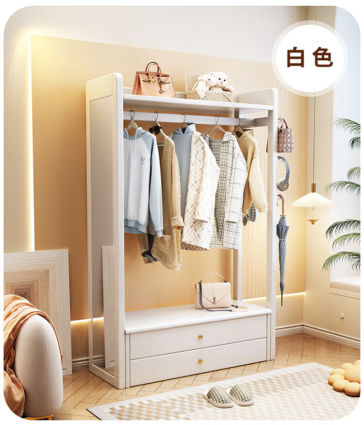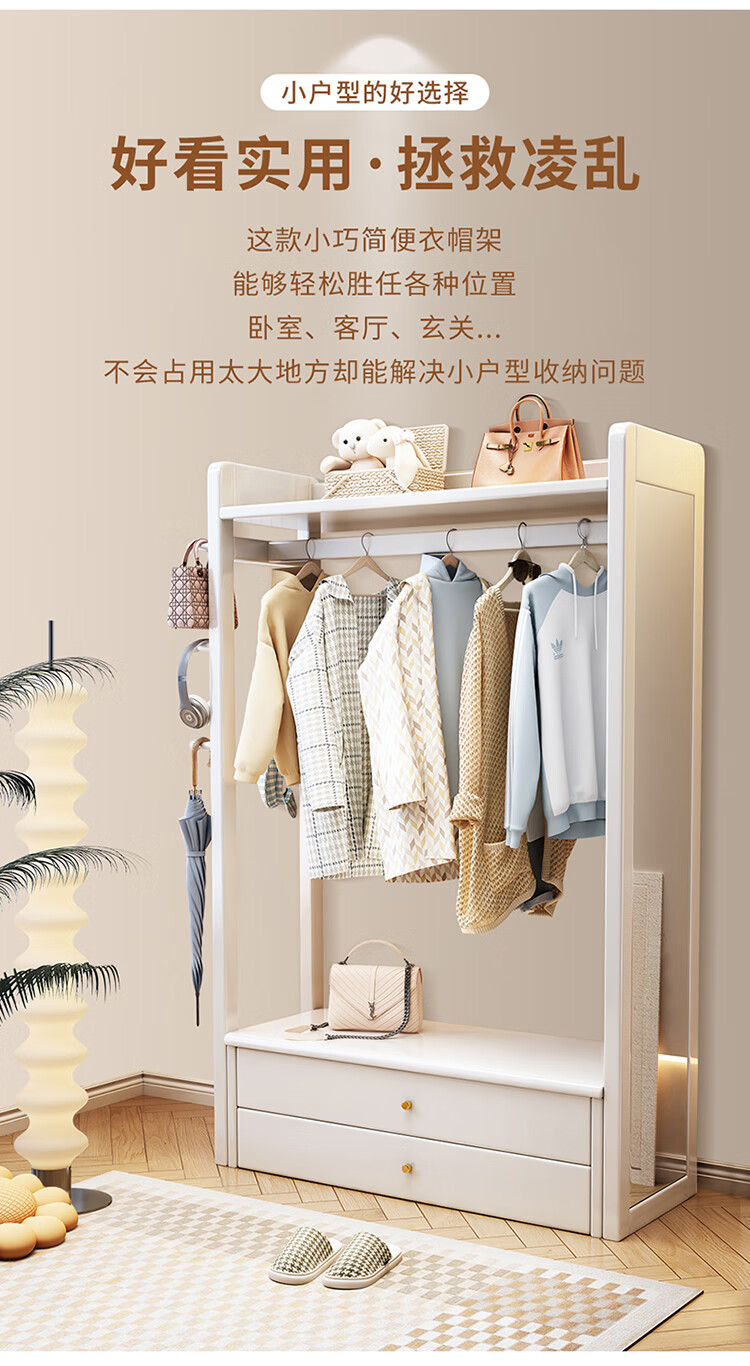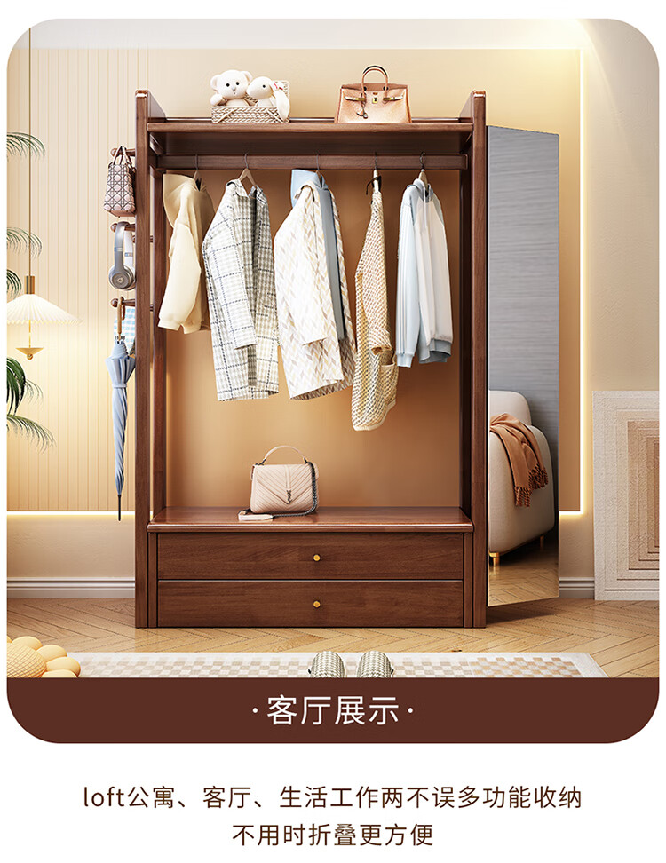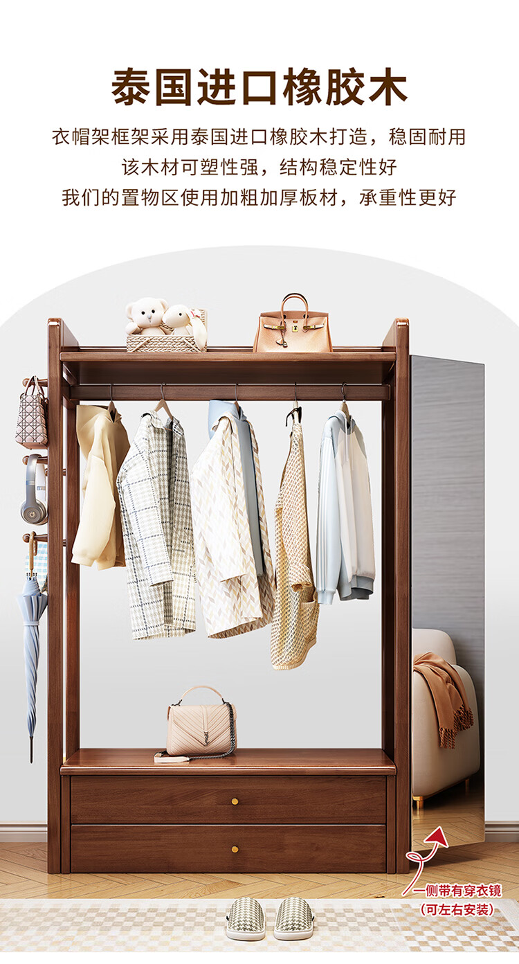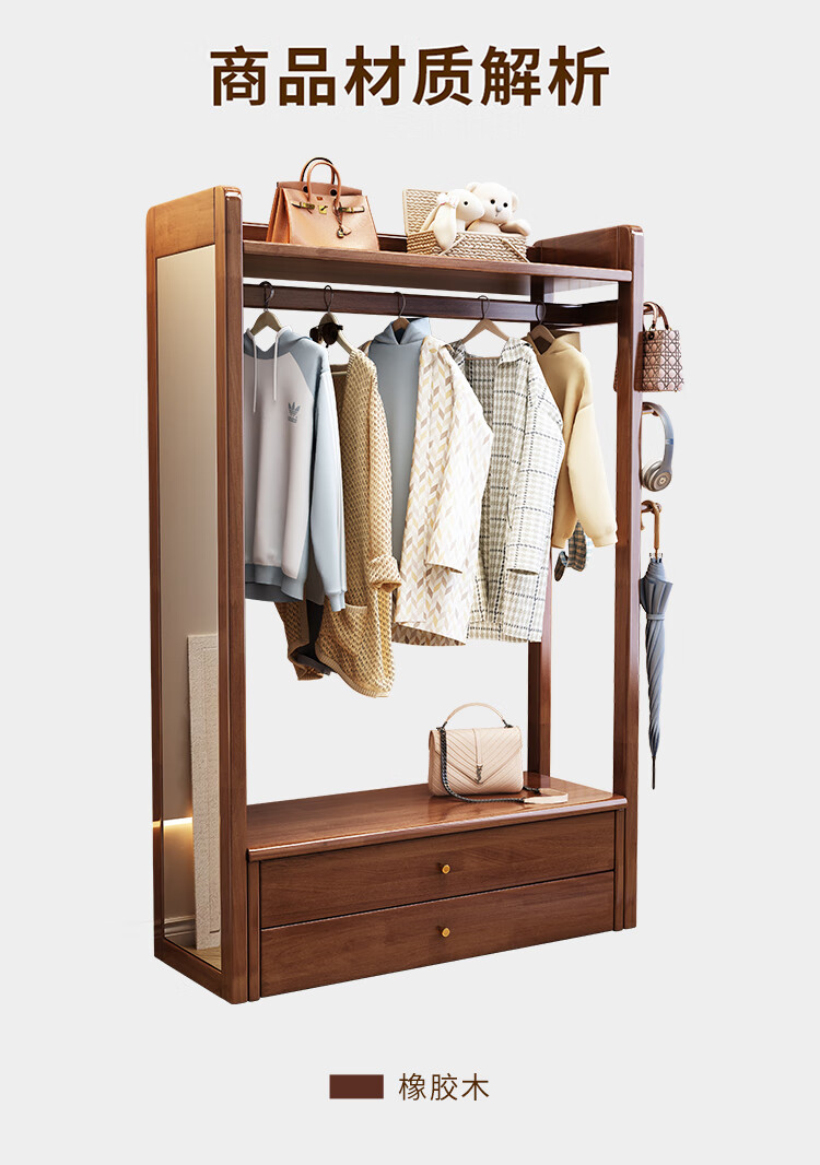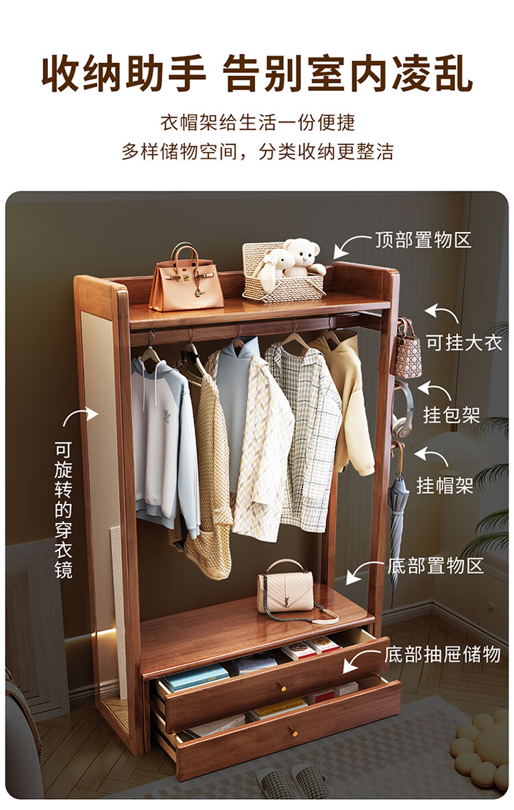 普莱蒂旺衣架置物架落地全实木挂家用卧室带镜子储物简约衣帽架穿衣镜多功 实木环保原木色【100CM】 可折叠