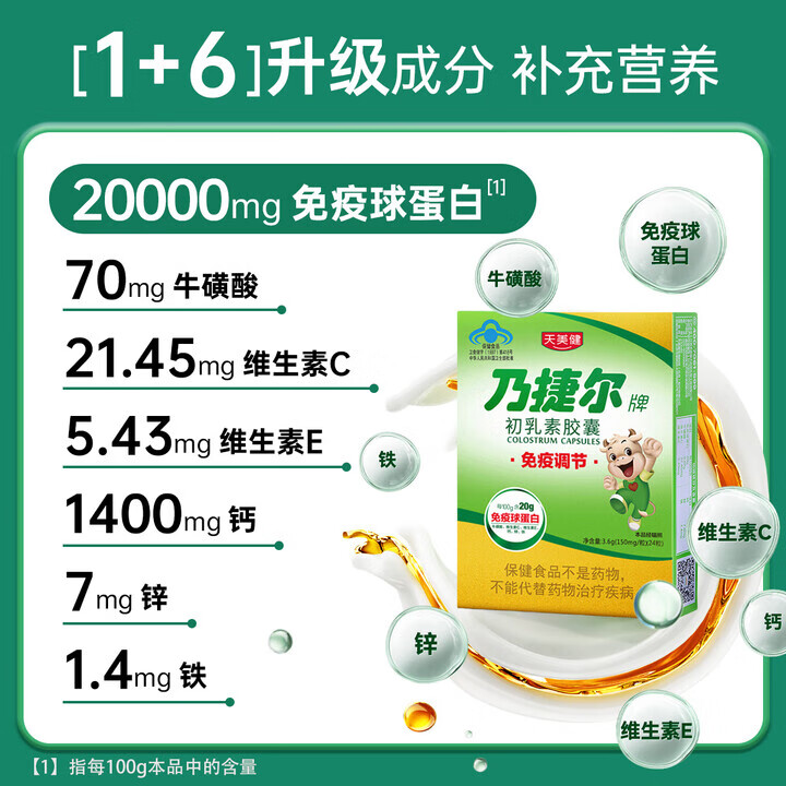 Capsules de colostrum de marque Tianmeijinaijier 3,6 g (150 mg * 24 capsules)/boîte authenticité pour garantir la régulation de l'immunité des enfants 2 boîtes
