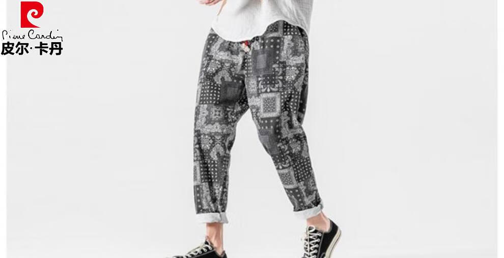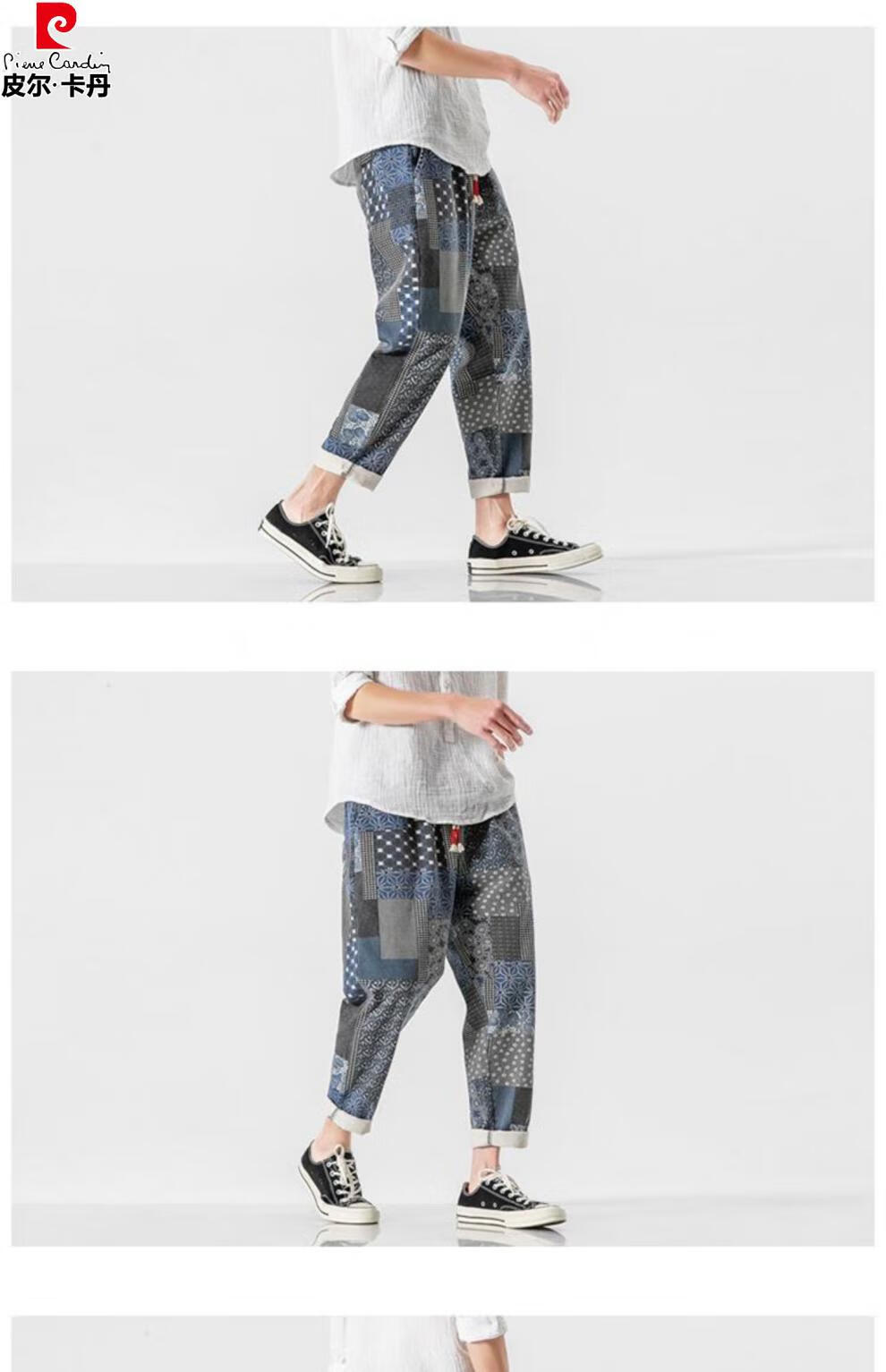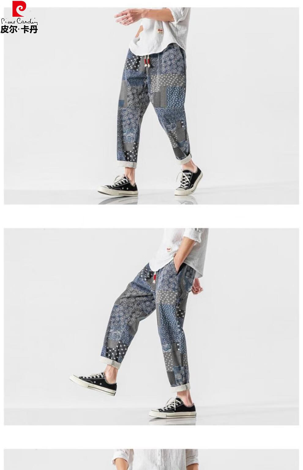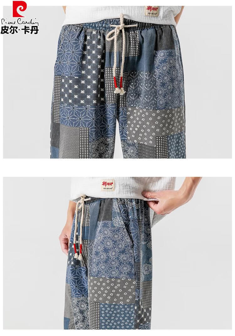 Pierre Cardin Linen Nine-Point Casual Pants Men's Autumn Thick Loose Cotton and Linen Pants National Fashion Cashew Flower Pants Thai Harem Pants Blue 2XL