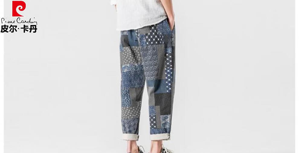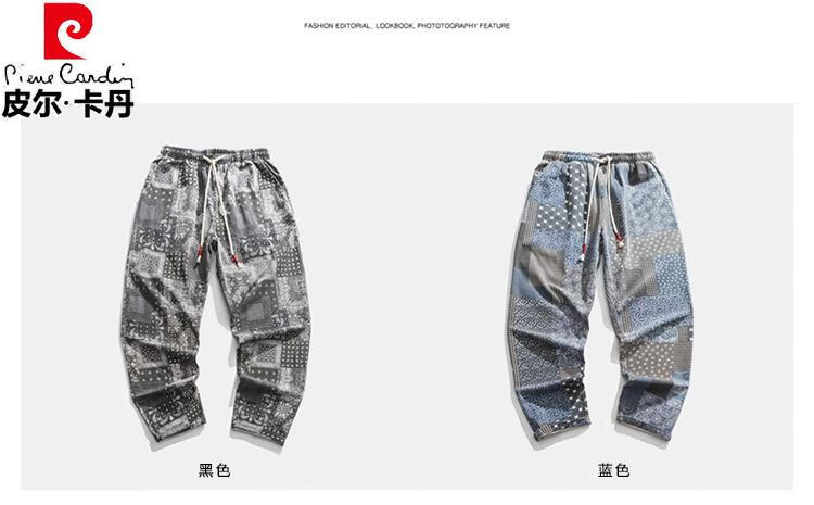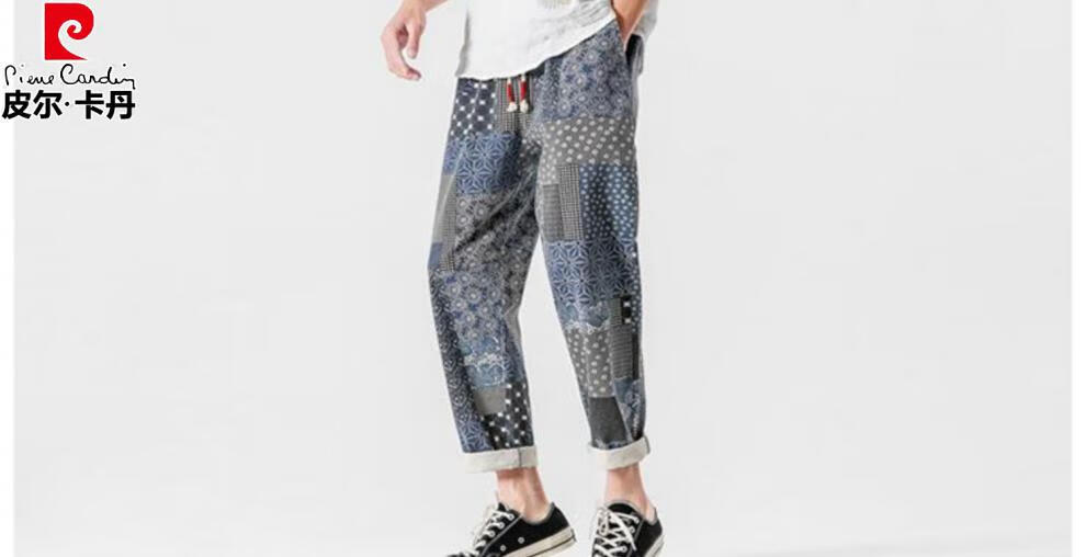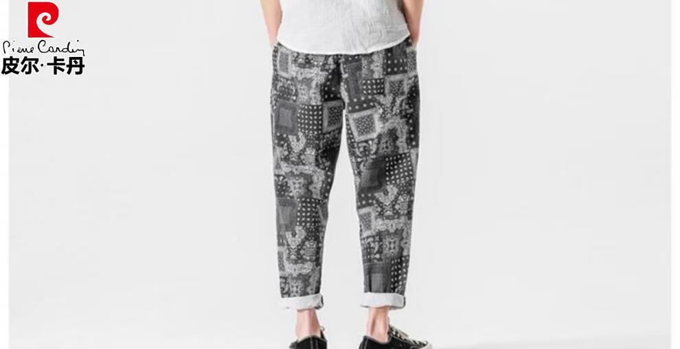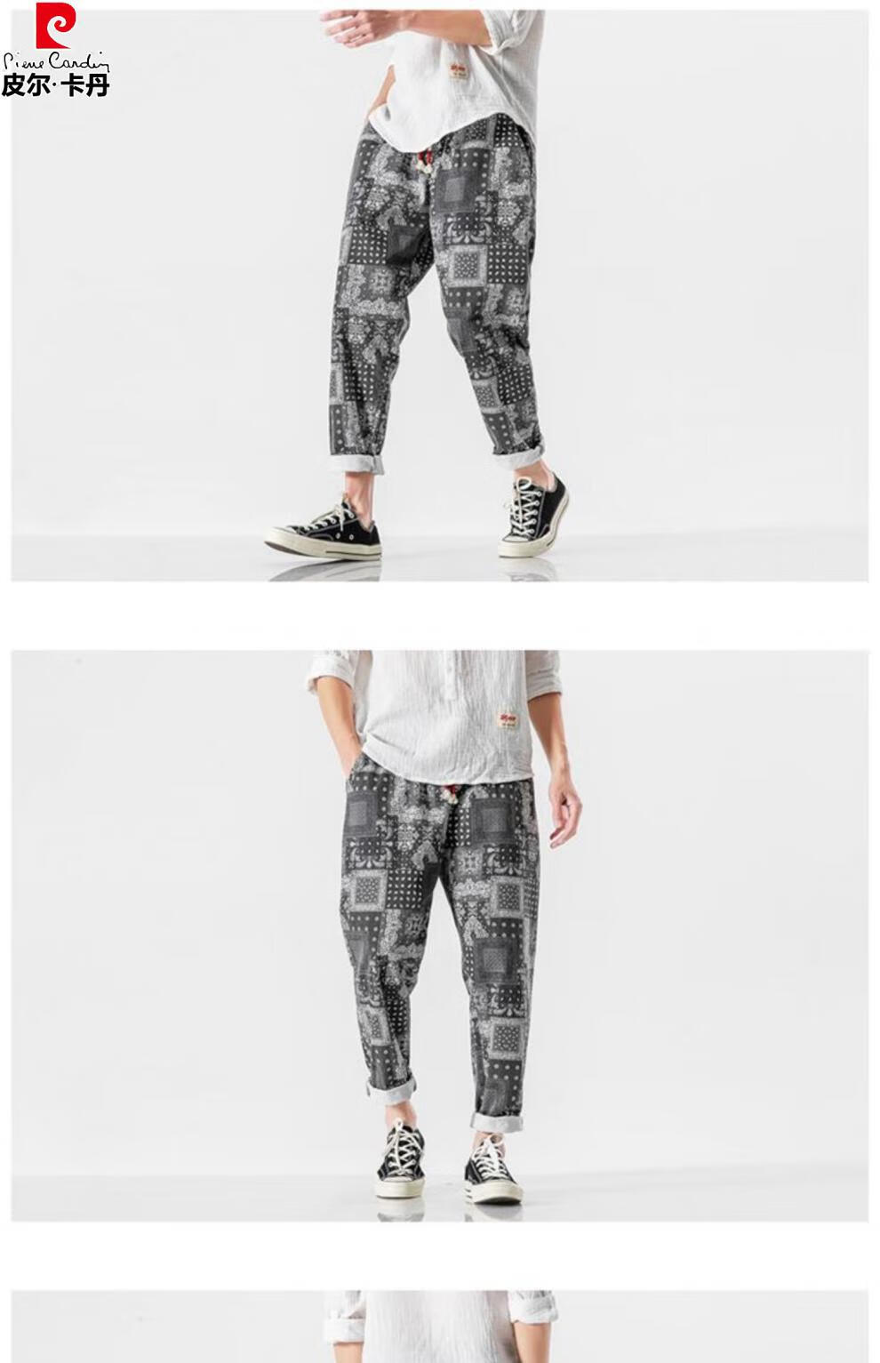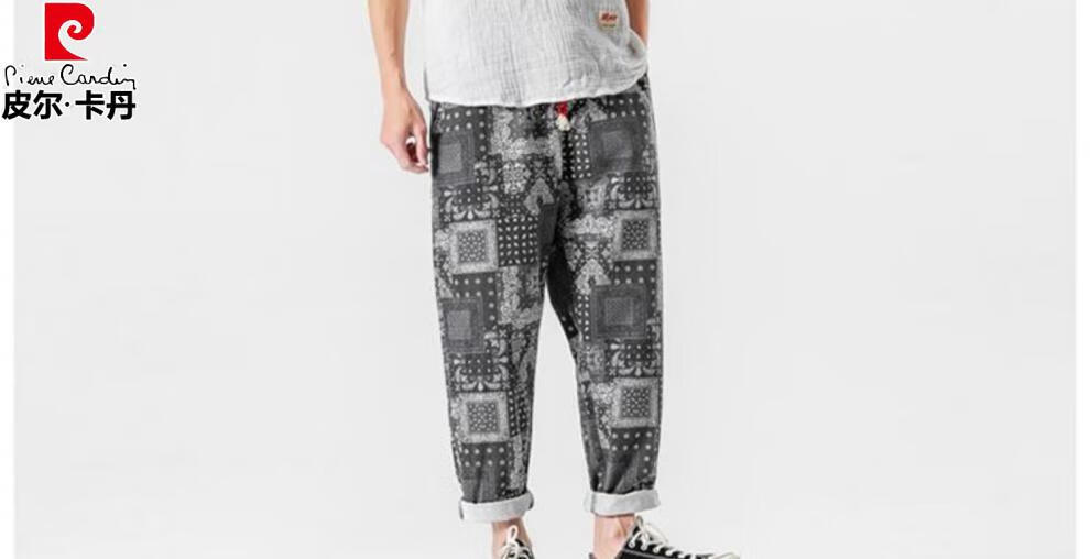 Pierre Cardin Linen Nine-Point Casual Pants Men's Autumn Thick Loose Cotton and Linen Pants National Fashion Cashew Flower Pants Thai Harem Pants Blue 2XL