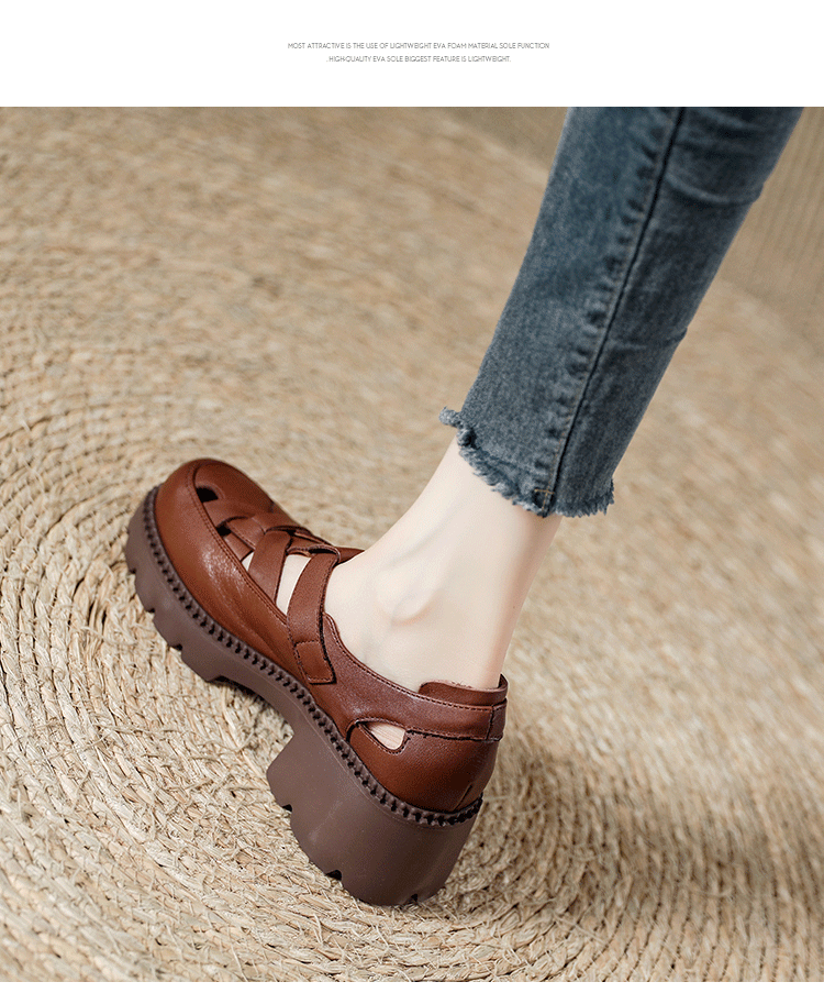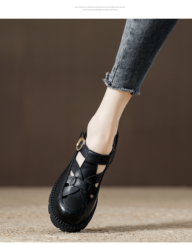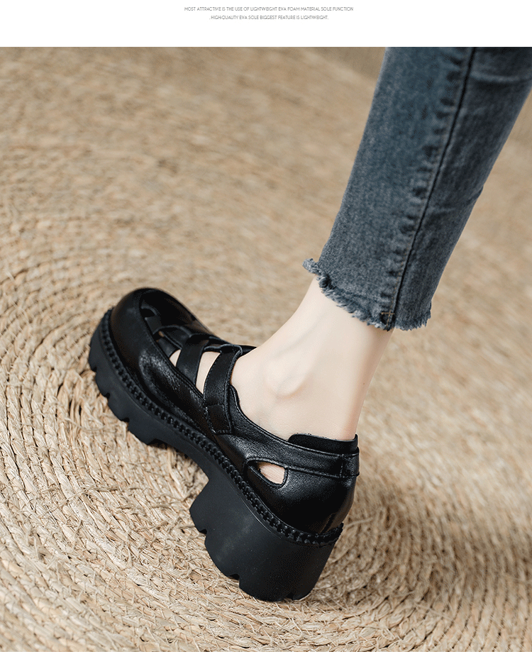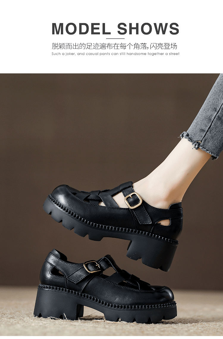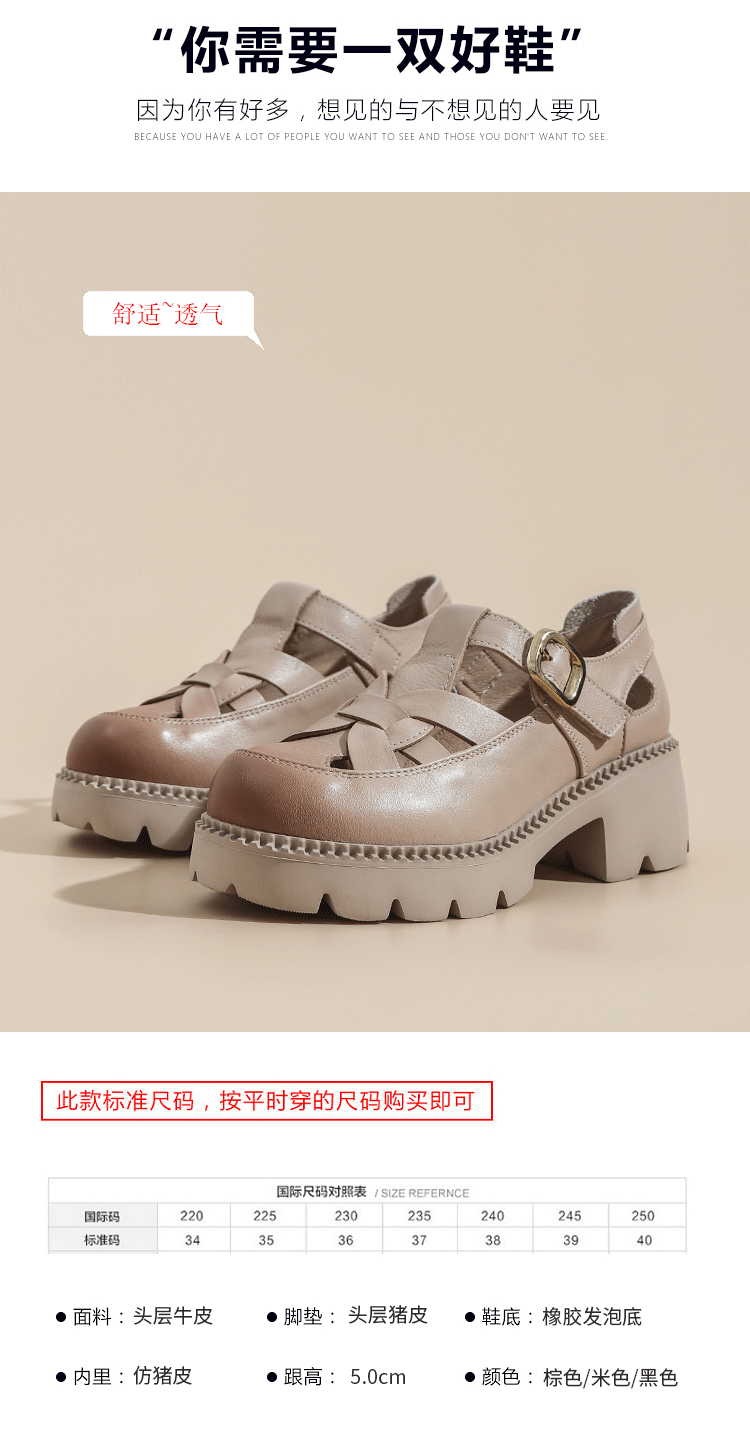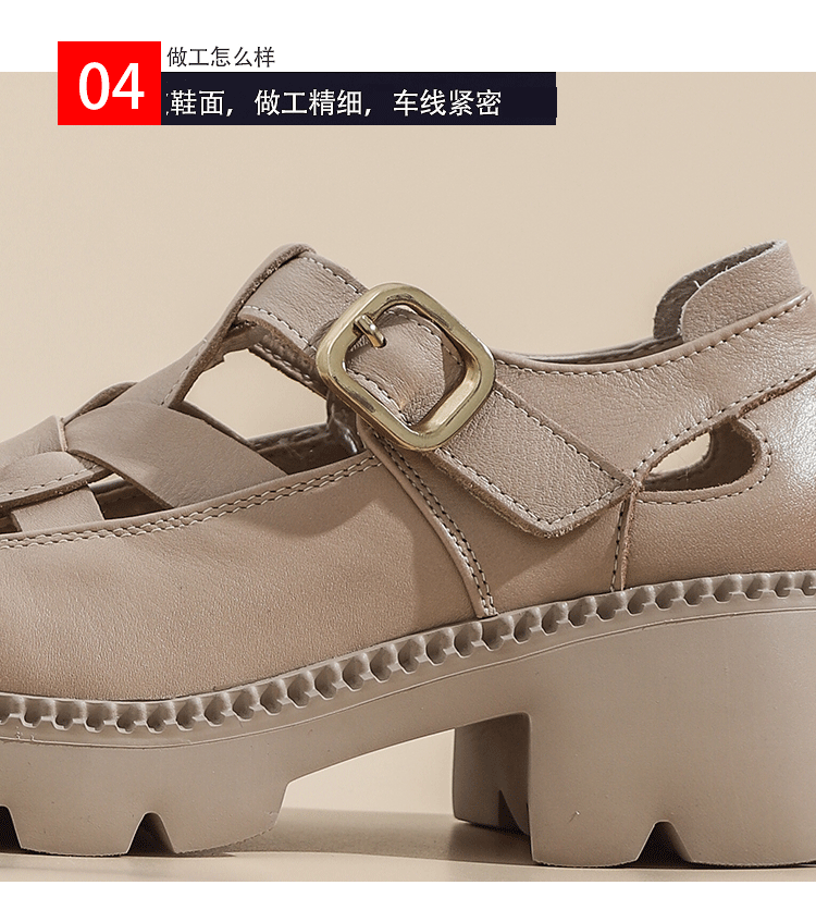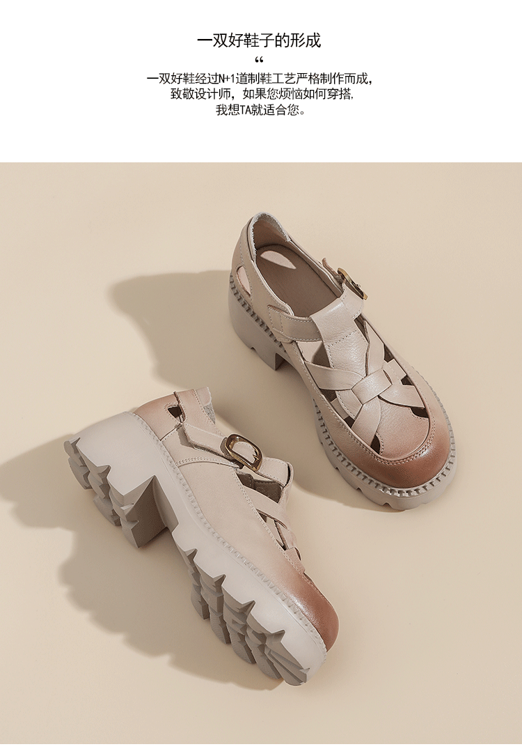 卡帝乐鳄鱼(CARTELO)夏季包头不露脚趾真皮罗马凉鞋女款头层牛皮厚底坡跟女鞋镂空皮鞋 黑色 38