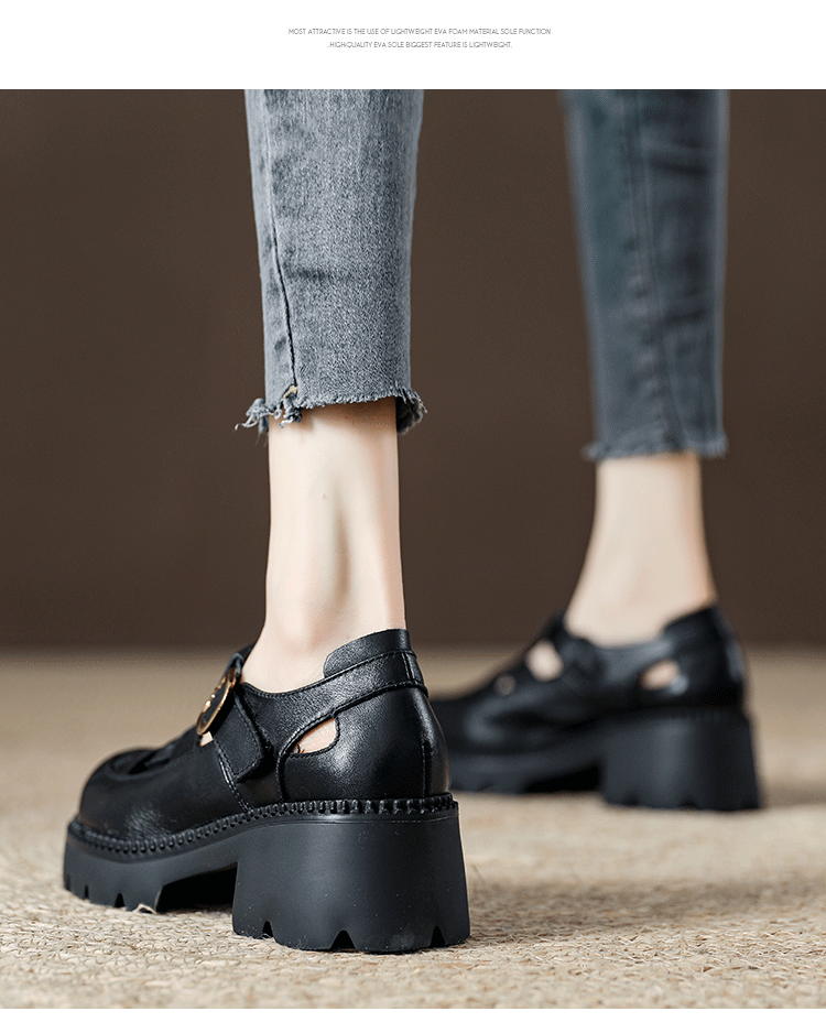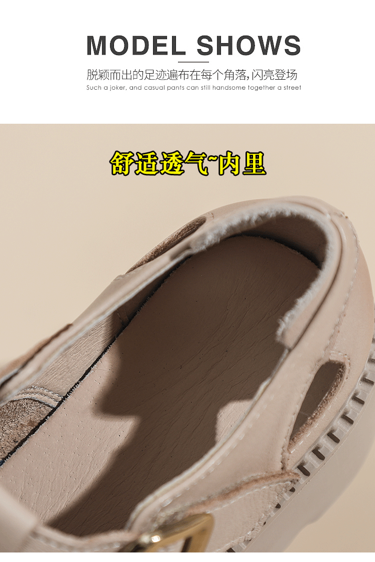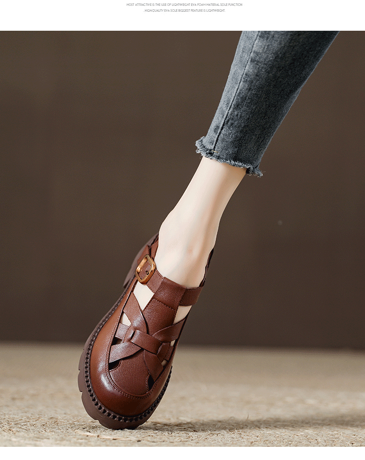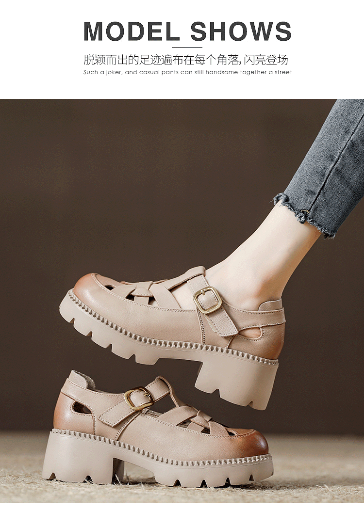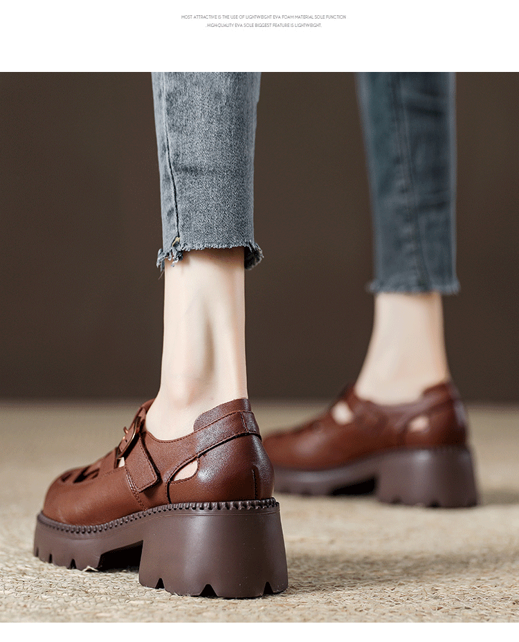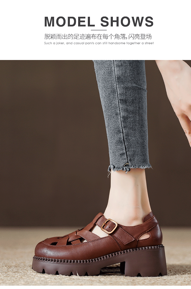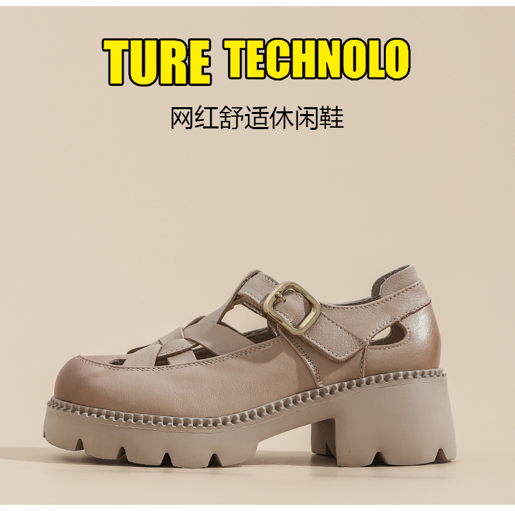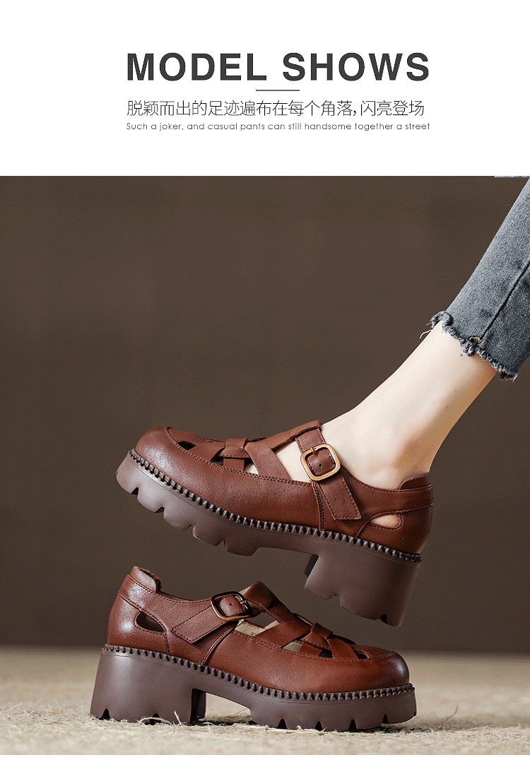 卡帝乐鳄鱼(CARTELO)夏季包头不露脚趾真皮罗马凉鞋女款头层牛皮厚底坡跟女鞋镂空皮鞋 黑色 38