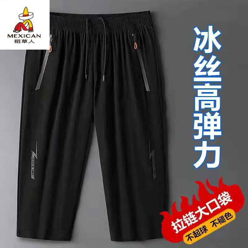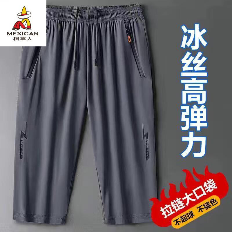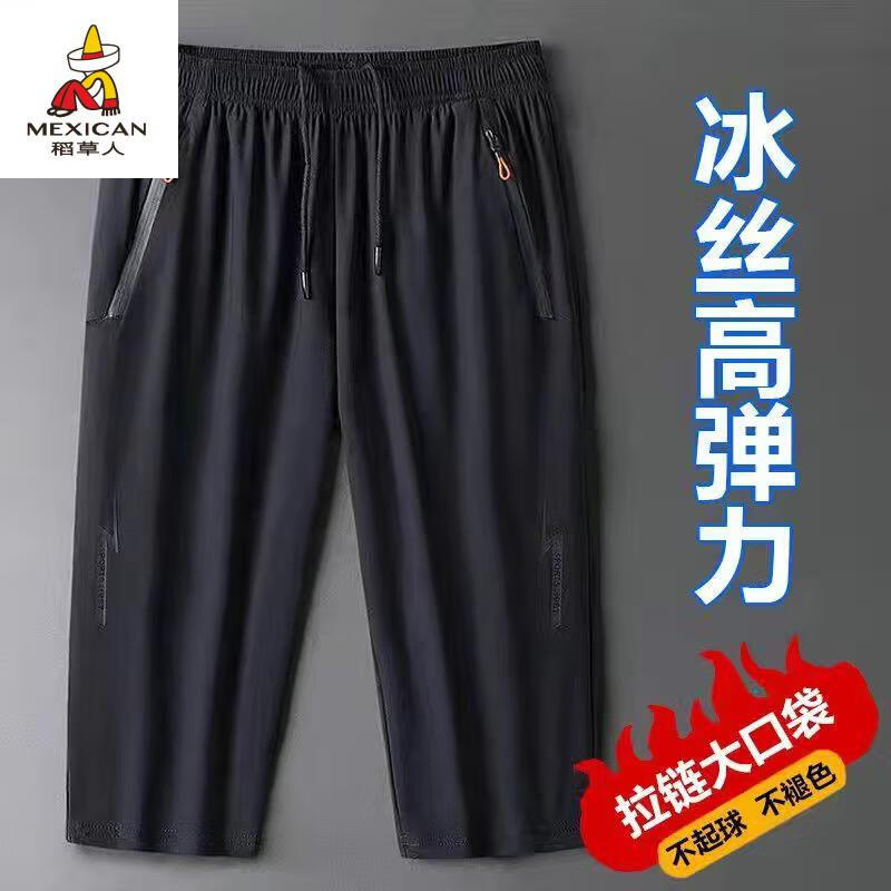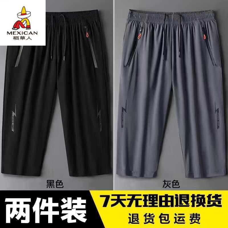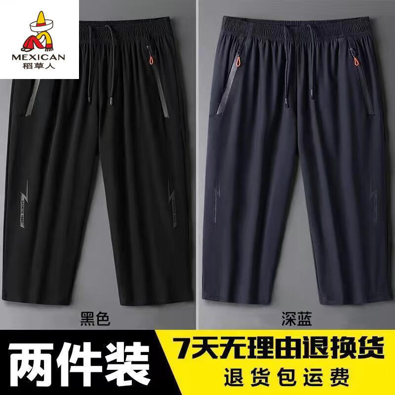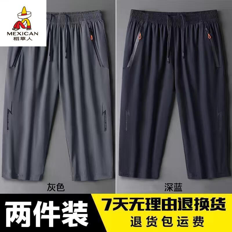 稻草人弹力新款冰丝七分裤男士夏季薄款宽松休闲运动裤大码速干裤男短裤 深灰色+藏蓝色【两件装】 3XL
