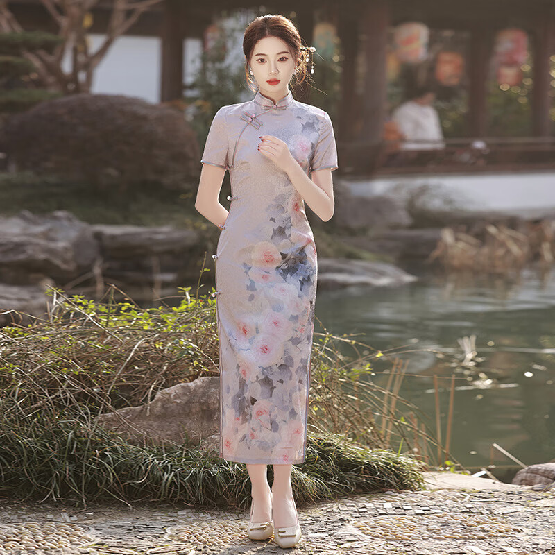NUKM时尚旗袍中国风长款年轻2025夏季新款修身优雅少女复古改良连衣裙 6629紫色 M
