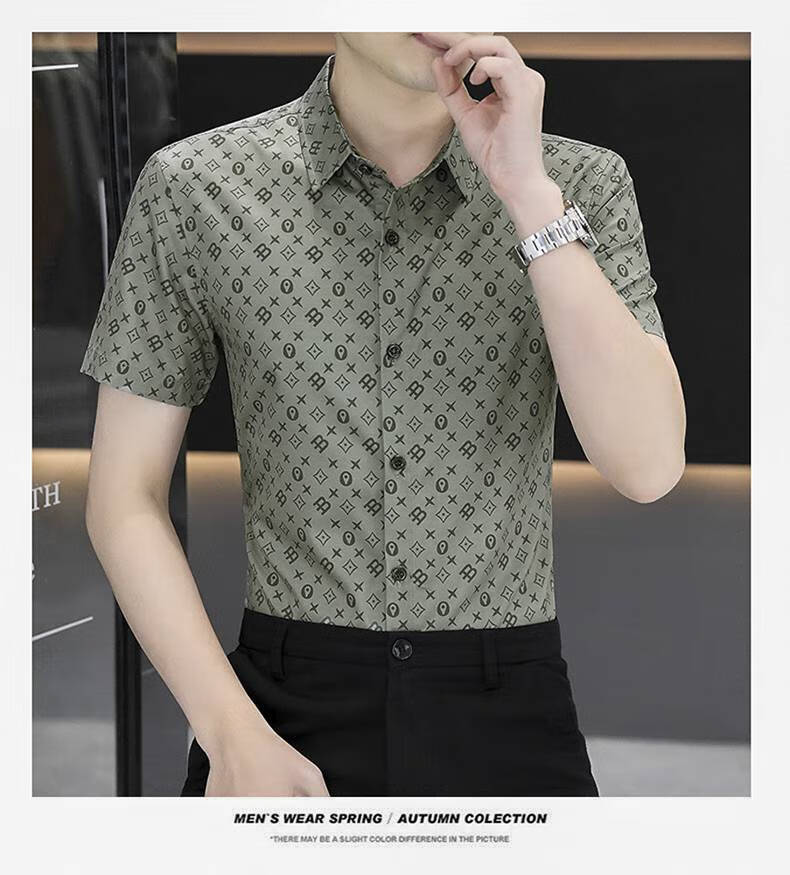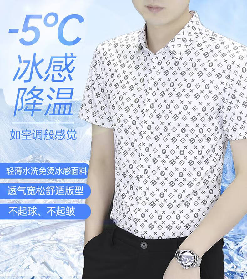 以堡狼高端夏季男衬衫短袖弹力冰丝数码印花薄款休闲男士衬衣修身 7029白色 3XL 【推荐160-175斤】