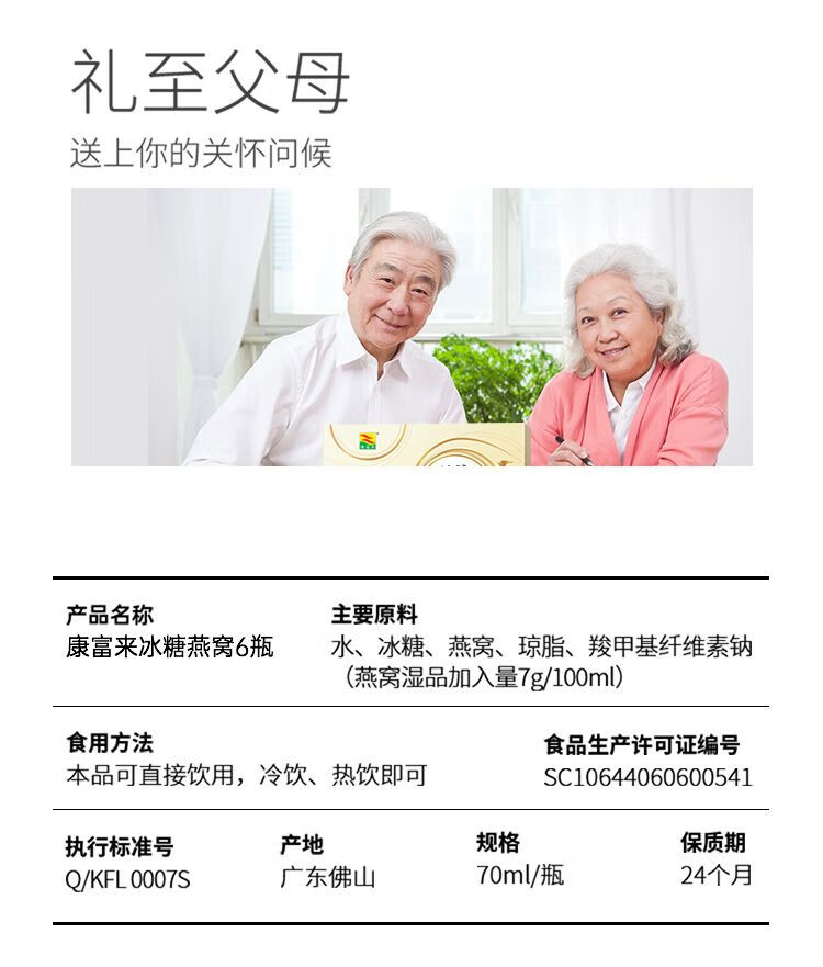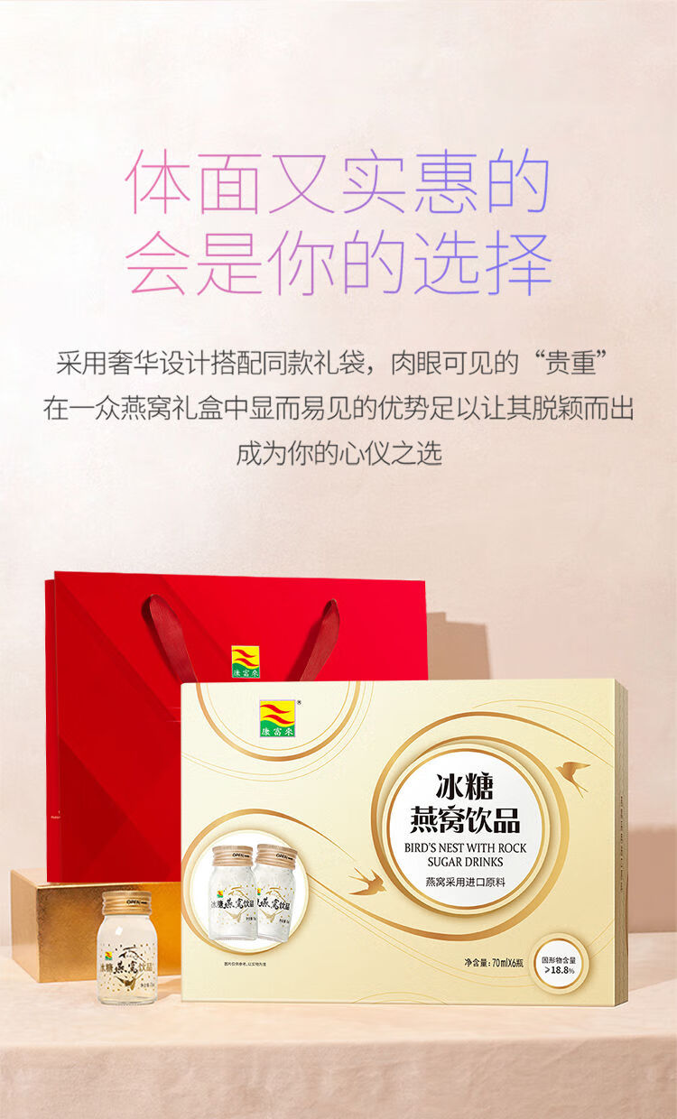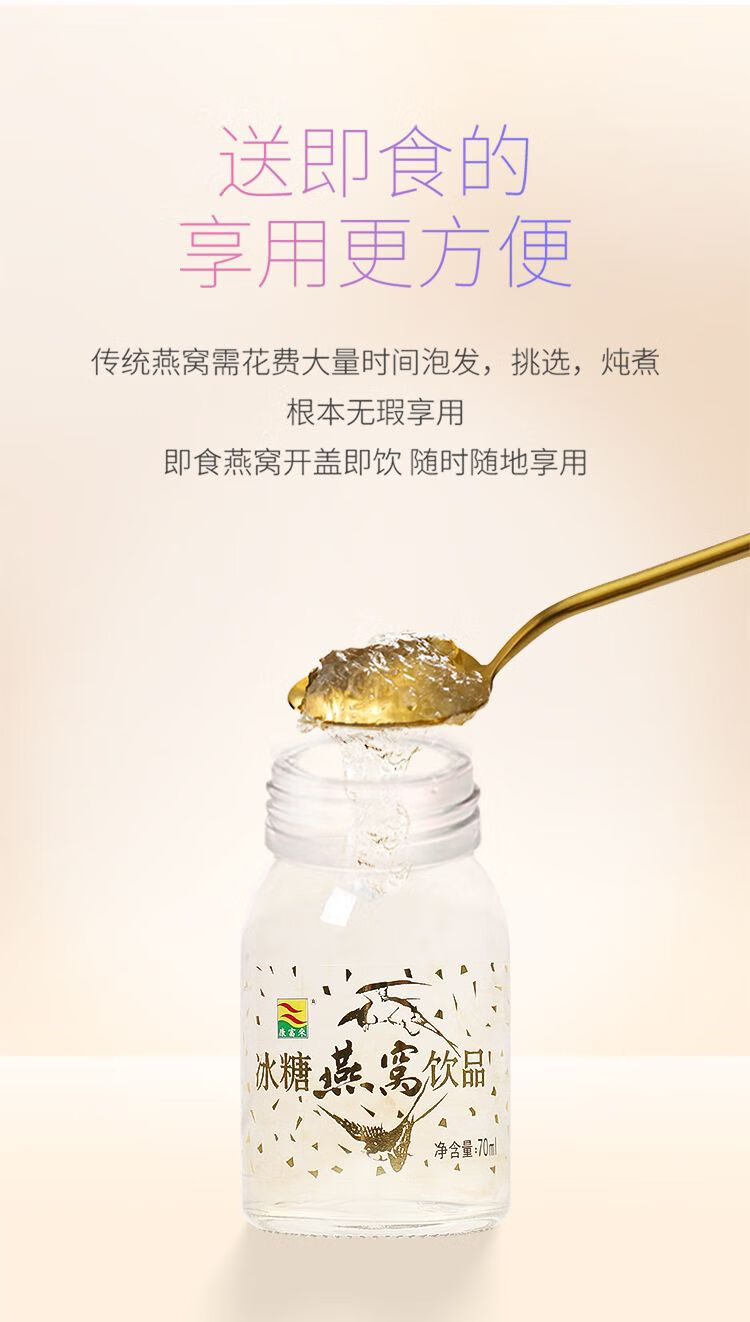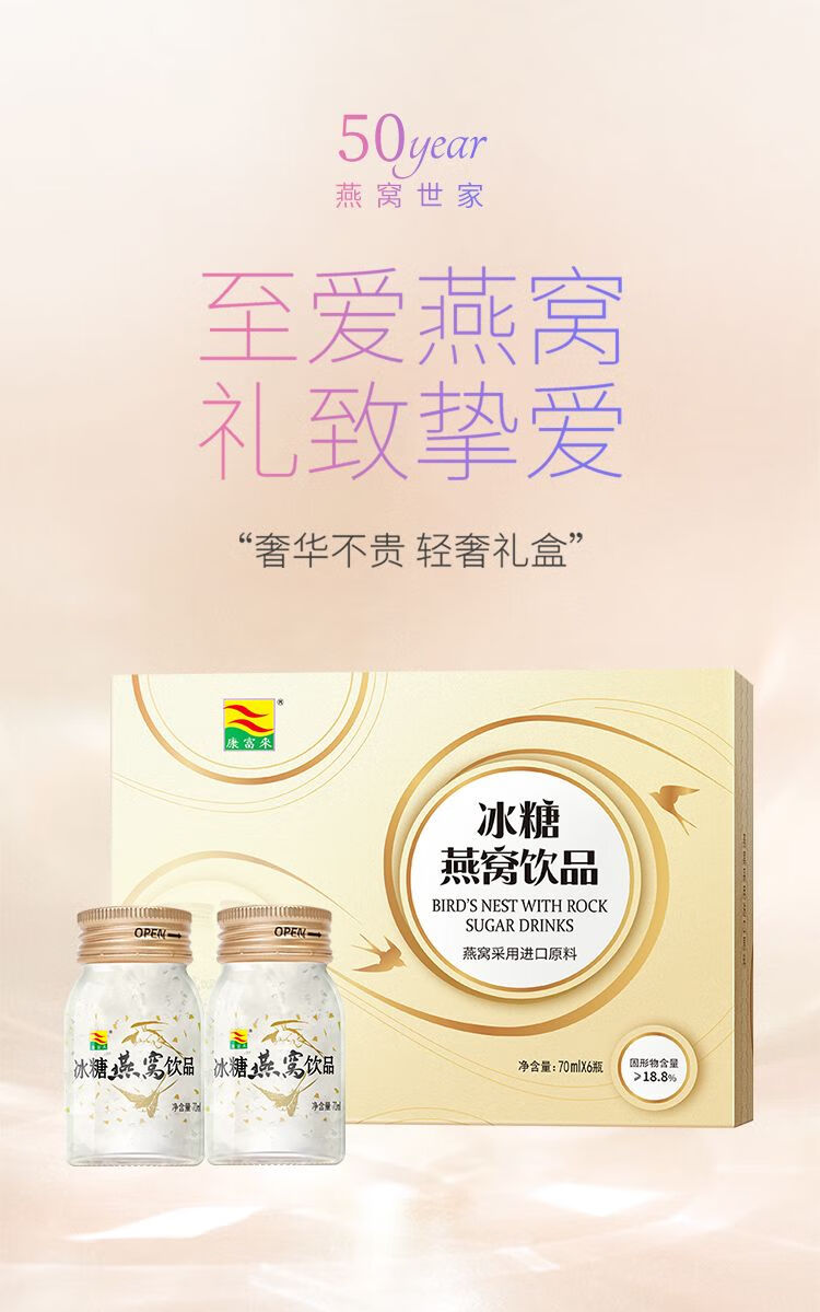 Kangfulai rock sugar bird's nest drink Kangfulai Yipin rock sugar bird's nest drink ready-to-eat bird's nest for pregnant women holiday gift Dragon Boat Festival gift 70ml*6 bottles value gift box