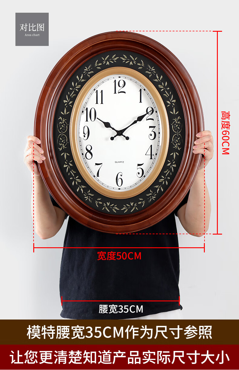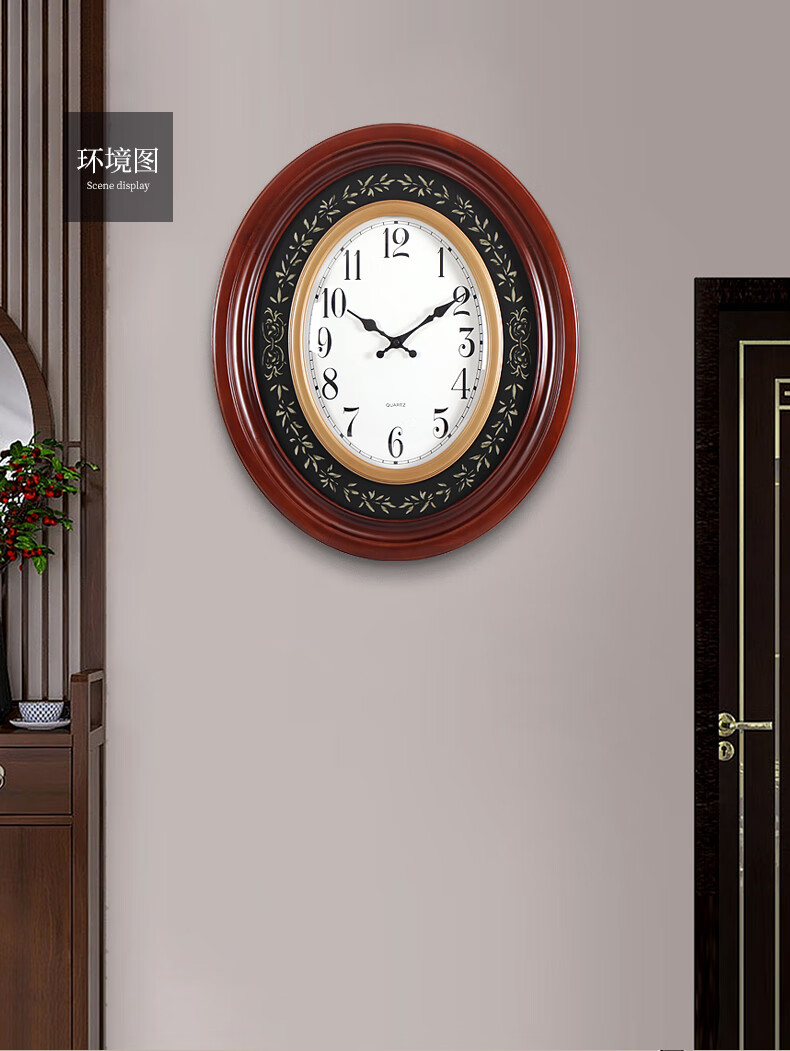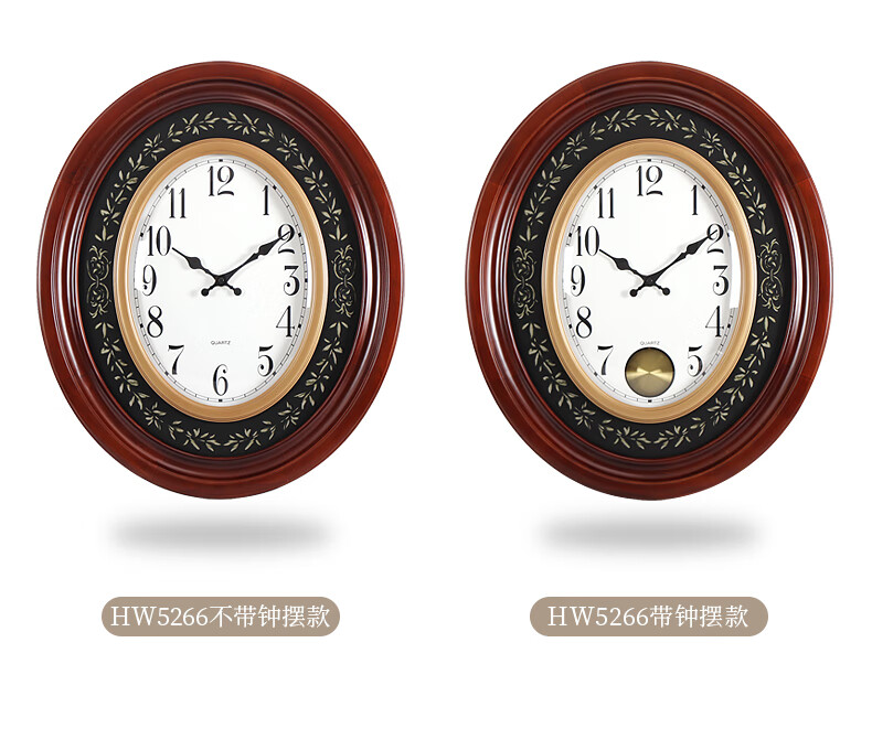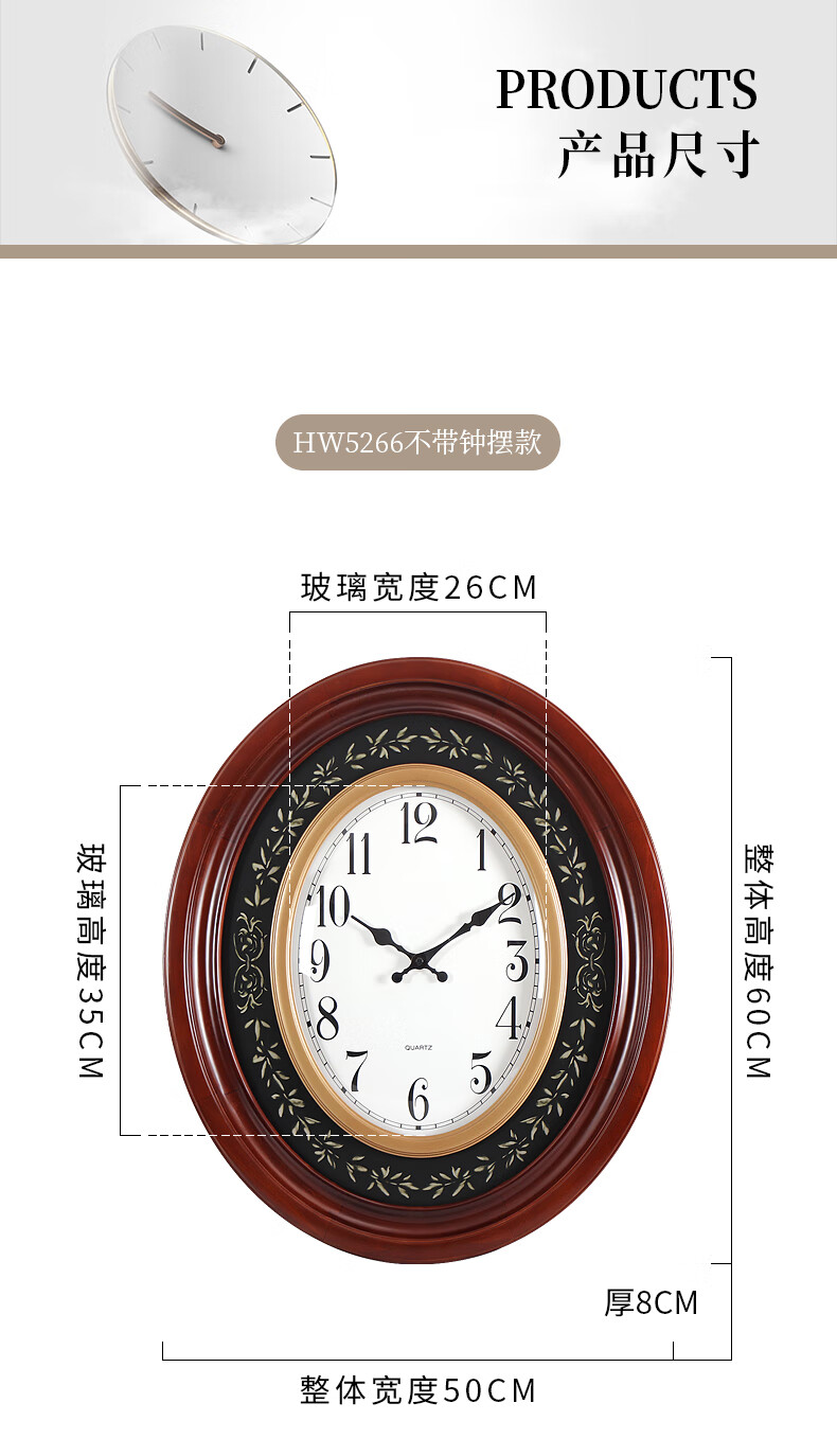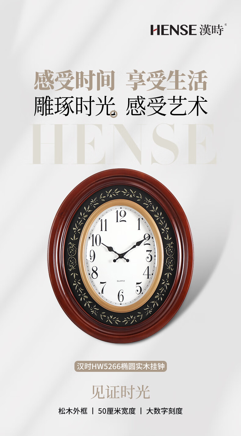 汉时(Hense)大尺寸椭圆实木挂钟客厅大堂挂墙时钟欧式高档大气石英钟表HW5266 带摇摆(高度60CM)
