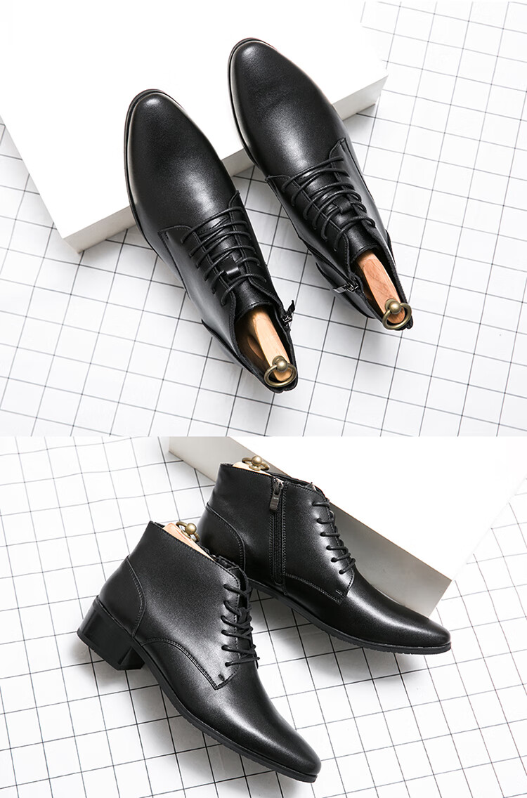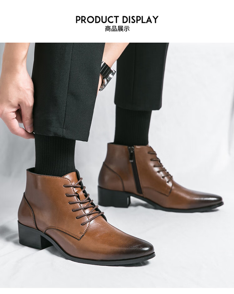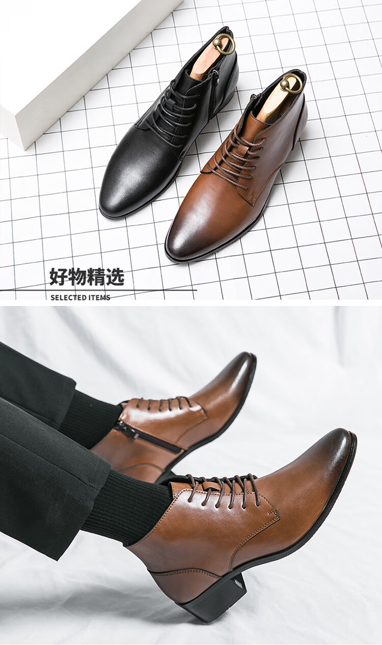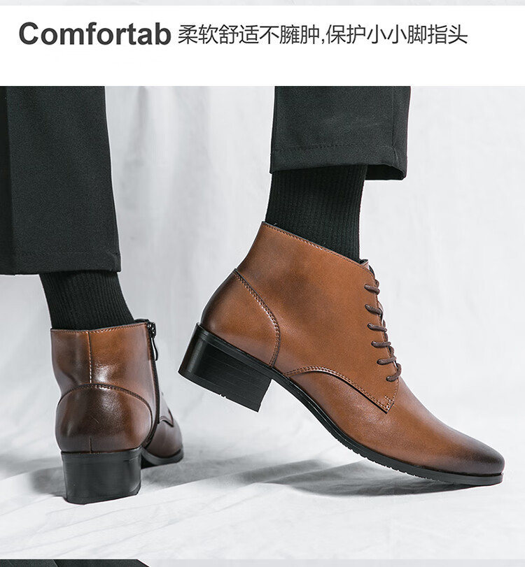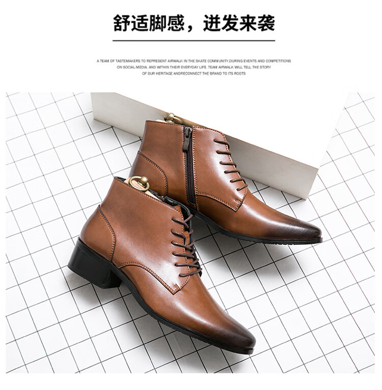 啄木鸟真皮马丁靴男韩版英伦商务内增高中帮高跟尖头发型师皮鞋高帮皮靴 2232棕色 42 标准皮鞋码