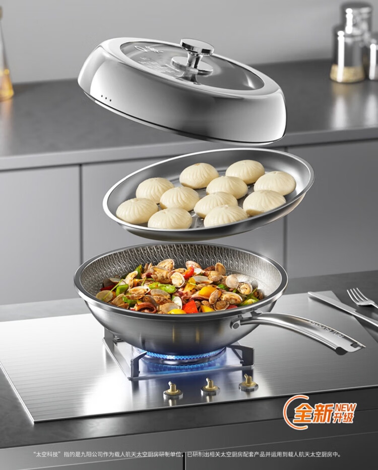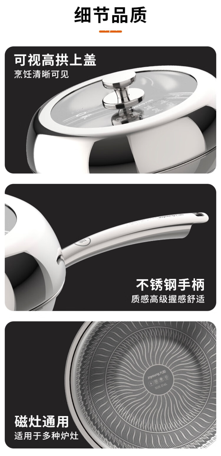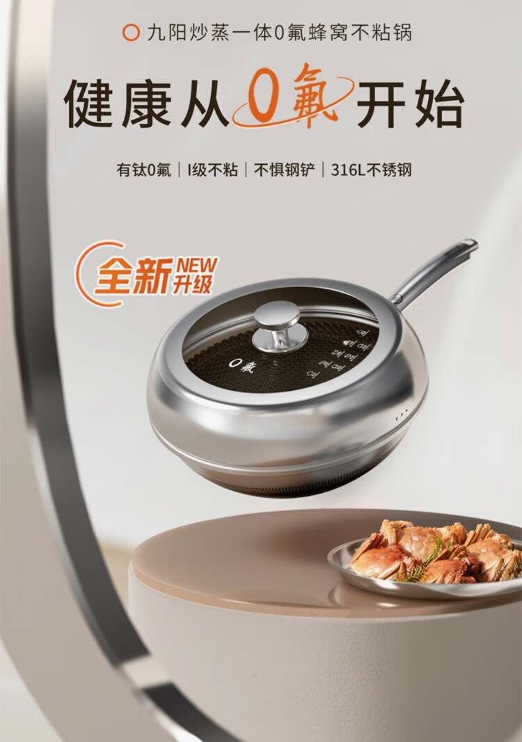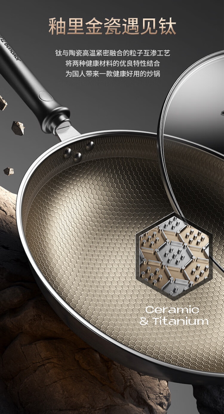 Joyoung C795 non-stick wok 0 fluorine titanium porcelain anti-stick wok 316 flat bottom stainless steel honeycomb induction cooker gas stove CF32-C795 national joint warranty steamer 32cm shopping mall store products