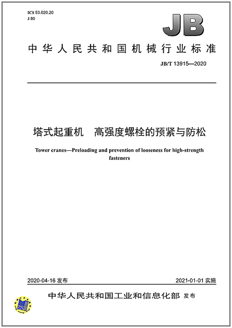 JB/T 13915-2020 塔式起重机 高强度螺栓的预紧与防松 机械行业标准 中国标准出版社 质量标准规范 防伪查询