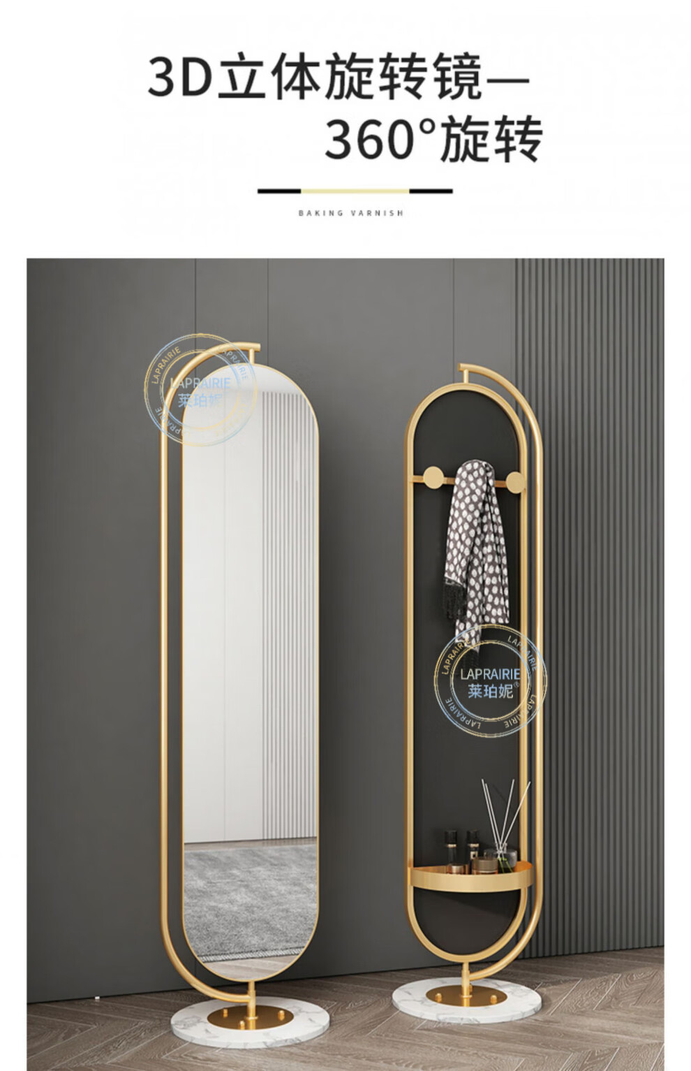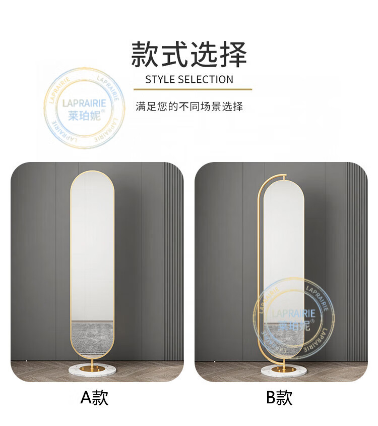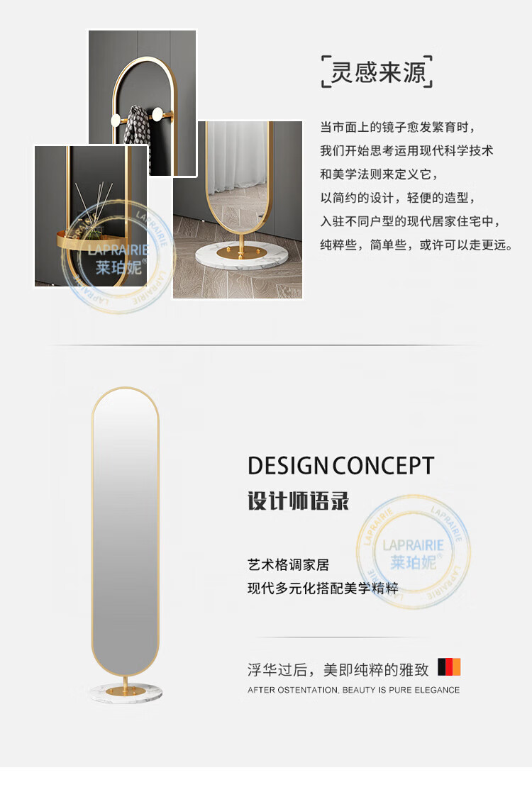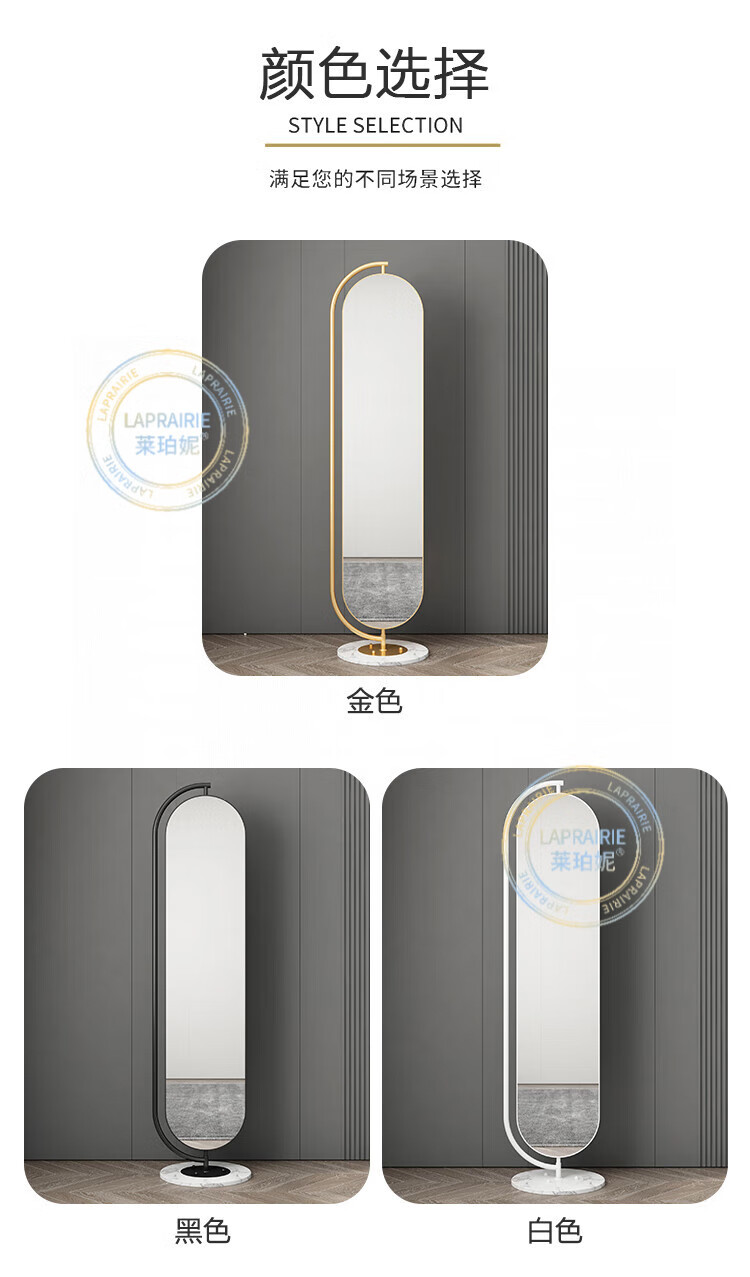 LA PRAIRIE德国品牌 轻奢镜子全身镜穿衣镜家用落地镜女生卧室可旋转试衣镜 大号旋转镜(金架+白石)带收纳 免费上门安装