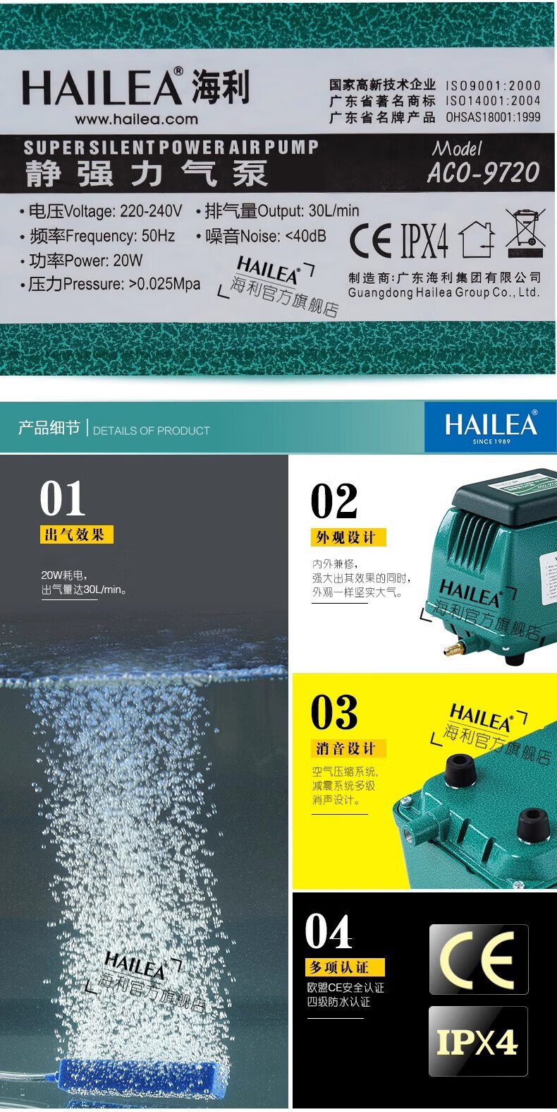 海利ACO97209730氧气泵超大功率养鱼池防雨水氧增氧 9720 20W 单机