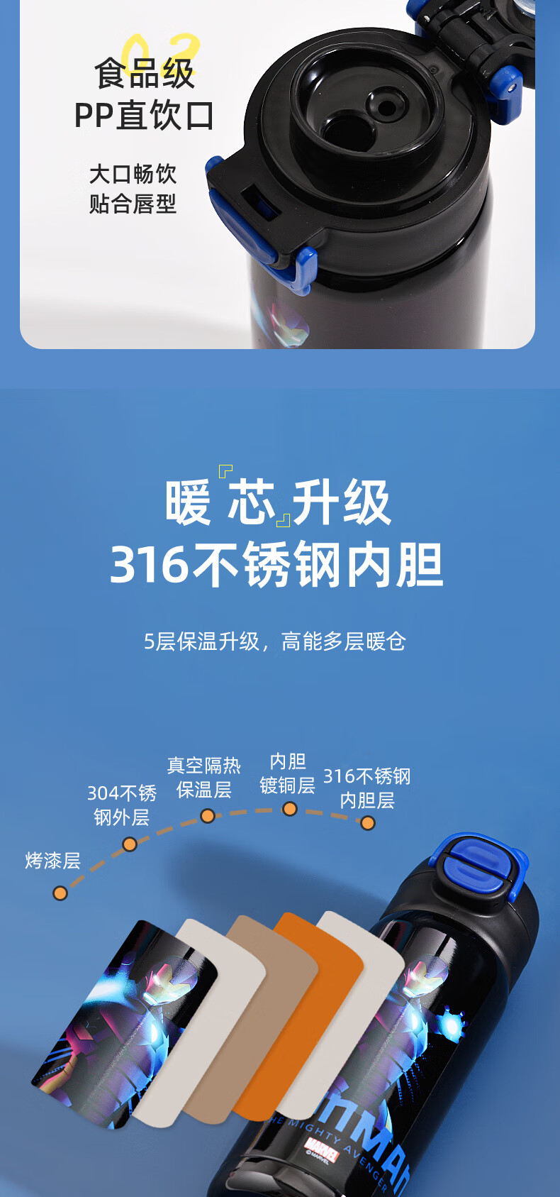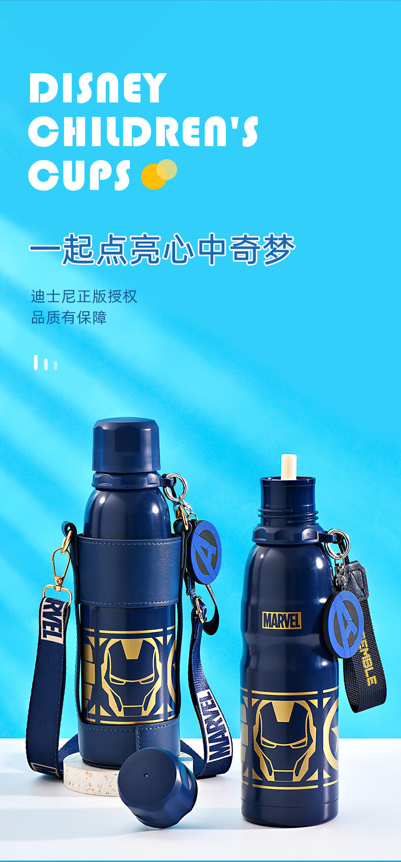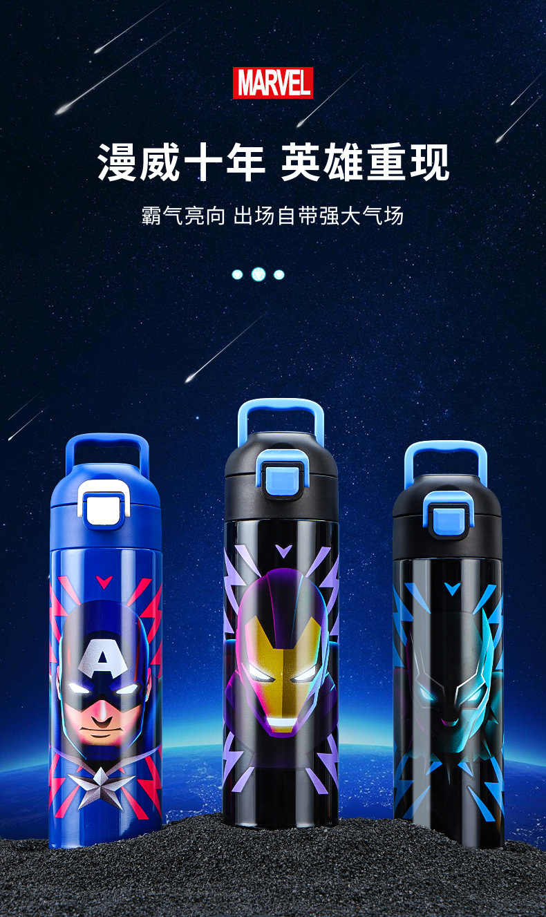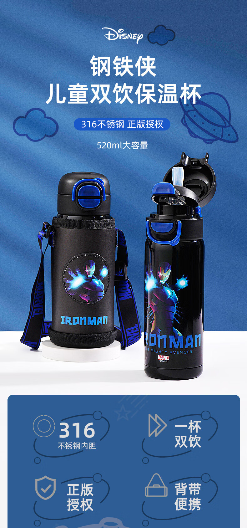 Детский термос Disney (Disney) для детей 3-6-12 лет для школы, 316 детей мужского и женского пола, термос с двойной соломинкой, улучшенный тип двойного напитка + рукав для чашки, 520 мл, Iron Man 6296, нержавеющая сталь 316