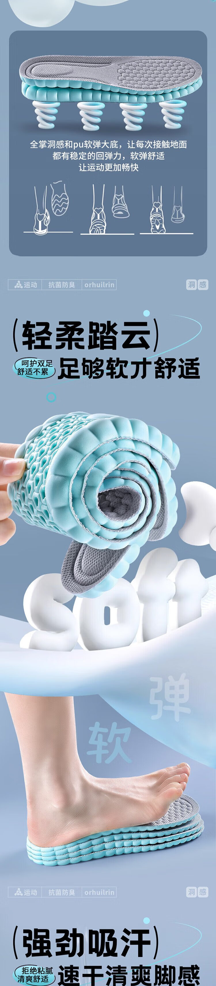 Rich and young children 2 pairs of super soft 4D shit-stepping feeling insoles for men, soft elastic insoles for long-term sports, shock absorption, non-slip, breathable, sweat-absorbent and anti-odor, blue and gray, 2 pairs, thickened shock absorption/anti-foot pain, size 4142, can be cut to fit better