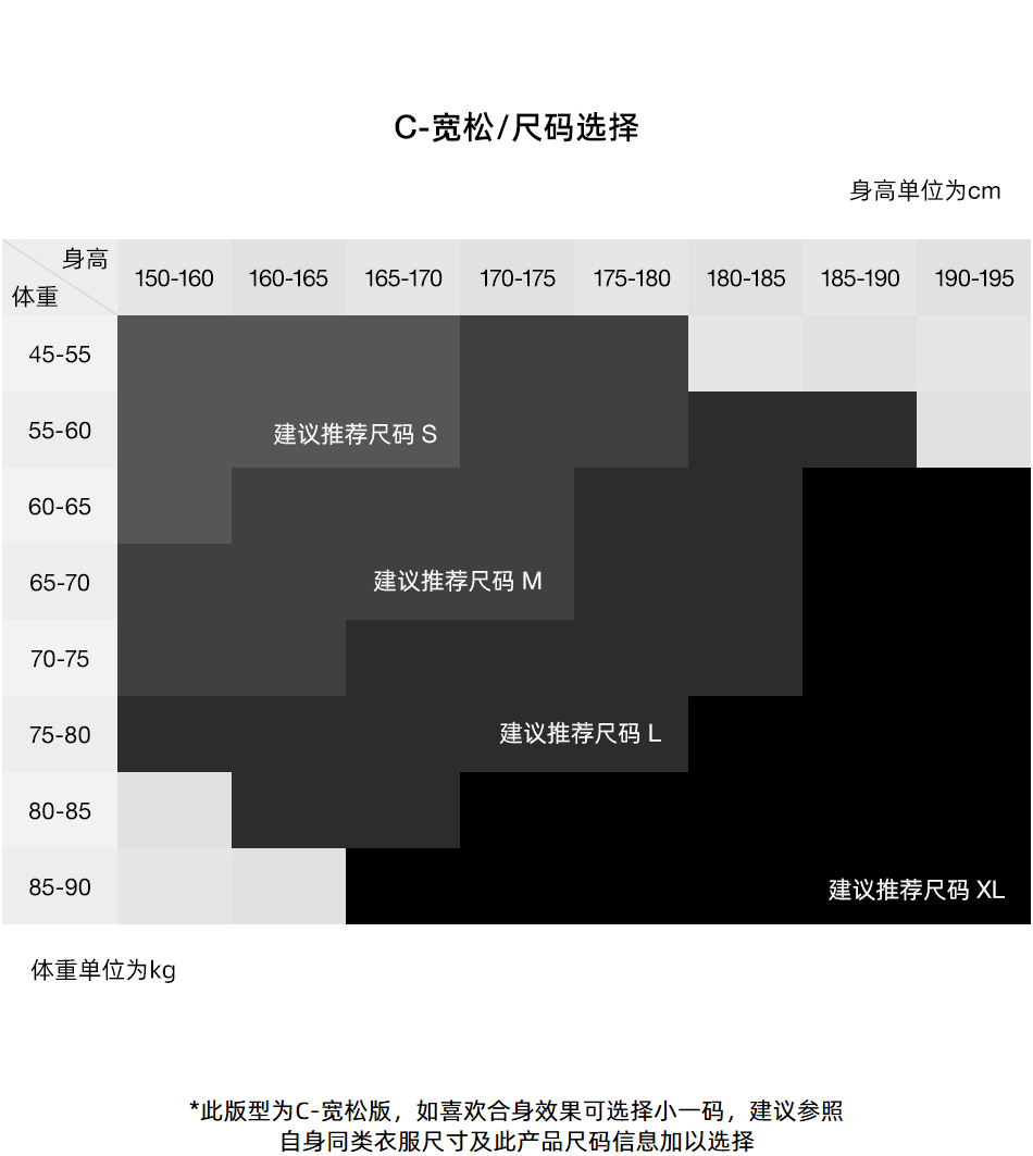 China (cm) 160-165/84-86 165-170 / 88-90 167-172 / 92-96 168-173 / 98-102 170-176 / 106-110