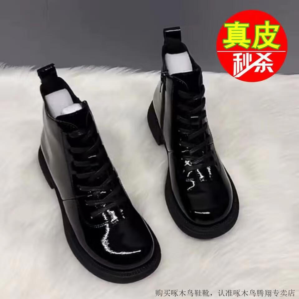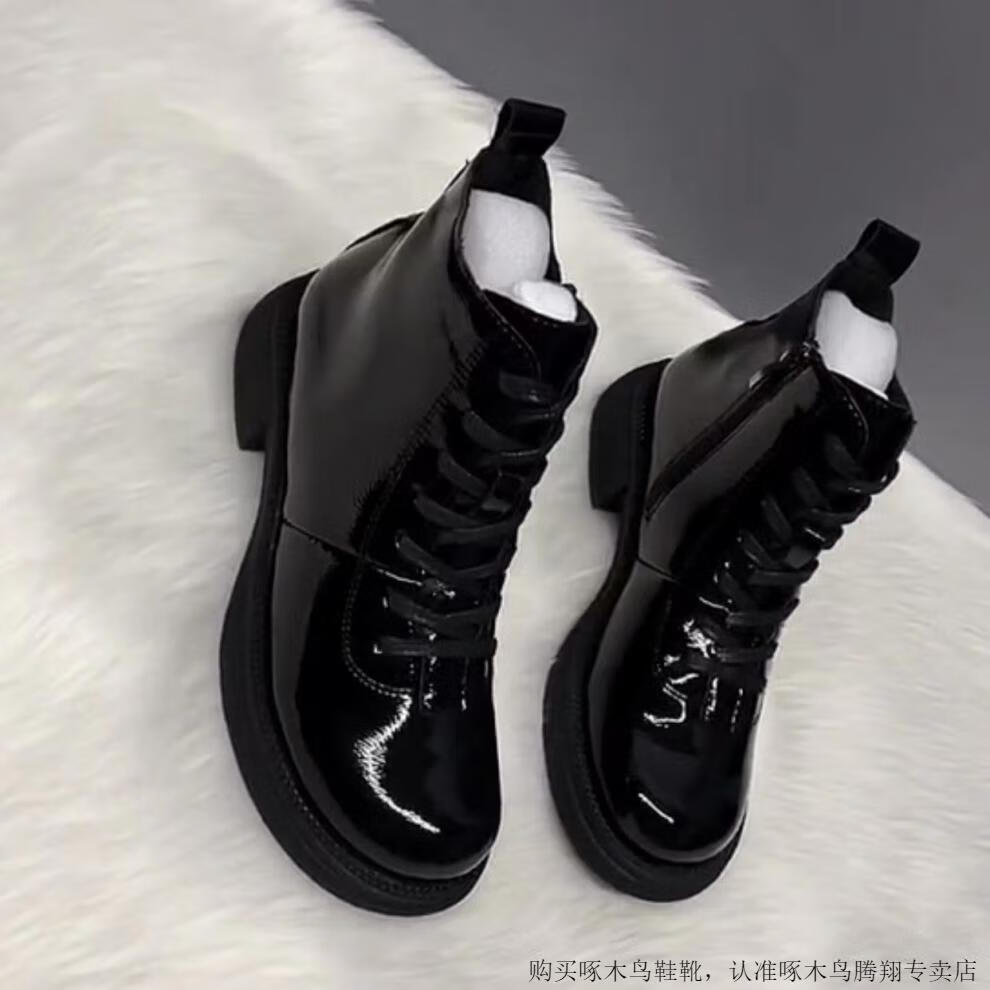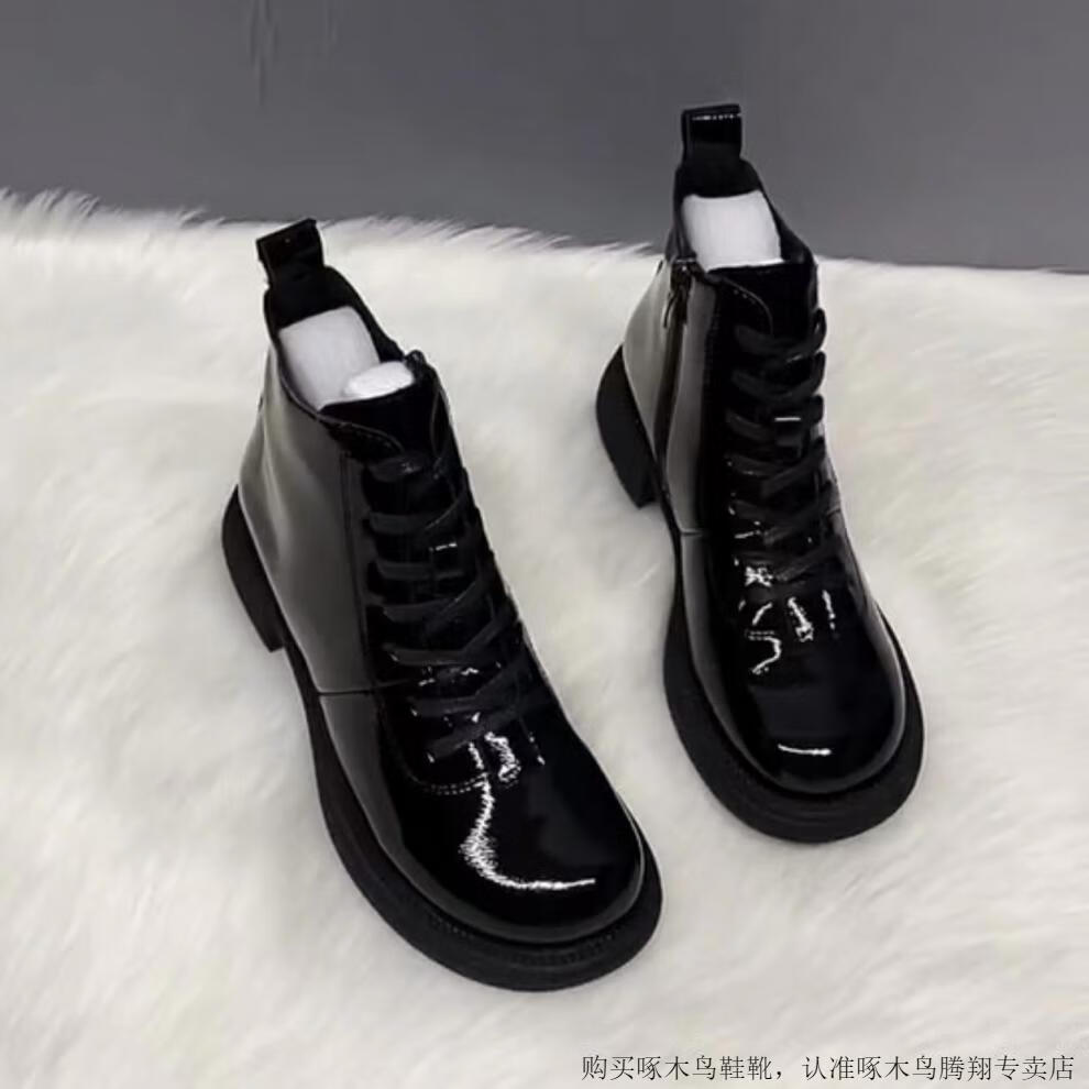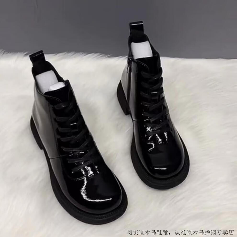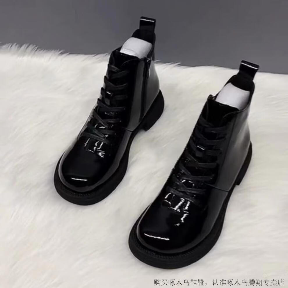 Woodpecker genuine leather thick heel short boots for women 2025 winter fashion patent leather lace-up Martin boots for women warm snow boots for women black plus velvet 36