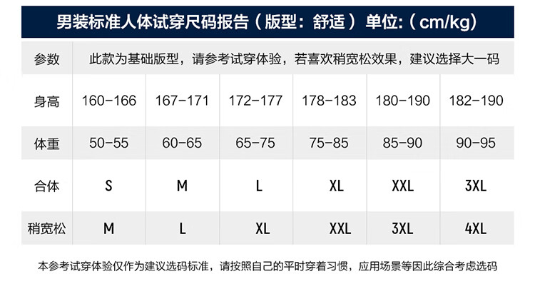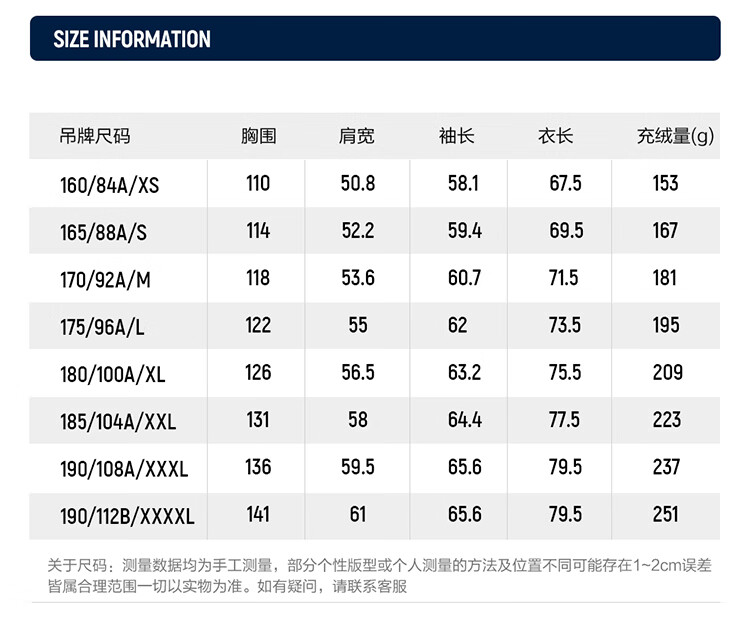 China (cm) 165 / 88-90 170 / 96-98 175 / 108-110 180 / 118-122 185 / 126-130