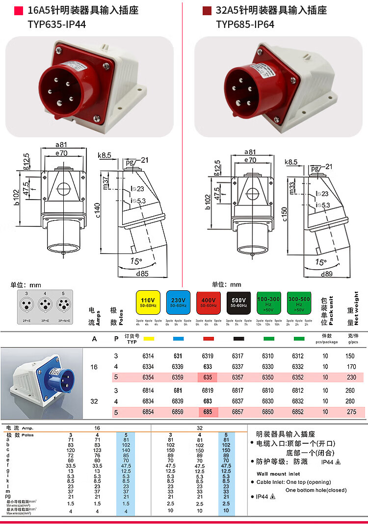 威浦工业插头插座TYP235公母连接器16A32A5芯明/暗装/移动TYP285 16A5芯暗装直座 16A5芯套装TYP235 TYP6623
