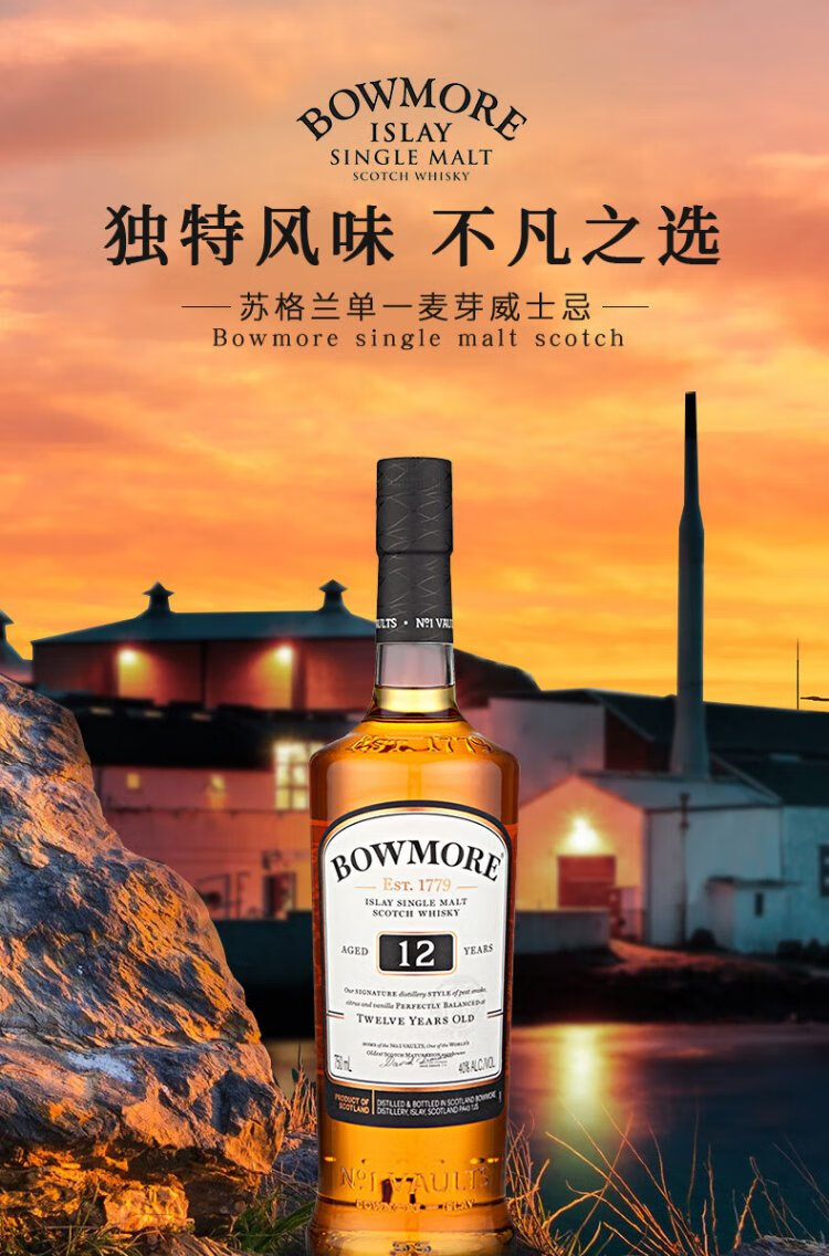 Bowmore Single Malt Scotch Whisky, ausländischer Wein, Produktionsgebiet Islay, Originalflasche importiert, Verpackung fleckig – Bowmore 12 Jahre 700 ml