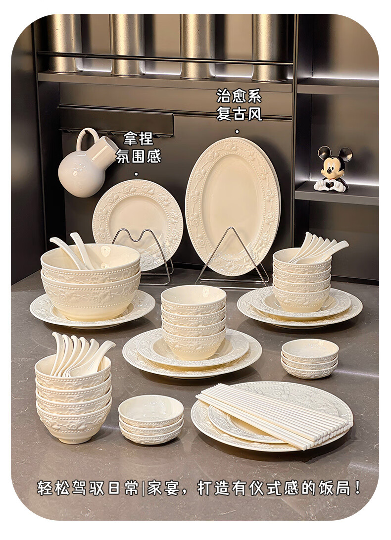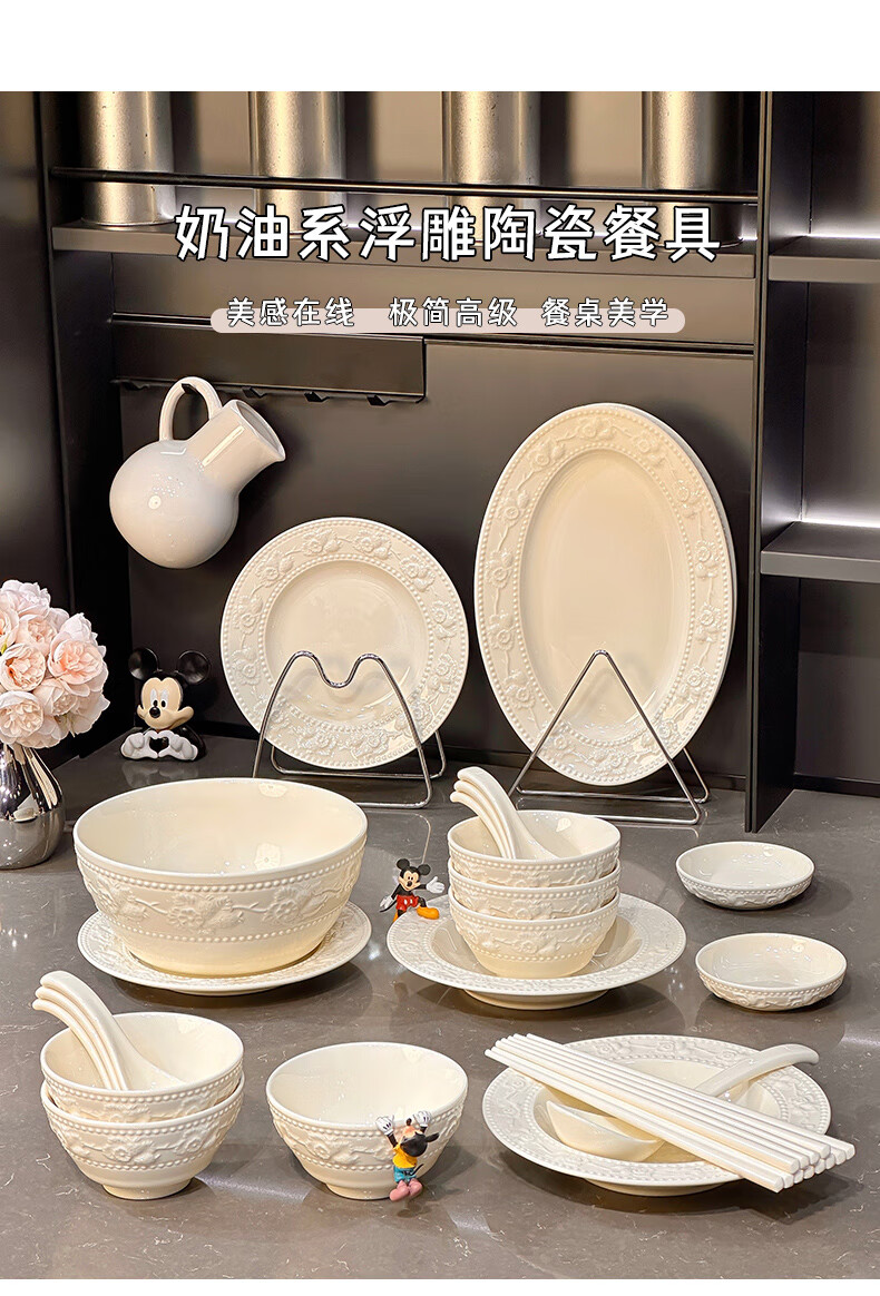 Xibaisheng high-end bowls, plates and tableware underglaze color household high-value rice bowls and plates complete set of housewarming dishes and chopsticks set Microwave oven suitable for 12 people, 56-piece set 1592