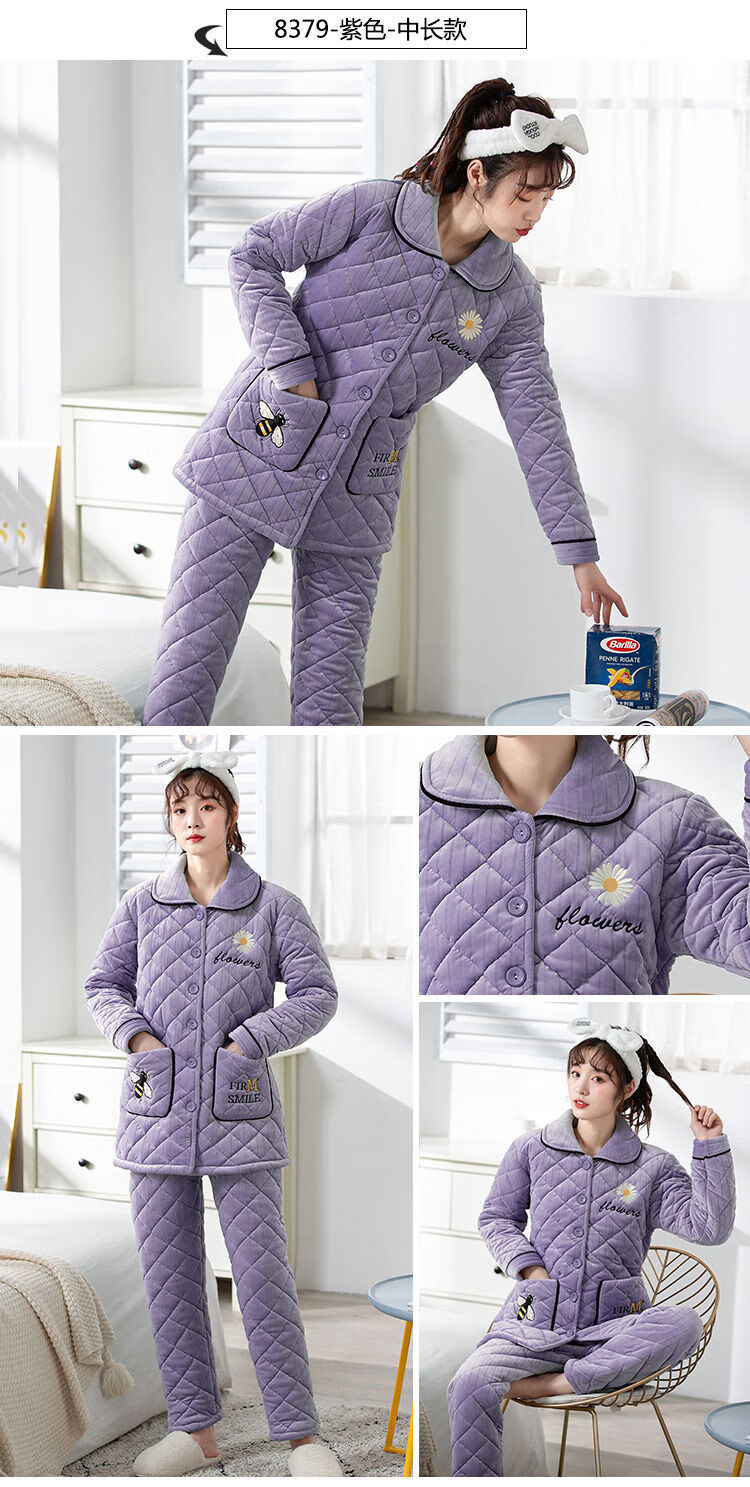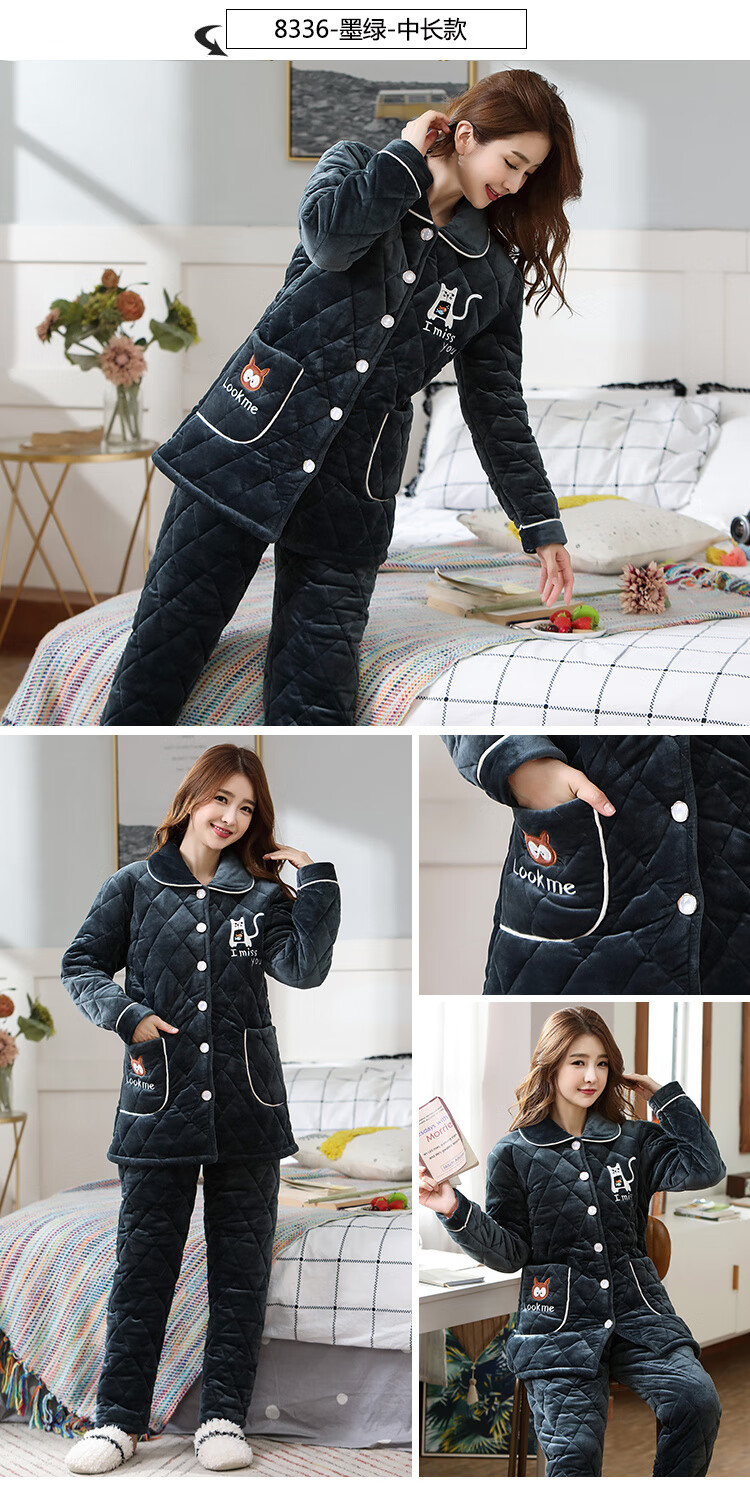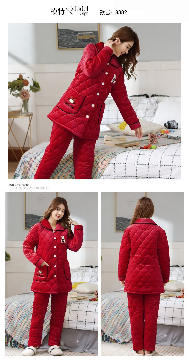 浪莎(LangSha)睡衣女冬季加厚加绒珊瑚绒三层夹棉保暖秋冬法兰绒女士家居服套装 H18 L6625深蓝玫瑰加长款 M 80-斤