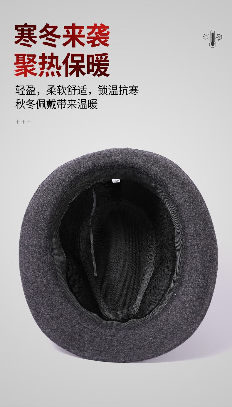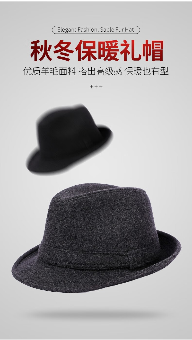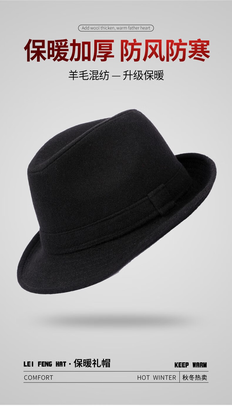 万宏达帽子男士秋冬季羊毛礼帽中老年人英伦风爵士帽冬天保暖老人绅士帽 经典黑色