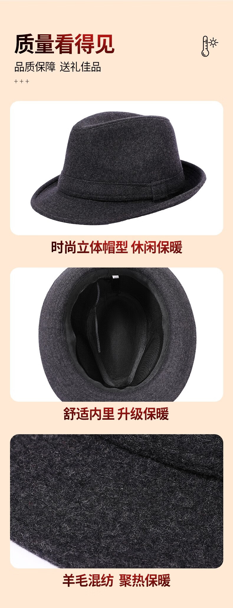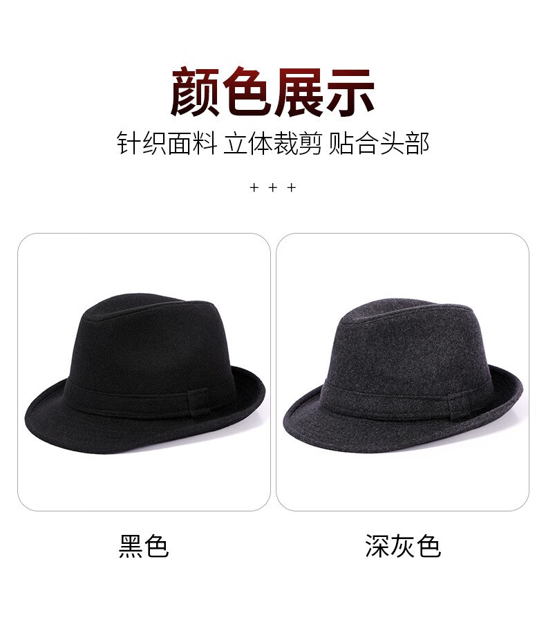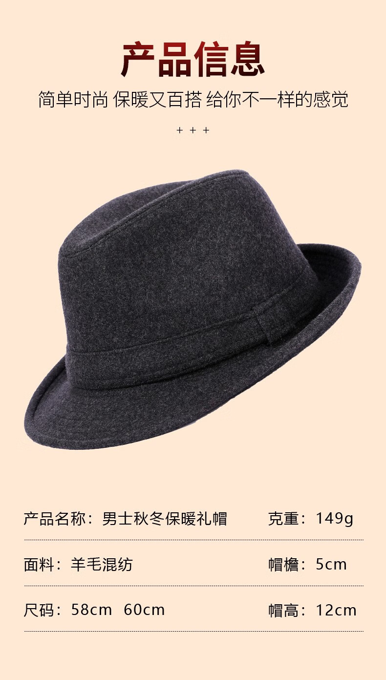 万宏达帽子男士秋冬季羊毛礼帽中老年人英伦风爵士帽冬天保暖老人绅士帽 经典黑色
