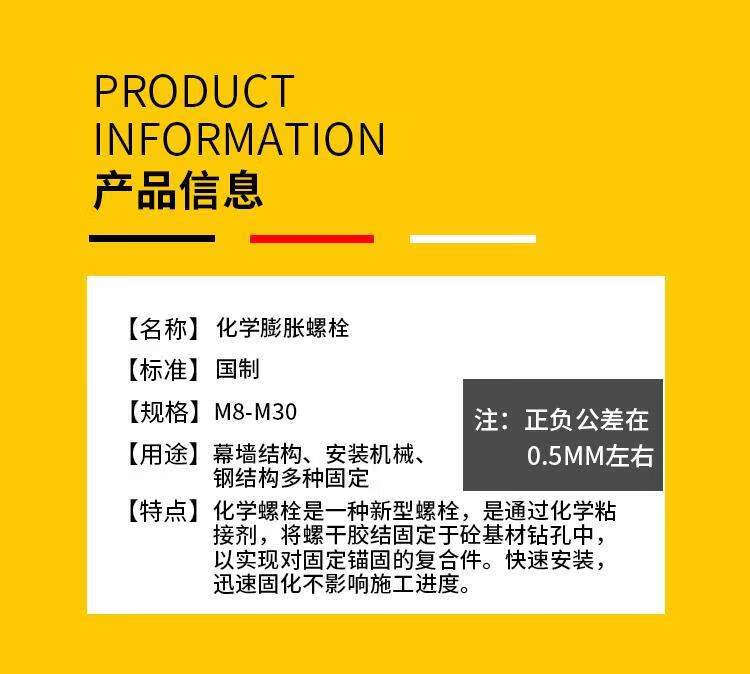 Maßgeschneiderter chemischer Anker von Huili, hochfester chemischer Bolzen der Güteklasse 8,8 M8M10M12M14M16M18, verlängerte chemische Expansionsschraube der Güteklasse 58 M12250 (1 Satz enthält Medikamente)
