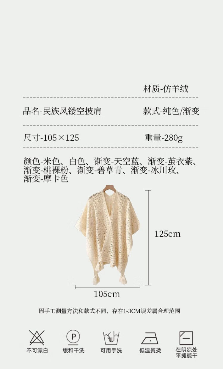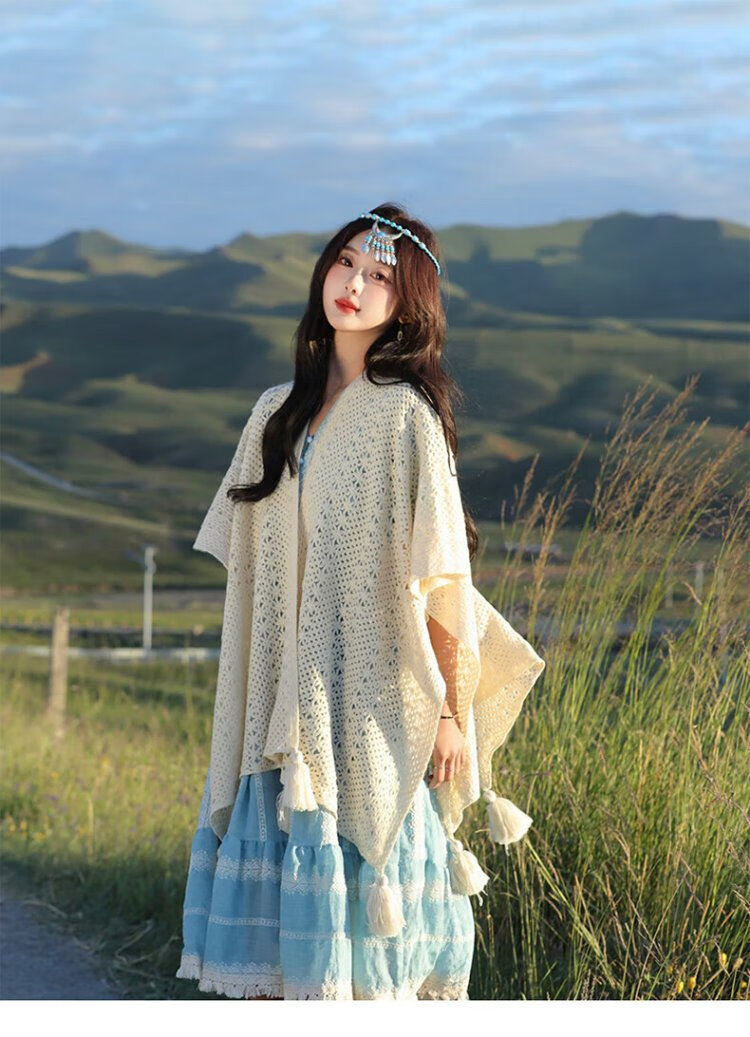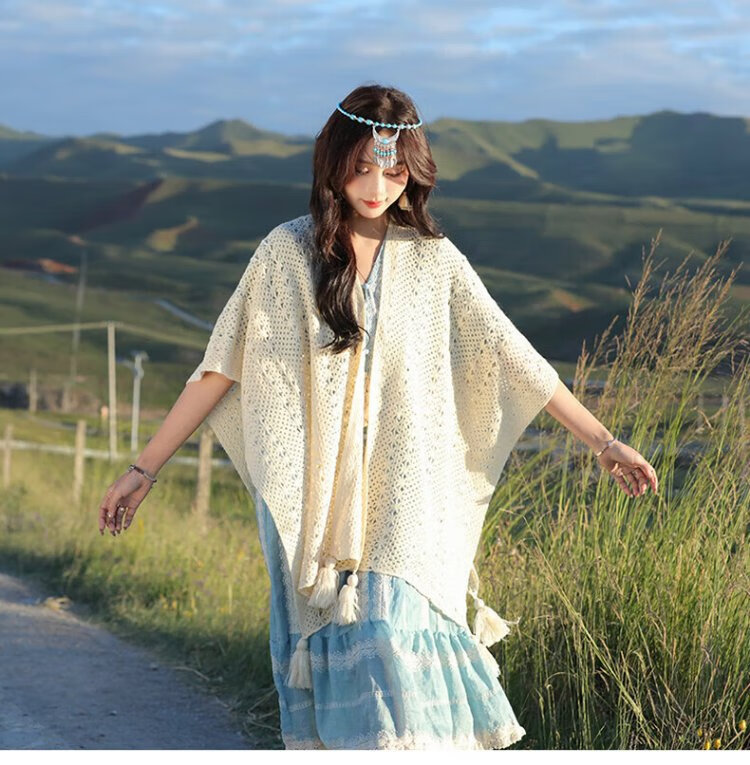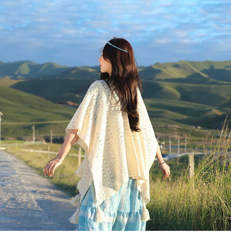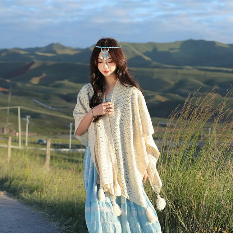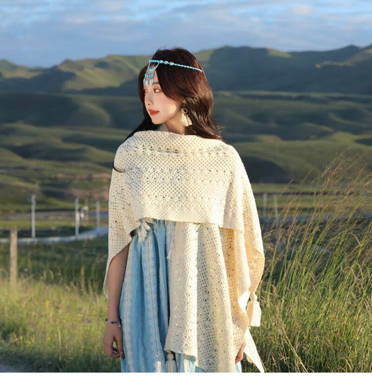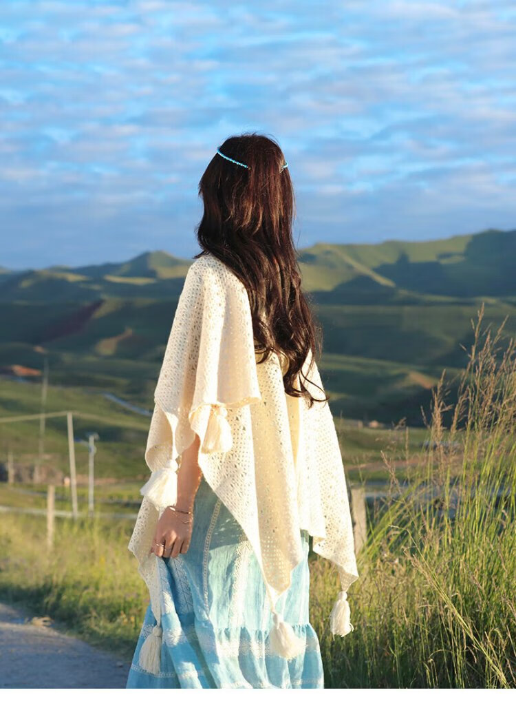 Oein Yunnan ethnic style shawl women's outer wear 2024 scarf women's northwest travel grassland wear shawl shawl blanket QC beige hollow flower tassel shawl
