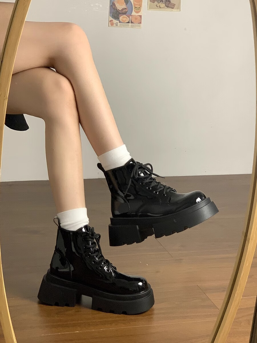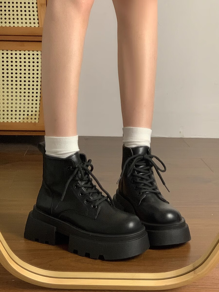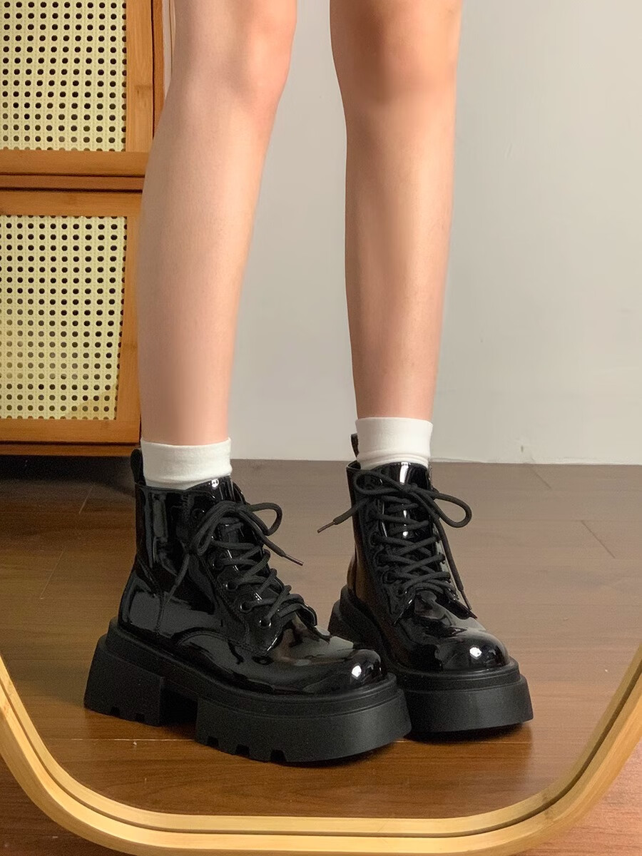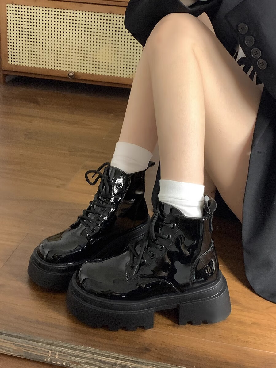 康姿蝶黑色马丁靴女2025秋季新款英伦风厚底增高复古百搭显瘦短靴子女 黑色亮光 37