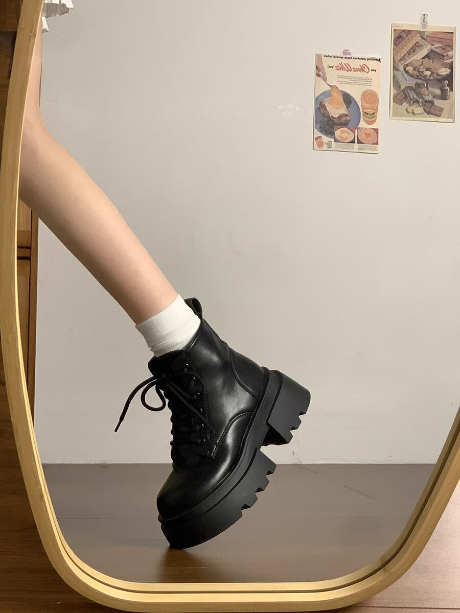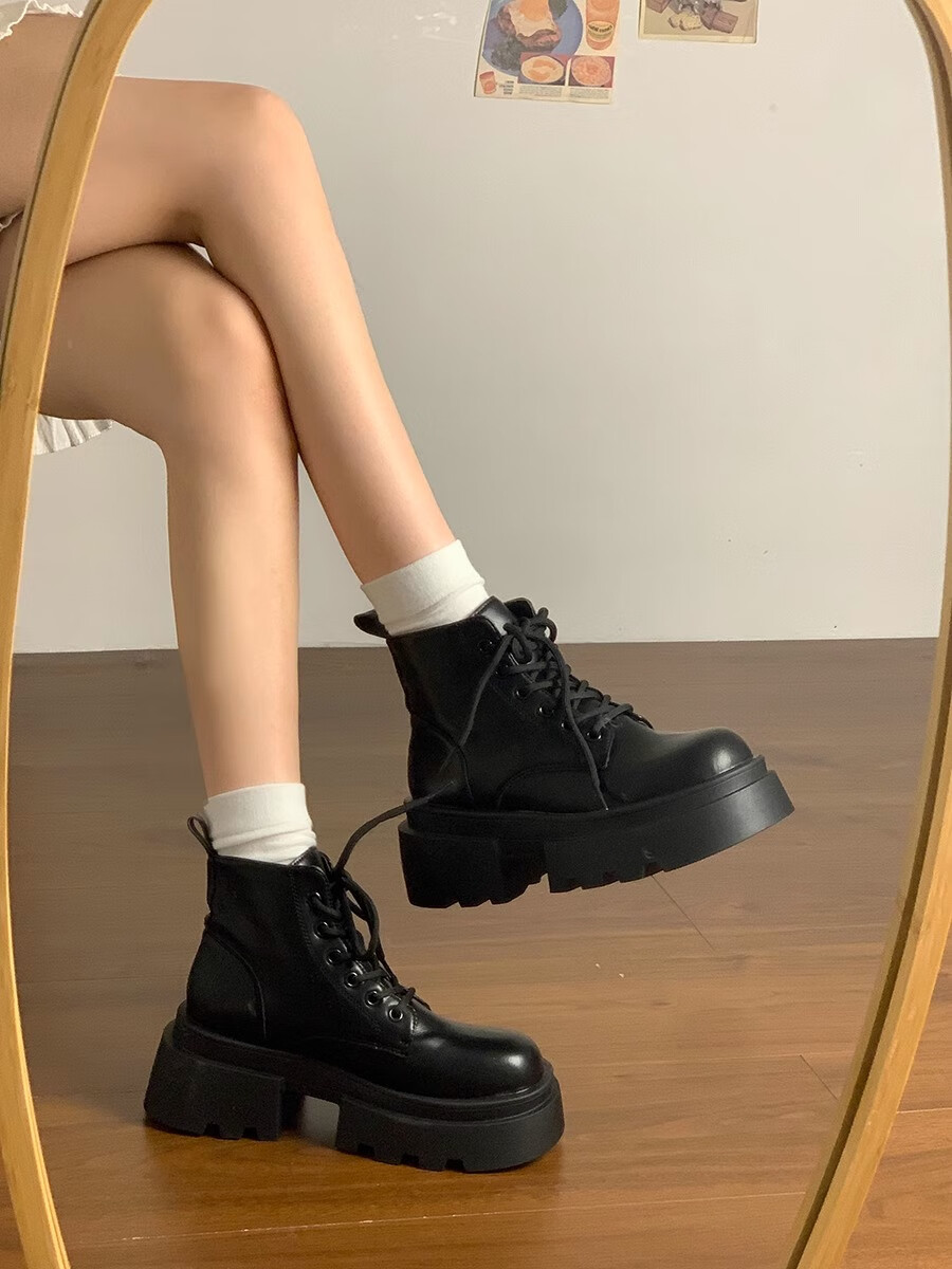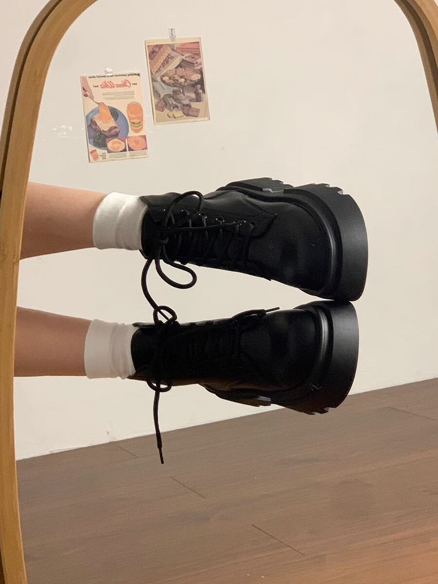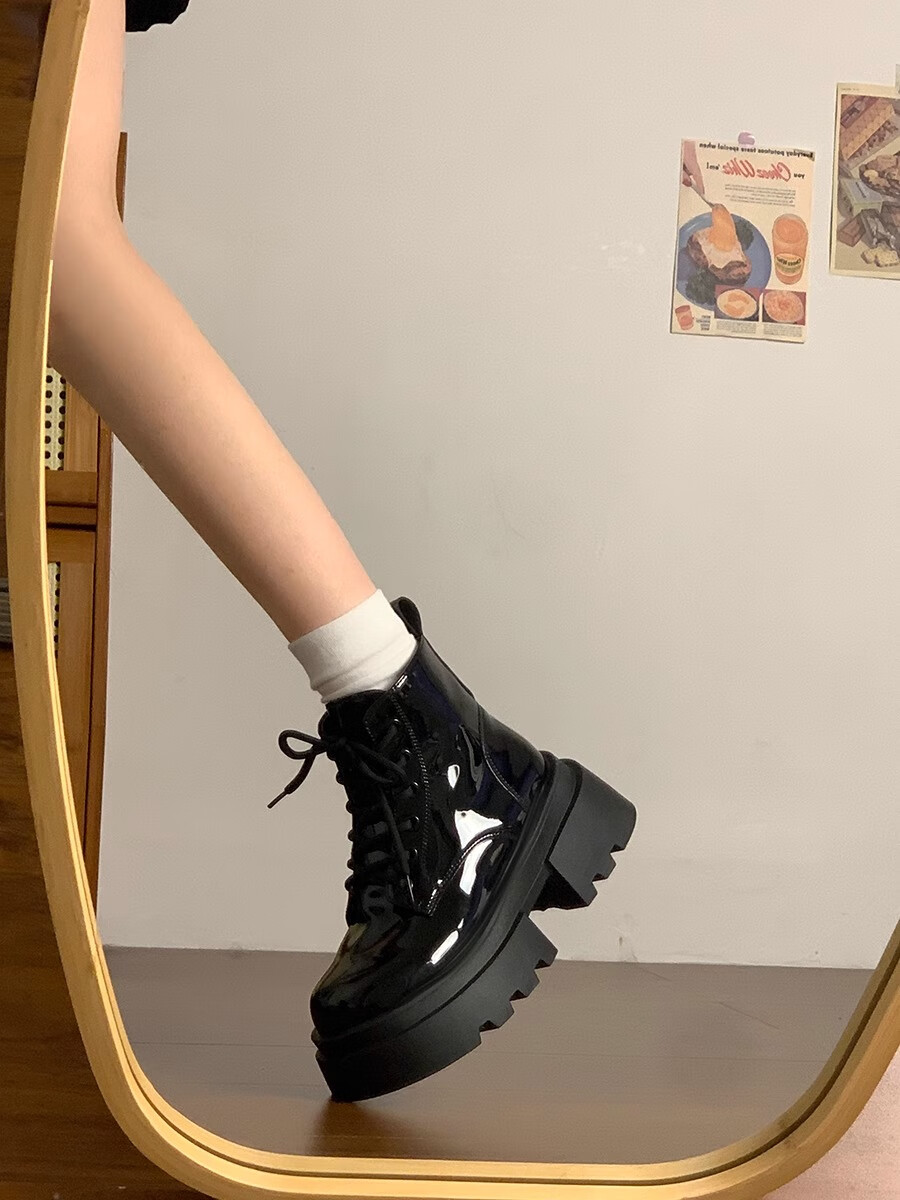 康姿蝶黑色马丁靴女2025秋季新款英伦风厚底增高复古百搭显瘦短靴子女 黑色亮光 37