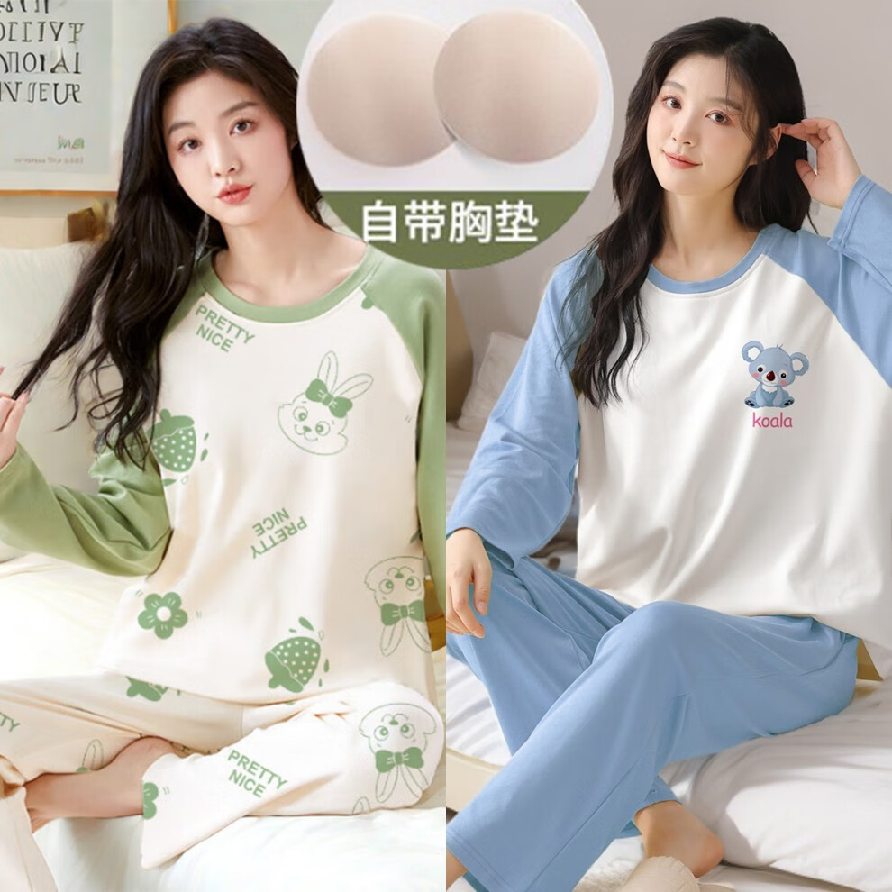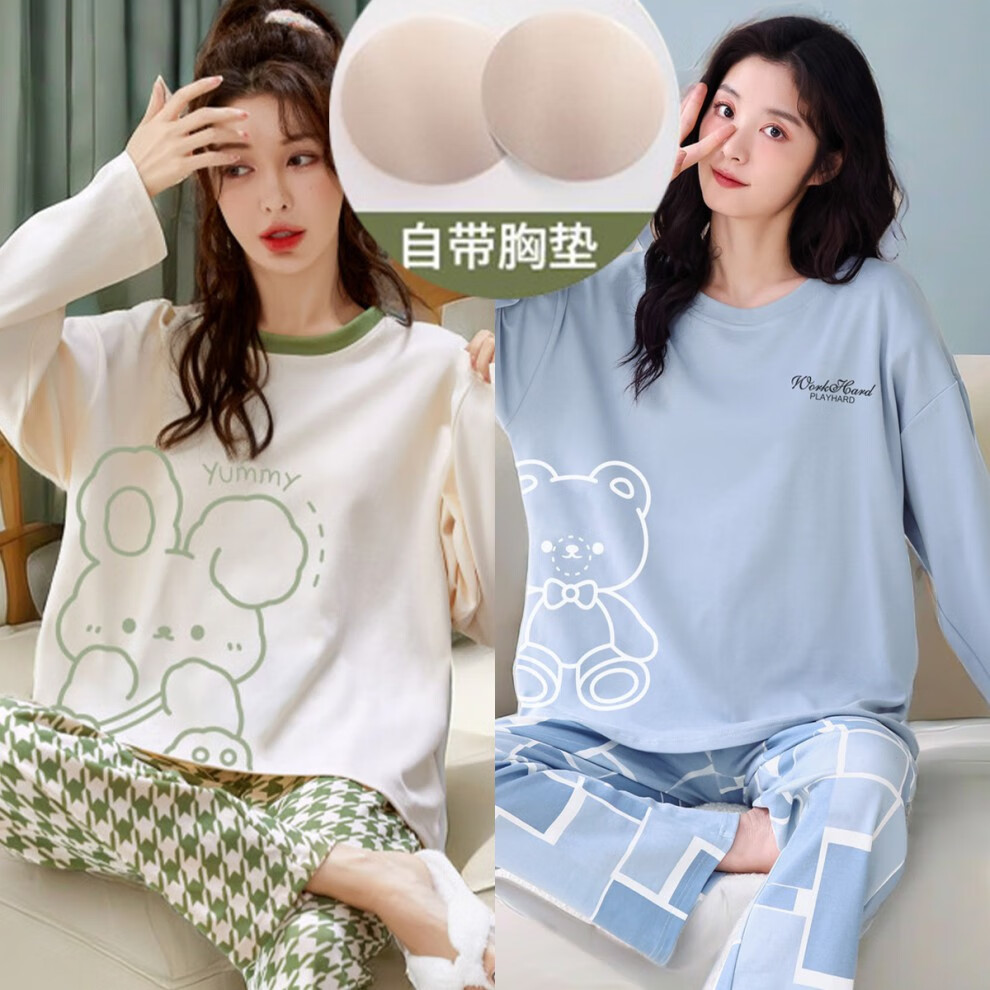 浪莎(LangSha)秋冬新款纯棉女带胸垫长袖长裤套装罩杯一体家居服休闲两件套睡衣 双长带胸垫:XD兔1105 发货一套 L码(90-105斤)