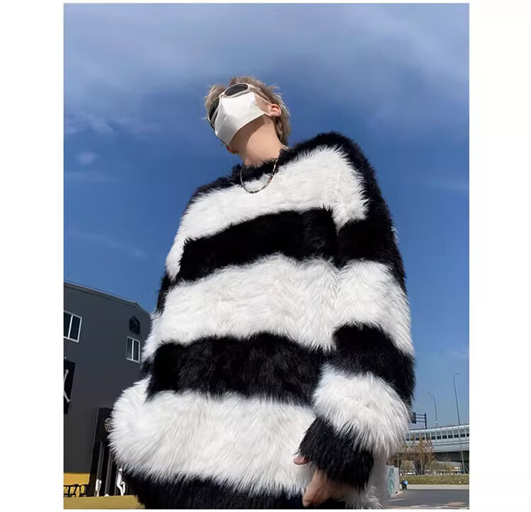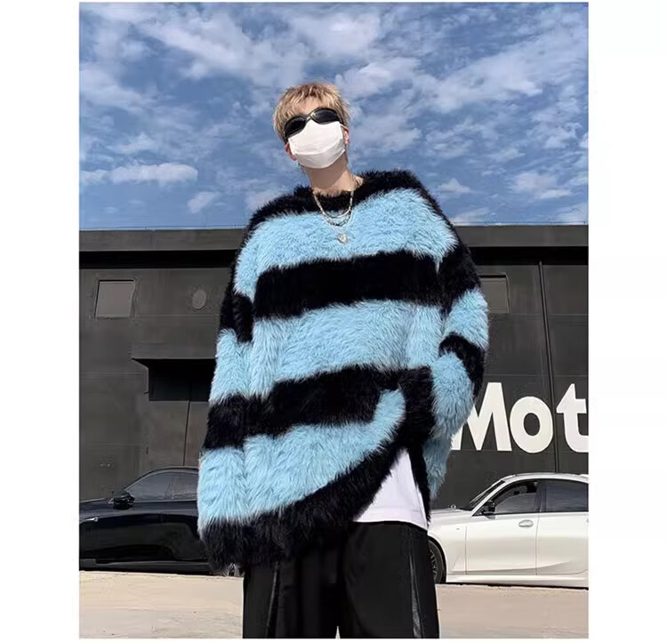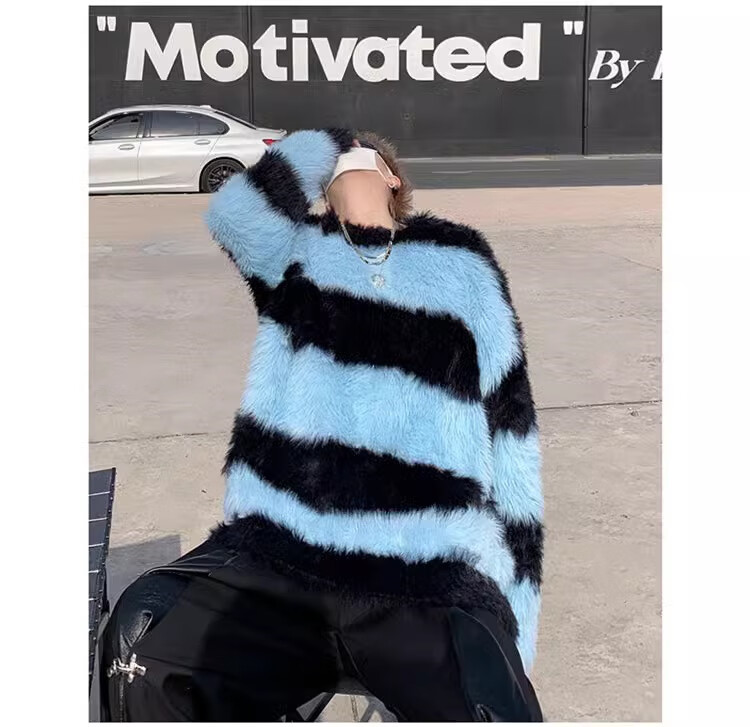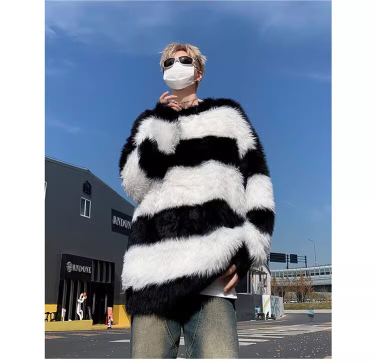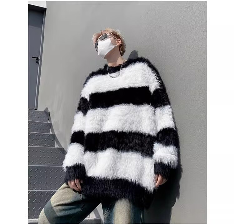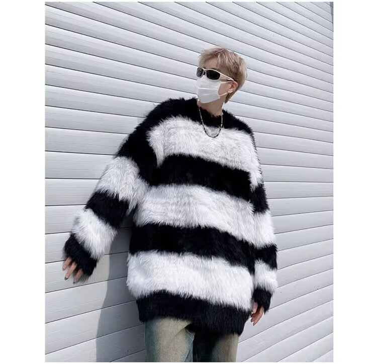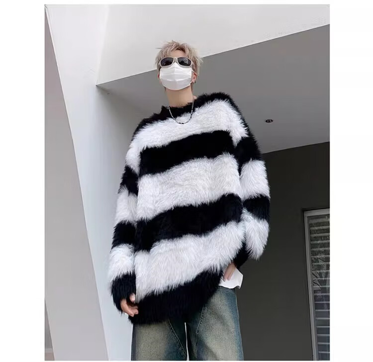 7家优品秋冬水貂绒条纹毛衣男圆领套头休闲潮牌韩系学生百搭青少年针织衫 XCS-7174白色 XL