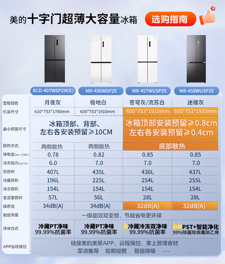 Midea 753mm wide 407/457/459 cross-door four-door 60cm ultra-thin zero-embedded first-level energy efficiency air-cooled frost-free and odor-free large-capacity household refrigerator MR-457WUSPZE Sky Gray