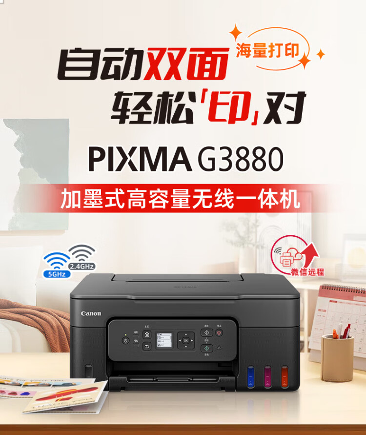 佳能新品G3880自动双面墨仓式黑彩可加墨打印机复印扫描一体机办公学生家用小型手机无线A4资料作  G3880黑色【无线远程+自动双面+打印复印扫描】 套餐二:官方标配+黑色原装墨水2瓶 +大礼包