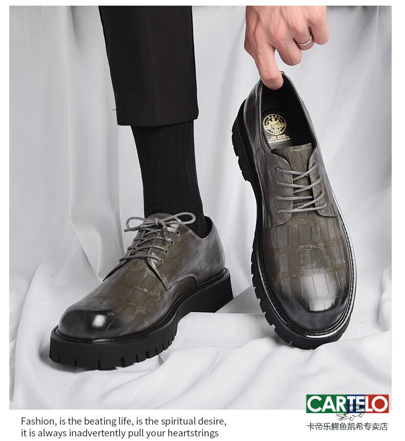 卡帝乐鳄鱼(CARTELO)皮鞋男款德比男士休闲商务工装时尚潮流布洛克厚底低帮大头马丁靴 黑色6625 四季款 41 标准皮鞋码